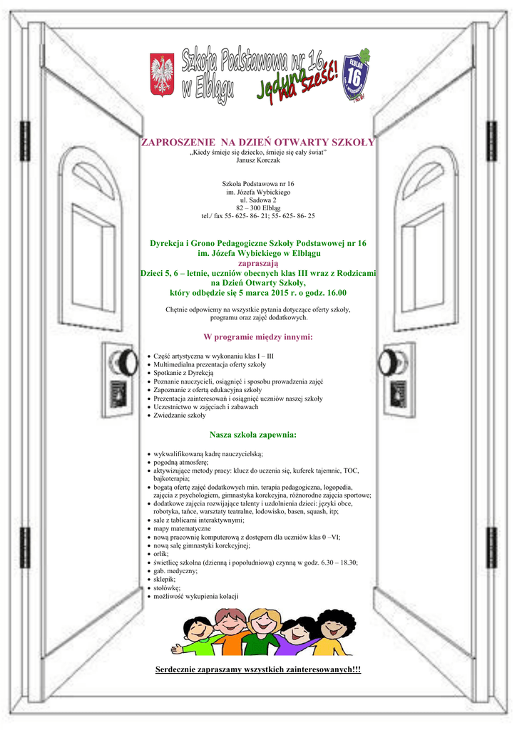 ZAPROSZENIE NA DZIEŃ OTWARTY SZKOŁY „Kiedy śmieje się dziecko, śmieje się cały świat” Janusz Korczak Szkoła Podstawowa nr 16 im. Józefa Wybickiego ul. Sadowa 2 82 – 300 Elbląg tel./ fax 55- 625- 86- 21; 55- 625- 86- 25 Dyrekcja i Grono Pedagogiczne Szkoły Podstawowej nr 16 im. Józefa Wybickiego w Elblągu zapraszają Dzieci 5, 6 – letnie, uczniów obecnych klas III wraz z Rodzicami na Dzień Otwarty Szkoły, który odbędzie się 5 marca 2015 r. o godz. 16.00 Chętnie odpowiemy na wszystkie pytania dotyczące oferty szkoły, programu oraz zajęć dodatkowych. W programie między innymi: Część artystyczna w wykonaniu klas I – III Multimedialna prezentacja oferty szkoły Spotkanie z Dyrekcją Poznanie nauczycieli, osiągnięć i sposobu prowadzenia zajęć Zapoznanie z ofertą edukacyjna szkoły Prezentacja zainteresowań i osiągnięć uczniów naszej szkoły Uczestnictwo w zajęciach i zabawach Zwiedzanie szkoły Nasza szkoła zapewnia: wykwalifikowaną kadrę nauczycielską; pogodną atmosferę; aktywizujące metody pracy: klucz do uczenia się, kuferek tajemnic, TOC, bajkoterapia; bogatą ofertę zajęć dodatkowych min. terapia pedagogiczna, logopedia, zajęcia z psychologiem, gimnastyka korekcyjna, różnorodne zajęcia sportowe; dodatkowe zajęcia rozwijające talenty i uzdolnienia dzieci: języki obce, robotyka, tańce, warsztaty teatralne, lodowisko, basen, squash, itp; sale z tablicami interaktywnymi; mapy matematyczne nową pracownię komputerową z dostępem dla uczniów klas 0 –VI; nową salę gimnastyki korekcyjnej; orlik; świetlicę szkolna (dzienną i popołudniową) czynną w godz. 6.30 – 18.30; gab. medyczny; sklepik; stołówkę; możliwość wykupienia kolacji Serdecznie zapraszamy wszystkich zainteresowanych!!!