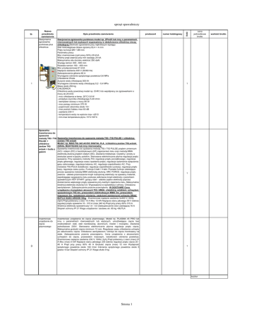 lp. Nazwa przedmiotu zamówienia Stacjonarna zgrzewarka punktowa plus chłodnica 1 Spawarka inwertorowa do spawania metodą TIG i TIG PULSE + chłodnica zestaw TIG wózek + butla z gazem Inwertorowe urządzenie do cięcia plazmowego 3 Opis przedmiotu zamówienia producent Stacjonarna zgrzewarka punktowa model np. ZPm25 lub inny o parametrach równoważnych lub wyższych wyposażony w dedykowana chłodnicę cieczy chłodzącej Zdolność zgrzewania przy najkrótszym wysięgu Stal niskowęglowa (klasa zgrzeiny B) 4 + 4 mm Pręty na krzyż Ø9 + Ø9 mm Parametry pracy Moc znamionowa (cykl pracy 50%) 25 kVA Wtórny prąd zwarcia przy min wysięgu 24 kA Maksymalna siła docisku elektrod 350 daN Wysięg ramion 300 - 600 mm Rozstaw ramion 160 - 400 mm Moc przyłączeniowa 61 kVA Napięcie zasilania 400 V (50/60 Hz) Zabezpieczenia główne 80 A Wymagane ciśnienie sprężonego powietrza 0,6 MPa Chłodzenie Woda Zużycie wody chłodzącej 300 l/h Wymagane ciśnienie wody chłodzącej 0,2 - 0,4 MPa Masa około 250 kg CHŁODNICA: Chłodnica wody powrotnej model np. CHR 3 do współpracy ze zgrzewarkami o mocy do 25 kVA - moc chłodzenia w temp. 20°C 0.8 W - przepływ czynnika chłodzącego 5-40 l/min - wentylator osiowy o mocy 85 W - moc pompy minimum 370 W - pojemność zbiornika około 10 l - max poziom hałasu max 63 dB - zasilanie 230 V - temperatura wody na wylocie max +25°C - min-max temperatura płynu +5°C+55°C Spawarka inwertorowa do spawania metodą TIG i TIG PULSE + chłodnica zestaw TIG wózek Model: np. MAX-TIG 345 AC/DC DIGITAL R.A. +chłodnica,zestaw TIG,wózek (IDEAL MAXTIG345) lub inny równoważny Spawarka inwertorowa do spawania metodą TIG i TIG PULSE prądem zmiennym (AC) i stałym (DC) z bezdotykowym (HF) zajarzeniem łuku oraz metodą MMA elektrodą otuloną prądem stałym (DC). Zasilanie trójfazowe. Czytelny i prosty w obsłudze panel w języku polskim. Sterowana elektronicznie płynna regulacja prądu spawania. Przy spawaniu metodą TIG: regulacja prądu początkowego, regulacja prądu głównego, regulacja czasu opadania prądu, regulacja opóźnienia wyłączenia gazu osłonowego, regulacja balansu AC, regulacja częstotliwości AC. Przy metodzie TIG PULS dodatkowo: regulacja częstotliwości pulsacji, regulacja prądu bazy, regulacja czasu pulsu. Funkcja 2-takt / 4-takt. Posiada funkcje ułatwiające proces spawania metodą MMA elektrodą otuloną: ARC FORCE: regulacja prądu zwarcia - ułatwia przenoszenie kropli roztopionej elektrody na spawany materiał, zapobiegając wygaszeniu łuku podczas zetknięcia kropli elektrody z jeziorkiem spawalniczym HOT START: gorący start - ułatwia zapłon elektrody poprzez dostarczenie większego prądu spawania przy każdym zajarzeniu łuku. Maksymalna średnica elektrody otulonej 5,0. Wyposażona w wyświetlacz cyfrowy. Chłodzona wentylatorem. Zabezpieczenie przeciw przeciążeniu. W DOSTAWIE Cena urządzenia z kompletem akcesorii TIG i MMA: chłodnicą, wózkiem, uchwytem spawalniczym TIG 4m, przewodem elektrodowym MMA 3m, przewodem masowym 3m, reduktorem ciśnienia, częściami zamiennymi uchwytu ORAZ BUTLA GAZU ARGON 30kg. Znamionowe napięcie zasilania 3x400 V; 50Hz (3ph) Prąd pobierany z sieci 15 A Moc 12 kW Napięcie stanu jałowego 59 V Zakres regulacji prądu spawania 10 - 315 A (max 345 A) Prąd przy pracy 60% 315 A Średnica elektrody spawalniczej 1,6 - 5,0 Zabezpieczenie sieci zasilającej 16 A Stopień ochrony IP 21 Waga urządzenia / zestawu ok. 65 kg +BUTLA Inwertorowe urządzenie do cięcia plazmowego. Model np. PLASMA 45 PRO lub inny o parametrach równoważnych lub wyższych, umożliwiające cięcie bez zniekształceń: stali, stali nierdzewnej, aluminium, miedzi i mosiądzu. Zasilanie jednofazowe 230V. Sterowana elektronicznie płynna regulacja prądu cięcia. Maksymalna grubość cięcia minimum 12 mm. Regulacja czasu chłodzenia uchwytu po zakończeniu cięcia. Chłodzone wentylatorem. Uchwyt do cięcia montowany na stałe. Zabezpieczenie przeciw przeciążeniu. Cena urządzenia z akcesoriami: uchwytem do cięcia, przewodem masowym, reduktorem ciśnienia powietrza. Znamionowe napięcie zasilania 230 V; 50Hz (1ph) Prąd pobierany z sieci (max) 21 A Moc (max) 5 kW Napięcie stanu jałowego 230 Zakres regulacji prądu cięcia 20 40 A Prąd przy pracy 60% 40 A Grubość cięcia (max) 12 mm Wydajność sprężonego powietrza około 100 l/min Ciśnienie sprężonego powietrza około 5 gwara- 6 bar Stopień ochrony IP 21 Waga około 9 kg numer katalogowy ilość sprzęt spawalniczy cena jednostkowa brutto 1 1 1 RAZEM Strona 1 wartość brutto