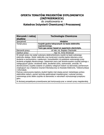 OFERTA TEMATÓW PROJEKTÓW DYPLOMOWYCH (INŻYNIERSKICH) do zrealizowania w Katedrze Inżynierii Chemicznej i Procesowej Kierunek i rodzaj studiów Technologia Chemiczna obojętna Czujnik gazów toksycznych na bazie elektrolitu superjonowego. Toxic gas sensor based on superionic electrolyte. Kierownik pracy: dr hab. inż. Bogdan Chachulski Opiekun pracy: mgr inż. Anna Strzelczyk W ramach pracy ma zostać wykonany elektrochemiczny czujnik na bazie wybranego elektrolitu stałego. Wybór elektrolitu oraz konstrukcji czujnika będzie dokonany przez studenta w porozumieniu z opiekunem i konsultantem na podstawie wykonanego przez studenta przeglądu literaturowego. Założeniem pracy jest skonstruowanie czujnika jednego z następujących gazów: dwutlenek siarki, dwutlenek azotu, siarkowodór, amoniak. Po skonstruowaniu czujnika zostanie on poddany wstępnym testom na stanowisku pomiarowym znajdującym się w Katedrze Inżynierii Biomedycznej na Wydziale Elektroniki, Telekomunikacji i Informatyki. Podczas wykonywania dyplomu student będzie miał okazję poznać metodologię syntezy elektrolitów stałych, poznać technikę spektroskopii impedancyjnej i wykonać pomiary wykonanego przez siebie czujnika na stanowisku w warunkach wymuszonego przepływu gazu. Specjalność Temat pracy W dłuższej perspektywie przewidywana jest kontynuacja prac w ramach pracy magisterskiej.