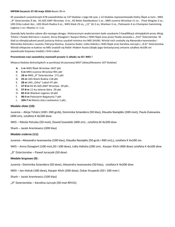 MPSiM Szczecin 27-30 maja 2016 Basen 50 m W zawodach uczestniczyło 678 zawodników ze 137 klubów z tego 64 zaw. z 12 klubów reprezentowało Dolny Śląsk w tym:, MKS „9” Dzierżoniów 3 os, KS AZS AWF Wrocław 6 os , KS Rekin Świebodzice 1 os , MKS Juvenia Wrocław 11 os , Piast Głogów 2 os , UKS Orka Lubań 4os , UKS Shark Rudna 4 os , WKS Slask 23 os, „11” JG 2 os, Wankan 3 os., Patoswim 4 os Champion Swimming Legnica 1 os i Manta J-L 1 os Zawody były bardzo udane dla naszego okręgu. Historycznym wydarzeniem było uzyskanie 5 kwalifikacji olimpijskich przez Alicję Tchórz i Pawła Wernera z Juvenii, Anny Dowgiert i Kacpra Klicha z WKS Śląsk oraz przez Pawła Juraszka z „9-ki” Dzierżoniów. W ślad za olimpijczykami poszli juniorzy którzy uzyskali minima ma MEJ (HUN). Wśród nich znalazły się Alexandra Iwanowska i Weronika Górecka z Juvenii, Patrycja Rzońca, Zuzanna Duda i Lidia Halicka z WKS Śląsk oraz Karolina Jurczyk z „9-ki” Dzierżoniów. Wśród chłopców w kadrze na MEJ znaleźli się Rafał i Robert Kusto (dzięki jego fantastycznej zmianie sztafeta 4x100 zm wywalczyła brązowy medal) z Orki Lubań. Procentowo nasi zawodnicy stanowili prawie ¼ składu na IO i MEJ ! Miejsca klubów dolnośląskich w punktacji drużynowej MSiT (sklasyfikowano 107 klubów) A. B. C. D. E. F. G. H. I. J. 1 m WKS Ślask Wrocław 1437 pkt 5 m MKS Juvenia Wrocław 901 pkt 18 m MKS „9” Dzierżoniów 171 pkt 25 m UKS Shark Rudna 118 pkt 28 m UKS „Orka” Lubań 97 pkt 57-8 m KS KS AZS AWF Wrocław 29 pkt , 57-8 m 11-ka Jelenia Góra 29 pkt 82-4 m Wankan Legnica 10 pkt 90-3 m Patoswim Bogatynia 7 pkt 104-7 m Manta Jelcz-Laskowice 1 pkt, Medale złote (10): Juvenia – Alicja Tchórz (100 i 200 grzb), Dominika Sztandera (50 klas), Klaudia Naziębło (200 mot), Paula Żukowska (400 zm), sztafeta K 4x100 dow WKS – Nikola Petryka (50 mot), Dawid Szwedzki (400 zm) , sztafeta M 4x200 dow Shark – Jacek Arentewicz (200 klas) Medale srebrne (11): Juvenia –Alexandra Iwanowska (100 klas), Klaudia Naziębło (50 grzb i 400 zm),), sztafeta K 4x100 zm WKS – Anna Dowgiert (100 mot,50 i 100 dow), Lidia Halicka (200 zm) , Kacper Klich (400 dow) sztafeta K 4x100 dow „9” Dzierżoniów – Paweł Juraszek (50 dow) Medale brązowe (9) : Juvenia –Dominika Sztandera (50 dow), Alexandra Iwanowska (50 klas), sztafeta K 4x200 dow WKS – Jan Hołub (100 dow), Kacper Klich (200 dow), Oskar Krupecki (50 i 100 mot ) Shark – Jacek Arentewicz (100 klas) „9” Dzierżoniów – Karolina Jurczyk (50 mot RPJ15)