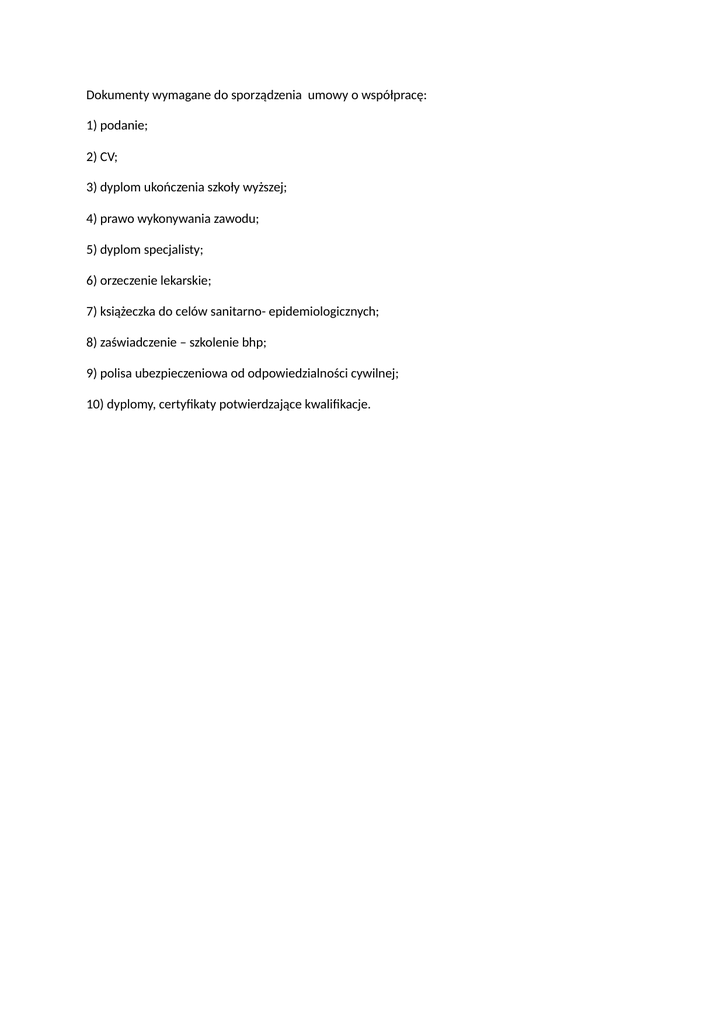 Dokumenty wymagane do sporządzenia umowy o współpracę: 1) podanie; 2) CV; 3) dyplom ukończenia szkoły wyższej; 4) prawo wykonywania zawodu; 5) dyplom specjalisty; 6) orzeczenie lekarskie; 7) książeczka do celów sanitarno- epidemiologicznych; 8) zaświadczenie – szkolenie bhp; 9) polisa ubezpieczeniowa od odpowiedzialności cywilnej; 10) dyplomy, certyfikaty potwierdzające kwalifikacje.