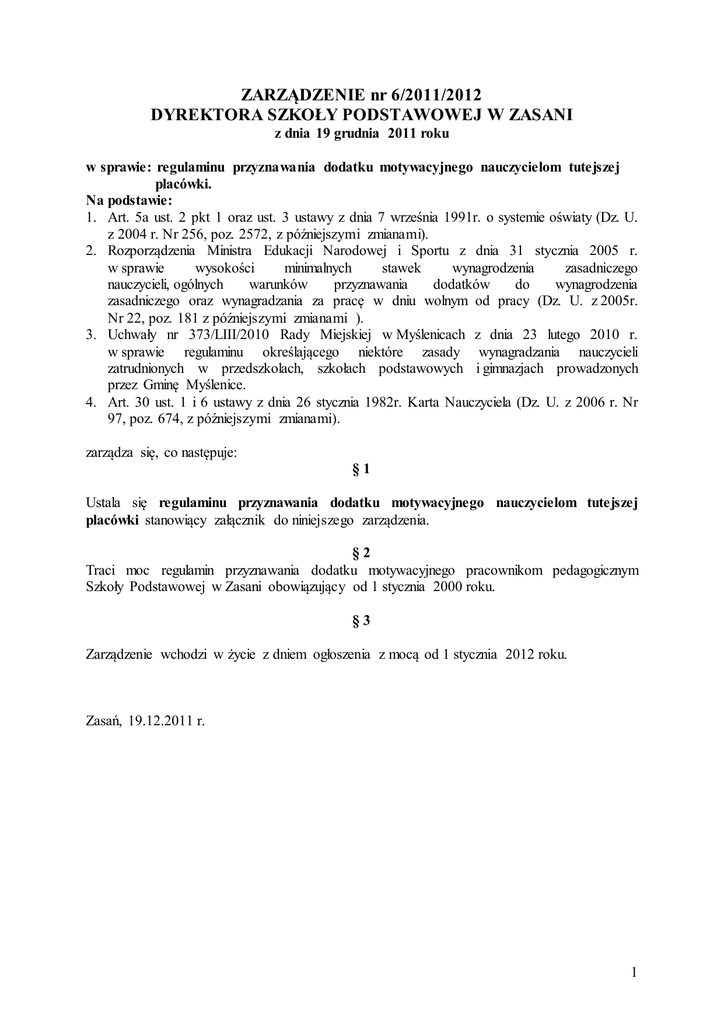 ZARZĄDZENIE nr 6/2011/2012 DYREKTORA SZKOŁY PODSTAWOWEJ W ZASANI z dnia 19 grudnia 2011 roku w sprawie: regulaminu przyznawania dodatku motywacyjnego nauczycielom tutejszej placówki. Na podstawie: 1. Art. 5a ust. 2 pkt 1 oraz ust. 3 ustawy z dnia 7 września 1991r. o systemie oświaty (Dz. U. z 2004 r. Nr 256, poz. 2572, z późniejszymi zmianami). 2. Rozporządzenia Ministra Edukacji Narodowej i Sportu z dnia 31 stycznia 2005 r. w sprawie wysokości minimalnych stawek wynagrodzenia zasadniczego nauczycieli, ogólnych warunków przyznawania dodatków do wynagrodzenia zasadniczego oraz wynagradzania za pracę w dniu wolnym od pracy (Dz. U. z 2005r. Nr 22, poz. 181 z późniejszymi zmianami ). 3. Uchwały nr 373/LIII/2010 Rady Miejskiej w Myślenicach z dnia 23 lutego 2010 r. w sprawie regulaminu określającego niektóre zasady wynagradzania nauczycieli zatrudnionych w przedszkolach, szkołach podstawowych i gimnazjach prowadzonych przez Gminę Myślenice. 4. Art. 30 ust. 1 i 6 ustawy z dnia 26 stycznia 1982r. Karta Nauczyciela (Dz. U. z 2006 r. Nr 97, poz. 674, z późniejszymi zmianami). zarządza się, co następuje: §1 Ustala się regulaminu przyznawania dodatku motywacyjnego nauczycielom tutejszej placówki stanowiący załącznik do niniejszego zarządzenia. §2 Traci moc regulamin przyznawania dodatku motywacyjnego pracownikom pedagogicznym Szkoły Podstawowej w Zasani obowiązujący od 1 stycznia 2000 roku. §3 Zarządzenie wchodzi w życie z dniem ogłoszenia z mocą od 1 stycznia 2012 roku. Zasań, 19.12.2011 r. 1 Załącznik do Zarządzenia Dyrektora SP w Zasani Nr 6/ 2011/2012 z dnia 19 grudnia 2011 r. REGULAMIN PRZYZNAWANIA DODATKU MOTYWACYJNEGO PRACOWNIKOM PEDAGOGICZNYM SZKOŁY PODSTAWOWEJ W ZASANI PODSTAWA PRAWNA 1. Art. 5a ust. 2 pkt 1 oraz ust. 3 ustawy z dnia 7 września 1995r. o systemie oświaty (t. j.: Dz. U. z 2004 r. nr 256, poz. 2572, z późniejszymi zmianami). 2. Rozporządzenie Ministra Edukacji Narodowej i Sportu z dnia 31 stycznia 2005 r. w sprawie wysokości minimalnych stawek wynagrodzenia zasadniczego nauczycieli, ogólnych warunków przyznawania dodatków do wynagrodzenia zasadniczego oraz wynagradzania za pracę w dniu wolnym od pracy. (Dz. U. z 2005r. Nr 22, poz. 181, z późniejszymi zmianami ). 3. Uchwały nr 373/LIII/2010 Rady Miejskiej w Myślenicach z dnia 23 lutego 2010 r. w sprawie regulaminu określającego niektóre zasady wynagradzania nauczycieli zatrudnionych w przedszkolach, szkołach podstawowych i gimnazjach prowadzonych przez Gminę Myślenice. 4. Art. 30 ust. 1 i 6 ustawy z dnia 26 stycznia 1982r. Karta Nauczyciela (Dz. U. z 2006 r. Nr 97, poz. 674, z późniejszymi zmianami). POSTANOWIENIA OGÓLNE §1 Regulamin dotyczy przyznawania dodatku motywacyjnego pracownikom pedagogicznym Szkoły Podstawowej w Zasani. §2 W ramach wynagrodzeń nauczycieli tworzy się fundusz dodatku motywacyjnego w wysokości zależnej od corocznie uchwalanego przez Radę Miejską w Myślenicach regulaminu określającego wysokość oraz szczegółowe warunki przyznawania nauczycielom dodatków motywacyjnego, funkcyjnego i za warunki pracy oraz niektóre inne składniki wynagrodzenia. §3 Dodatek motywacyjny jest ruchomą częścią wynagrodzenia pracowników pedagogicznych i przyznawany jest zależnie od ilości i jakości pracy oraz pozytywnych jej wyników. 2 §4 Dodatek motywacyjny nie może przekroczyć 8 % wynagrodzenia zasadniczego nauczyciela. §5 Dodatek motywacyjny przyznaje się na czas określony, nie krótszy niż 1 miesiąc i nie dłuższy niż 1 rok szkolny. §6 Dyrektor szkoły przedstawia Radzie Pedagogicznej, do zaopiniowania, ustaloną przez siebie wysokość dodatku motywacyjnego dla nauczycieli. §7 Decyzję o przyznaniu dodatku motywacyjnego przekazuje się nauczycielowi w formie pisemnej. Kopię decyzji włącza się do akt osobowych, a drugą kopię przekazuje się do Zespołu Ekonomiki Oświaty Myślenicach. §8 Nieprzyznanie dodatku motywacyjnego nie wymaga pisemnego uzasadnienia. §9 Łączna kwota dodatku motywacyjnego nauczycieli nie finansowych przewidzianych na ten cel w budżecie szkoły. może przekroczyć środków §10 Cofnięcie lub obniżenie dodatku motywacyjnego w czasie, na który został przyznany, może nastąpić tylko w przypadku: 1) nałożenia kary przewidzianej przepisami Kodeksu Pracy (przy bezskuteczności odwołania), 2) wszczęcia postępowania dyscyplinarnego, 3) nieuzasadnionego braku realizacji statutowych obowiązków nauczyciela. §11 Prawa do dodatku motywacyjnego nie maja nauczyciele, którzy: 1) po raz pierwszy są zatrudnieni w tutejszej szkole – przez okres 1 roku, licząc od daty rozpoczęcia pracy, 2) otrzymali kary dyscyplinarne lub porządkowe – przez okres przynajmniej 12 miesięcy, licząc od daty udzielenia kary, 3) przebywają na urlopie bezpłatnym, 4) powracają do pracy po urlopie bezpłatnym lub dla podratowania zdrowia trwającym dłużej niż 5 miesięcy – przez okres 6 miesięcy od daty powrotu do pracy. §12 Dodatek motywacyjny wypłaca się z góry, w terminie wypłaty wynagrodzenia. 3 KRYTERIA PRZYZNAWANIA DODATKU MOTYWACYJNEGO §13 1.Warunkiem przyznania nauczycielowi dodatku motywacyjnego, z zastrzeżeniem ust. 1, pkt. 3 oraz ust. 3, jest: 1) uzyskanie szczególnych osiągnięć dydaktycznych, wychowawczych i opiekuńczych, a w szczególności: a) uzyskiwanie przez uczniów, z uwzględnieniem ich możliwości oraz warunków pracy nauczyciela, dobrych osiągnięć dydaktyczno-wychowawczych potwierdzanych wynikami klasyfikacji lub promocji, efektami sprawdzianów albo sukcesami w konkursach i zawodach; b) umiejętne rozwiązywanie problemów wychowawczych uczniów we współpracy z ich rodzicami; c) pełne rozpoznanie środowiska wychowawczego uczniów, aktywne i efektywne działanie na rzecz uczniów potrzebujących szczególnej opieki; d) angażowanie się w pracę z uczniem zdolnym lub wymagającym pomocy dydaktycznej, 2) jakość świadczonej pracy, w tym związanej z pow