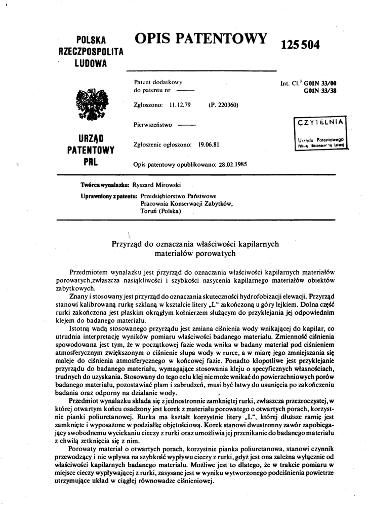 POLSKA RZECZPOSPOLITA LUDOWA OPIS PATENTOWY Patent dodatkowy do patentu nr — Zgłoszono: Ą/-K£>\\ «** PATENTOWY PRL Int. Cl.3 G01N 33/00 G01N 33/38 11.12.79 (P. 220360) CZY iŁLNIA Pierwszeństwo URZĄD 125504 Zgłoszenie ogłoszono: 19.06.81 Urzędu Patentowego I pilili lmi*M»*-*t| .UimtJ Opis patentowy opublikowano: 28.02.1985 Twórcawynalazku: Ryszard Mirowski Uprawniony z patentu: Przedsiębiorstwo Państwowe Pracownia Konserwacji Zabytków, Toruń (Polska) \ Przyrząd do oznaczania właściwości kapilarnych materiałów porowatych Przedmiotem wynalazku jest przyrząd do oznaczania właściwości kapilarnych materiałów porowatych,zwłaszcza nasiąkliwości i szybkości nasycenia kapilarnego materiałów obiektów zabytkowych. Znany i stosowanyjest przyrząd do oznaczania skuteczności hydrofobizacji elewacji. Przyrząd stanowi kalibrowaną rurkę szklaną w kształcie litery „L" zakończoną u góry lejkiem. Dolna część rurki zakończona jest płaskim okrągłym kołnierzem służącym do przyklejania jej odpowiednim klejem do badanego materiału. Istotną wadą stosowanego przyrządu jest zmiana ciśnienia wody wnikającej do kapilar, co utrudnia interpretację wyników pomiaru właściwości badanego materiału. Zmienność ciśnienia spowodowana jest tym, że w początkowej fazie woda wnika w badany materiał pod ciśnieniem atmosferycznym zwiększonym o ciśnienie słupa wody w rurce, a w miarę jego zmniejszania się maleje do ciśnienia atmosferycznego w końcowej fazie. Ponadto kłopotliwe jest przyklejanie przyrządu do badanego materiału, wymagające stosowania kleju o specyficznych własnościach, trudnych do uzyskania. Stosowany do tego celu klej nie może wnikać do powierzchniowych porów badanego materiału, pozostawiać plam i zabrudzeń, musi być łatwy do usunięcia po zakończeniu badania oraz odporny na działanie wody. Przedmiot wynalazku składa się zjednostronnie zamkniętej rurki, zwłaszcza przezroczystej, w której otwartym końcu osadzony jest korek z materiału porowatego o otwartych porach, korzyst¬ nie pianki poliuretanowej. Rurka ma kształt korzystnie litery „L", której dłuższe ramię jest zamknięte i wyposażone w podziałkę objętościową. Korek stanowi dwustronny zawór zapobiega¬ jący swobodnemu wyciekaniu cieczy z rurki oraz umożliwiajej przenikanie do badanego materiału z chwilą zetknięcia się z nim. Porowaty materiał o otwartych porach, korzystnie pianka poliuretanowa, stanowi czynnik przewodzący i nie wpływa na szybkość wypływu cieczy z rurki, gdyż jest ona zależna wyłącznie od właściwości kapilarnych badanego materiału. Możliwe jest to dlatego, że w trakcie pomiaru w miejsce cieczy wypływającej z rurki, zasysane jest w wyniku wytworzonego podciśnienia powietrze utrzymujące układ w ciągłej równowadze ciśnieniowej. 2 125504 Istotną zaletą przyrządu według wynalazku jest możliwość oznaczania właściwości kapilar¬ nych materiałów porowatych, takichjak piaskowiec, wapienie itp., bez konieczności pobierania ich próbek, co ma kapitalne znaczenie przy konserwacji obiektów zabytkowych. Przyrząd jest prosty w konstrukcji i łatwy w obsłudze. Pozwala on na prowadzenie nieniszczଠcych badań w takich samych warunkach, a przez to uzyskanie obiektywnych i porównywalnych ze sobą wyników. Ponadto przyrząd według wynalazku umożliwia znaczne skrócenie pracochłon¬ ności oznaczenia charakterystycznej dla danego materiału porowatego nasiąkli wości objętościowej i szybkości nasycenia kapilarnego w każdych warunkach terenowych. Przedmiot wynalazku jest bliżej uwidoczniony w przykładzie jego wykonania na rysunku przedstawiającym półwidok-półprzekrój przyrządu. Jak uwidoczniono na rysunku przyrząd składa się z szklanej kalibrowanej rurki 1 w kształcie litery „Lu, w której otwartym końcu osadzony jest korek 2 z pianki poliuretanowej o otwartych porach. Dłuższe ramię 3 rurki 1 jest zamknięte i wyposażone w podziałkę objętościową 4 wyskalo- waną w cm3. Przyrząd mocuje się w ten sposób, że na powierzchni badanego materiału, bezpośrednio powyżej miejsca pomiaru nakleja się kawałek plastra opatrunkowego. Następnie do plastra mocuje się za pomocą dwóch stalowych szpilek przecięty pierścień gumowy, w którym umieszcza się przyrząd korkiem 2 do badanego materiału. Właściwości kapilarne materiałów porowatych oznacza się w ten sposób, że rurkę 1 całkowicie wypełnioną cieczą przykłada się korkiem 2 do badanego materiału i mocuje, a następnie mierzy co najmniej jedną średnicę powstałej plamy i/lub czas wnikania określonej ilości cieczy. Jako ciecz stosuje się wodę lub rozpuszczalniki organiczne jak benzyna lakowa, toluen, ksylen, alkohol metylowy i etylowy. Celem oznaczenia nasiąkliwości objętościowej określa się objętość materiału nasyconą daną ilością cieczy, którą oblicza się na podstawie pomiaru co najmniej jednej średnicy plamy. W przypadku oznaczania nasiąkliwości jednorodnych materiałów porowatych, mierzy się jedną średnicę plamy zakładając, że ciecz wypływająca punktowo z przyrządu wnika kapilarnie we wszystkich kierunkach z jednakową prędkością i nasyca jego partie wewnętrzne tworząc półkulę. Natomiast przy oznaczaniu nasiąkliwości niejednorodnych materiałów porowatych jak kamienie naturalne, należy dokonać pomiaru co najmniej dwóch średnic powstałej plamy i na ich podstawie oblicza się objętość materiału nasyconego. Nasiąkliwość objętościową oznacza się ze stosunku objętości zaabsorbowanej cieczy, odczyty¬ wanej na skali przyrządu i objętości materiału nasyconego. Podczas pomiaru nasiąkliwości nie uzyskuje się całkowitego wypełnienia kapilar, dlatego też dla oznaczenia całkowitej nasiąkliwości objętościowej należy stosować współczynniki charakterystyczne dla danego materiału i stosowanej cieczy. Szybkość nasycenia kapilarneg