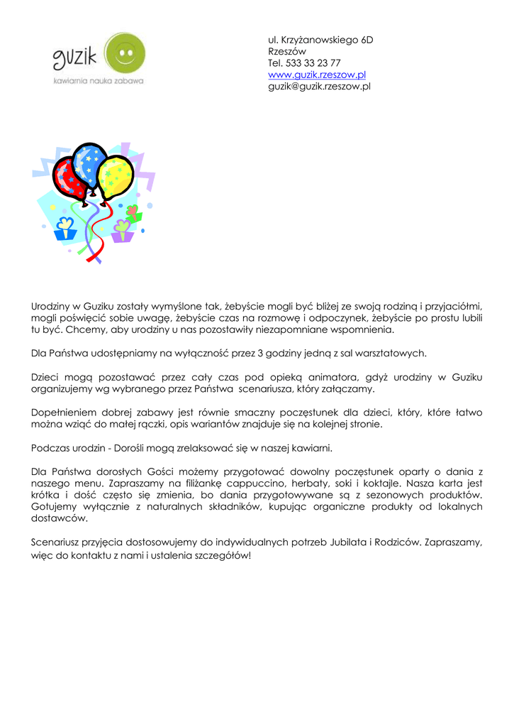 ul. Krzyżanowskiego 6D Rzeszów Tel. 533 33 23 77 www.guzik.rzeszow.pl [email protected] Urodziny w Guziku zostały wymyślone tak, żebyście mogli być bliżej ze swoją rodziną i przyjaciółmi, mogli poświęcić sobie uwagę, żebyście czas na rozmowę i odpoczynek, żebyście po prostu lubili tu być. Chcemy, aby urodziny u nas pozostawiły niezapomniane wspomnienia. Dla Państwa udostępniamy na wyłączność przez 3 godziny jedną z sal warsztatowych. Dzieci mogą pozostawać przez cały czas pod opieką animatora, gdyż urodziny w Guziku organizujemy wg wybranego przez Państwa scenariusza, który załączamy. Dopełnieniem dobrej zabawy jest równie smaczny poczęstunek dla dzieci, który, które łatwo można wziąć do małej rączki, opis wariantów znajduje się na kolejnej stronie. Podczas urodzin - Dorośli mogą zrelaksować się w naszej kawiarni. Dla Państwa dorosłych Gości możemy przygotować dowolny poczęstunek oparty o dania z naszego menu. Zapraszamy na filiżankę cappuccino, herbaty, soki i koktajle. Nasza karta jest krótka i dość często się zmienia, bo dania przygotowywane są z sezonowych produktów. Gotujemy wyłącznie z naturalnych składników, kupując organiczne produkty od lokalnych dostawców. Scenariusz przyjęcia dostosowujemy do indywidualnych potrzeb Jubilata i Rodziców. Zapraszamy, więc do kontaktu z nami i ustalenia szczegółów! OFERTA URODZINOWA DLA DZIECI WARIANT 1 27zł/dziecko owoce, paluszki, popcorn, żelki, galaretka z owocami i bitą śmietaną, ciastka, chrupki kukurydziane, soki i woda ze świeżą miętą i cytryną WARIANT 2 29zł/dziecko owoce, paluszki, popcorn, żelki, galaretka z owocami i bitą śmietaną, ciastka, chrupki kukurydziane, soki i woda ze świeżą miętą i cytryną +”mini pizze” lub frytki (do wyboru) WARIANT 3 32zł/dziecko owoce, paluszki, popcorn, żelki, galaretka z owocami i bitą śmietaną, ciastka, chrupki kukurydziane, soki i woda ze świeżą miętą i cytryną +naleśniki z serkiem lub dżemem (do wyboru) Cena wynajmu sali z animatorem wg wybranego scenariusza: 150zł W cenie: zastawa zaproszenia materiały plastyczne do realizacji wybranego scenariusza urodzin sala warsztatowa do dyspozycji przez 3 godz. animator na 3 godz. realizacji scenariusza (1 animator dla grupy max. 10 osób, dodatkowy animator: 50zł/3godz) ATRAKCJE DODATKOWO PŁATNE: 1. Szef kuchni (do wyboru) 1h: - pieczenie ciasteczek w wybranych kształtach i ozdabianie kolorowymi lukrami i jadalnymi koralikami - cakes poppsy, czyli ciastka na patyku, będziemy je ozdabiać lukrami 2. Eko-zabawki (do wyboru): - samolot - domek-skarbonka Zabawki z kartonu do samodzielnego złożenia, które będziemy samodzielnie ozdabiać. 3. Naukowe (prowadzone przez doktora chemii) 1,5h: profesjonalne naukowe doświadczenia, tematyka do uzgodnienia: powietrze, woda, wiatr, ogień do 10osób 80zł do 15 osób 110zł 7zł/szt. 9zł/szt. 200zł do 10 osób 4. Dizajner 1,5h: szycie lalek, pacynek, torebek itp. wg życzenia z surowców wtórnych 120zł do 10 osób 5. Robotyka - Lego 2h: Zabawa konstruktorska z klocków oraz programowanie robotów 250zł do 10 osób OFERTA URODZINOWA DLA RODZICÓW Kawa lub herbata rozliczane po przyjęciu, za sztukę wg cen z menu Sok jabłkowy, multiwitamina cena za dzban 1l 12 zł Woda mineralna z miętą i cytryną cena za dzban 1l 7 zł Szarlotka na ciepło+ kawa (lub herbata – do wyboru) 15zł PATERA CIEPŁYCH PRZEKĄSEK: tortilla, bruschetta, fishcakes, ciabata wegetariańska + kawa lub herbata (do wyboru) do wyboru 2 propozycje z 4, w ilości 50% liczby gości każda Serwis tortu dla osoby dorosłej w przypadku podania tortu przyniesionego Rezerwacja stołu dla dorosłych na sali restauracyjnej: -do 10 osób -powyżej 10 osób 23zł/os. 3zł/os bezpłatnie 100zł W CELU REZERWACJI PROSIMY O WPŁATE ZADATKU W WYSOKOSCI 100zł W CIAGU 3 DNI ROBOCZYCH OD DNIA REZERWACJI TERMINU. ABY ZAREZERWOWAĆ TERMIN WYSTARCZY: zadzwonić do nas tel. 533 33 23 77 lub przyjść osobiście najlepiej na kilka tygodni przed planowaną imprezą i zarezerwować salkę urodzinową, wpłacić zadatek (osobiście lub przelewem) wybrać pakiet urodzinowy oraz scenariusz urodzinowej zabawy ostateczną liczbę dzieci obecnych na urodzinach potwierdzić najpóźniej 3 dni przed urodzinami przyjść wraz z zaproszonymi gośćmi w dniu urodzin, a wszystko będzie już przygotowane. Informujemy, że płatności za organizację urodzin przyjmowane są tylko w gotówce. REGULAMIN URODZIN w GUZIKU Minimalna ilość dzieci na urodzinach - 5 Jako Organizator imprezy jesteście Państwo odpowiedzialni za swoich zaproszonych Gości oraz jesteście zobowiązani do obecności podczas imprezy urodzinowej. Dziecko uczestniczące w imprezie bez swoich rodziców pozostaje pod opieką Organizatora urodzin. Przy rezerwacji salki urodzinowej obowiązuje wpłacenie zadatku w kwocie 100 zł ciągu 3 dni roboczych od dnia rezerwacji terminu. Urodziny od poniedziałku do piątku odbywają się w godzinach 16.30-19.30, a w soboty i niedziele w dwóch przedziałach czasowych: 11-14 oraz 15-18 Mają Państwo możliwość jeden raz zmienić termin rezerwacji (o ile będzie wolny termin), jednak w przypadku całkowitej rezygnacji zadatku nie zwracamy.