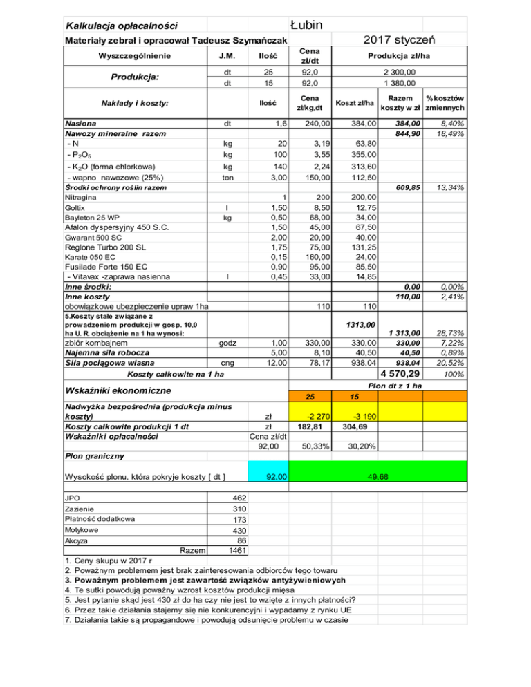 Łubin Kalkulacja opłacalności 2017 styczeń Materiały zebrał i opracował Tadeusz Szymańczak Wyszczególnienie J.M. Ilość Produkcja: dt dt 25 15 Cena zł/dt 92,0 92,0 Cena zł/kg,dt Ilość Nakłady i koszty: Produkcja zł/ha 2 300,00 1 380,00 Koszt zł/ha Nasiona Nawozy mineralne razem -N - P2O5 dt 1,6 240,00 384,00 kg kg 20 100 3,19 3,55 63,80 355,00 - K2O (forma chlorkowa) - wapno nawozowe (25%) kg ton 140 3,00 2,24 150,00 313,60 112,50 1 200 1,50 0,50 1,50 2,00 1,75 0,15 0,90 0,45 8,50 68,00 45,00 20,00 75,00 160,00 95,00 33,00 200,00 12,75 34,00 67,50 40,00 131,25 24,00 85,50 14,85 Środki ochrony roślin razem Nitragina Goltix Bayleton 25 WP l kg Afalon dyspersyjny 450 S.C. Gwarant 500 SC Reglone Turbo 200 SL Karate 050 EC Fusilade Forte 150 EC - Vitavax -zaprawa nasienna Inne środki: Inne koszty obowiązkowe ubezpieczenie upraw 1ha l 110 5.Koszty stałe zw iązane z prow adzeniem produkcji w gosp. 10,0 ha U. R. obciążenie na 1 ha w ynosi: zbiór kombajnem Najemna siła robocza Siła pociągowa własna cng 1,00 5,00 12,00 330,00 8,10 78,17 384,00 844,90 8,40% 18,49% 609,85 13,34% 0,00 110,00 0,00% 2,41% 1 313,00 330,00 40,50 938,04 28,73% 7,22% 0,89% 20,52% 4 570,29 100% 110 1313,00 godz Razem % kosztów koszty w zł zmiennych 330,00 40,50 938,04 Koszty całkowite na 1 ha Plon dt z 1 ha Wskaźniki ekonomiczne 25 Nadwyżka bezpośrednia (produkcja minus koszty) Koszty całkowite produkcji 1 dt Wskaźniki opłacalności zł zł Cena zł/dt 92,00 15 -2 270 182,81 -3 190 304,69 50,33% 30,20% Plon graniczny Wysokość plonu, która pokryje koszty [ dt ] JPO Zazienie Płatność dodatkowa Motykowe Akcyza 1. 2. 3. 4. 5. 6. 7. 92,00 462 310 173 430 86 1461 Razem Ceny skupu w 2017 r Poważnym problemem jest brak zainteresowania odbiorców tego towaru Poważnym problemem jest zawartość związków antyżywieniowych Te sutki powodują poważny wzrost kosztów produkcji mięsa Jest pytanie skąd jest 430 zł do ha czy nie jest to wzięte z innych płatności? Przez takie działania stajemy się nie konkurencyjni i wypadamy z rynku UE Działania takie są propagandowe i powodują odsunięcie problemu w czasie 49,68