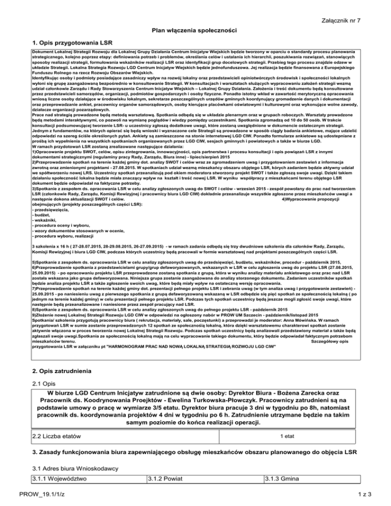 Załącznik nr 7 Plan włączenia społeczności 1. Opis przygotowania LSR Dokument Lokalnej Strategii Rozwoju dla Lokalnej Grupy Działania Centrum Inicjatyw Wiejskich będzie tworzony w oparciu o standardy procesu planowania strategicznego, kolejno poprzez etapy: definiowania potrzeb i problemów, określania celów i ustalania ich hierarchii, poszukiwania rozwiązań, stanowiących sposoby realizacji strategii, formułowania wskaźników realizacji LSR oraz identyfikacji grup docelowych strategii. Przebieg tego procesu znajdzie odzew w układzie Strategii. Lokalna Strategia Rozwoju LGD Centrum Inicjatyw Wiejskich będzie jednofunduszowa. Jej realizacja będzie finansowana z Europejskiego Funduszu Rolnego na rzecz Rozwoju Obszarów Wiejskich. Identyfikując osoby i podmioty posiadające zasadniczy wpływ na rozwój lokalny oraz przedstawicieli opiniotwórczych środowisk i społeczności lokalnych wyłoni się grupę zaangażowaną bezpośrednio w konsultowanie Strategii. W konsultacjach i warsztatach służących wypracowaniu założeń strategii wezmą udział członkowie Zarządu i Rady Stowarzyszenia Centrum Inicjatyw Wiejskich – Lokalnej Grupy Działania. Założenia i treść dokumentu będą konsultowane przez przedstawicieli samorządów, organizacji, podmiotów gospodarczych i osoby fizyczne. Ponadto istotny wkład w zawartość merytoryczną opracowania wniosą liczne osoby działające w środowisku lokalnym, sekretarze poszczególnych urzędów gminnych koordynujący gromadzenie danych i dokumentacji oraz przeprowadzanie ankiet, pracownicy organów samorządowych, osoby kierujące placówkami oświatowymi i kulturowymi oraz wykonujące wolne zawody, działacze organizacji pozarządowych. Prace nad strategią prowadzone będą metodą warsztatową. Spotkania odbędą się w układzie plenarnym oraz w grupach roboczych. Warsztaty prowadzone będą metodami interaktywnymi, co pozwoli na wymianę poglądów i wiedzy pomiędzy uczestnikami. Spotkania zgromadzą od 10 do 50 osób. W trakcie konsultacji podsumowującej tworzenie LSR- u uczestnicy zgłoszą dodatkowe uwagi, które zostaną uwzględnione w dokumencie ostatecznym strategii. Jednym z fundamentów, na których opierać się będą wnioski i wyznaczone cele Strategii są prowadzone w sposób ciągły badania ankietowe, mające udzielić odpowiedzi na szereg ściśle określonych pytań. Ankiety są zamieszczone na stonie internetowej LGD CIW. Ponadto formularze ankietowe są udostepniane z prośbą ich wypełnienia na wszystkich spotkaniach organizowanych przez LGD CIW, sesjach gminnych i powiatowych a także w biurze LGD. W ramach przydotowań LSR zostaną zrealizowane następujące działania: 1)Opracowanie projektu SWOT, celów, opisu zintegrowania, innowacyjności, opis partnerstwa i procesu konsultacji i opis powiązań LSR z innymi dokumentami strategicznymi (regulaminy pracy Rady, Zarządu, Biura inne) - lipiec/sierpień 2015 2)Przeprowadzenie spotkań na terenie każdej gminy dot. analizy SWOT i celów wraz ze zgromadzeniem uwag i przygotowaniem zestawień z informacja zwrotną oraz zmienionymi projektami - 27.08.2015. W spotkaniach udział wezmą mieszkańcy obszaru objętego LSR, kórych zadaniem będzie aktywny udział we spółtworzeniu nowej LRS. Uczestnicy spotkań przeanalizują pod okiem moderatora stworzony projekt SWOT i także zgłoszą swoje uwagi. Dzięki takiem działaniu społeczność lokalna będzie miała znaczący wpływ na kształt i treść nowej LSR. W wyniku współpracy z mieszkańcami terenu objętego LSR dokument będzie odpowiadał na faktyczne potrzeby. 3)Spotkanie z zespołem ds. opracowania LSR w celu analizy zgłoszonych uwag do SWOT i celów - wrzesień 2015 - zespół powołany do prac nad tworzeniem LSR (członkowie Rady, Zarządu, Komisji Rewizyjnej i pracownicy biura LGD CIW) dokładnie przeanalizuje wszystkie zgłoszone przez mieszkańców uwagi a następnie dokona aktualizacji SWOT i celów. 4)Wypracowanie propozycji obejmujących (projekty poszczególnych części LSR): - przedsięwzięcia, - budżet, - wskaźniki, - procedura oceny i wyboru, - wzory dokumentów stosowanych w ocenie, - procedura wyboru, realizacji 3 szkolenia x 16 h ( 27-28.07.2015, 28-29.08.2015, 26-27.09.2015) - w ramach zadania odbędą się trzy dwudniowe szkolenia dla członków Rady, Zarządu, Komisji Rewizyjnej i biura LGD CIW, podczas których uczestnicy będą pracowali w formie warsztatowej nad projektami poszczególnych części LSR. 5)Spotkanie z zespołem ds. opracowania LSR w celu analizy zgłoszonych uwag do przedsięwzięć, budżetu, wskaźników, procedur - październik 2015, 6)Przeprowadzenie spotkania z przedstawicielami grupy/grup defaworyzowanych, wskazanych w LSR w celu zgłoszenia uwag do projektu LSR (27.08.2015, 25.09.2015) - po opracowaniu projektu LSR przeprowadzone zostaną spotkania z grupą, która w wyniku analizy materiału ankietowego oraz prac nad LSR została wskazana jako grupa defaworyzowana. Niniejsza grupa zostanie zaangażowana do analizy storzonego dokumentu. Zadaniem uczestników spotkań będzie analiza projektu LSR a także zgłoszenie swoich uwag, które będą miały wpływ na ostateczną wersję opracowania. 7)Przeprowadzenie spotkań na terenie każdej gminy dot. prezentacji pełnego projektu LSR i zebrania uwag (w tym analiza uwag i przygotowanie zestawień) 25.09.2015 - po naniesieniu uwag z pierwszego spotkania z grupą defaworyzowaną wskazaną w LSR odbędzie się pięć spotkań ze społecznością lokalną ( po jednym na terenie każdej gminy) w celu prezentacji pełnego projektu LSR. Podczas tych spotkań uczestnicy będą jeszcze mogli zgłosić swoje uwagi, które następnie będą przeanalizowane i naniesione przez zespół pracujący nad LSR. 8)Spotkanie z zespołem ds. opracowania LSR w celu analizy zgłoszonych uwag do pełnego projektu LSR - październik 2015 9)Złożenie nowej Lokalnej Strategii Rozwoju LGD CIW w odpowiedzi na ogłoszony nab