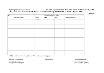 Wykaz pszczelarzy z Koła w ……………………… deklarujących nabycie w 2010 roku matek linii Car: CT46, CJ10, CNT, Alsin, oraz linii Cau: KPW, KBrz z pasieki hodowlanej BRZESKO-CZERMIN z dopłatą ARR. Tabela 7 L.p. Nazwisko i imię Liczba rodzin Ilość zamawianych matek MUU MR Podpis pszczelarza. [ MUU – matka unasieniona użytkowa, MR – matka reprodukcyjna] Sekretarz Zarządu Koła ……………………. (data, pieczątka i podpis) pieczęć Koła Prezes Zarządu Koła ……………………. (data, pieczątka i podpis)