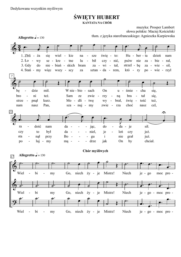 Dedykowana wszystkim myśliwym ŚWIĘTY HUBERT KANTATA NA CHÓR muzyka: Prosper Lambert słowa polskie: Maciej Kościelski tłum. z języka starofrancuskiego: Agnieszka Kurpiewska Allegretto q = 130 1. Zbli 2. Ło 3. Gdy 4. Stań - się ża wy se do nie my więc wiel kre biań wszy - kie na - sze świę - tne lu - bił czy - skich bram za - wi - scy sztan - da za - Hu psów strzel któ - to: nić, tał, rem, ber - ta dzień nam nie za - bie - rał, bę za - wie - sił, ry po - wie - rzył 7 bę dzie bro ni strze - pnął nam nasz mił. też. kurz. Pan, W nie - bio - sach On u Sam ze zwie - rzy - ną Mo - dli - twę wy - brał, sza - nuj - my zwie - rza śmie - cha bra - tał świę - tość choć nasz się, się, też, cel, 13 ra czy sta po 17 - dość to nął luj - nam był przy my da da Bo mą - - bi Wiel - bi Wiel - bi - - - jąc, niel, gu drze do je i jak - da - je leń czy nie grał On by sił. jeż. już. chciał. Chór myśliwych Allegretto q = 130 Wiel - my Go, niech ży - je Mistrz! Niech je - go moc pro - my Go, niech ży - je Mistrz! Niech je - go - moc pro - my Go, niech ży - je Mistrz! Niech je - go - moc pro - Święty Hubert Kantata na chór 2 26 wa - dzi nas. Niech da nam sła - wić nie - wiast wdzięk, bo wa - dzi nas. Niech da nam sła - wić nie - wiast wdzięk, bo wa - dzi nas. Niech da nam sła - wić nie - wiast wdzięk, bo 35 ło - wów i pie - śni, wi - na czas, ło - wów i pie - śni, wi - na czas, ło - wów i pie - śni, wi - na czas, ło - wów i pie - śni, wi - na czas. ło - wów i pie - śni, wi - na czas. ło - wów i pie - śni, wi - na czas. 40 Oryginał utworu zamieszczony został w »LA CHASSE ILLUSTRÈE« Nº 13 OCTOBRE 1869