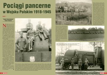 Pociągi pancerne PP Nr 6 „Gromobój” z Krakowa, sfotografowany prawdopodobnie gdzieś na szlaku Ustrzyki Dolne - Chyrów - Zagórz. Skład tworzyły opancerzony austriacki parowóz „tendrzak” typu Okm, dwa wagony artyleryjskie, czyli dwie eksaustriackie węglarki wzmocnione stalową nadbudową, wyposażone w obrotową wieżę. Jeden z wagonów artyleryjskich uzbrojony był prawdopodobnie w haubicę 100 mm, drugi zaś w armatę górską 80 mm. W składzie pociągu znajdowały się także dwa uzbrojone w ckm wagony szturmowe, prawdopodobnie pruskie typu IIb1 oraz lora pełniąca funkcję platformy kontrolnej i składu materiałów niezbędnych do naprawiania uszkodzonego szlaku. Widoczne gałęzie nie są raczej elementem kamuflażu. Pociąg jest „umajony” z okazji jakiejś ważnej uroczystości. Proszę zwrócić uwagę na widniejący na wieży wagonu artyleryjskiego na pierwszym planie portret, jak się domyślamy, niesłychanie ważnej osobistości w Wojsku Polskim 1918-1945 czêœæ 1 Tomasz Basarabowicz Paweł Fedorow N iniejsza praca nie rości sobie pretensji bycia kolejną próbą uporządkowania stanu wiedzy o polskich pociągach pancernych – tej jakże specyficznej, łatwo policzalnej i identyfikowalnej, a także „modnej” ostatnio broni. To raczej chęć zaprezentowania materiału, który udało się autorom przez lata zebrać, a który – wedle naszej wiedzy – nie jest jeszcze szerzej znany. Zajmiemy się zarówno wojną z lat 1918-1920, okresem międzywojennym, a także PSZ w Wielkiej Brytanii. Z góry przepraszamy za brak chronologii. Podstawowym elementem naszej pracy są naturalnie zdjęcia, a także facsimile dokumentów, które będą stanowiły osnowę każdego z odcinków. Postaramy się o to, by opisy ilustracji były jak najbardziej wyczerpujące. Ilustracjom będzie także towarzyszył tekst. Nie będziemy jednak powielać informacji opublikowanych już przez innych, jakże znakomitych autorów. Postaramy się raczej opowiadać o pociągach pancernych słowami ludzi, którzy w nich służyli oraz im współczesnym. Będziemy także korzystać z relacji, dokumentów i publikacji okresu międzywojennego, a także tych publikowanych na emigracji. W tym miejscu chcielibyśmy także podziękować naszym krakowskim kolegom – Andrzejowi „Drakuli” Piotrowskiemu i Jankowi Trzupkowi – znawcom historii kolei, bez których pomocy precyzyjna identyfikacja taboru i lokomotyw przerastałaby znacznie możliwości autorów. Jeśli mimo pomocy kolegów pojawią się błędy, a pewnie się pojawią, autorzy biorą je w stu procentach na siebie i proszą o wyrozumiałość. 58 PP Nr 10 „Pionier”. Skład zbudowany i zestawiony w styczniu 1919 roku we Lwowie. Lokomotywa to najpewniej austriacki „tendrzak”, ale niewykluczone, że jest to niemiecka BR89. Dwa wagony artyleryjskie, prowadzący i zamykający skład, zostały zbudowane na podstawie niemieckich węglarek typu Schwerin lub Nürnberg/Essen. Trzy wagony z ckm (szturmowe) to niemieckie wagony kryte typu Kassel/München/Karlsruhe. Wyróżnia je brak ukośnych zastrzałów oraz płaskie dachy budek hamulcowych w dwóch z nich. Doskonale widoczne otwory służące do prowadzenia ognia karabinowego Wagon artyleryjski PP Nr 10 „Pionier”. Proszę zwrócić uwagę na pisownię nazwy własnej. Wyraźnie widoczne są także widły maźnicze starej konstrukcji PP Nr 6 „Gromobój” z Krakowa, sfotografowany prawdopodobnie gdzieś na szlaku Ustrzyki Dolne - Chyrów - Zagórz. Skład tworzyły opancerzony austriacki parowóz „tendrzak” typu Okm, dwa wagony artyleryjskie, czyli dwie eksaustriackie węglarki wzmocnione stalową nadbudową, wyposażone w obrotową wieżę. Jeden z wagonów artyleryjskich uzbrojony był prawdopodobnie w haubicę 100 mm, drugi zaś w armatę górską 80 mm. W składzie pociągu znajdowały się także dwa uzbrojone w ckm wagony szturmowe, prawdopodobnie pruskie typu IIb1 oraz lora pełniąca funkcję platformy kontrolnej i składu materiałów niezbędnych do naprawiania uszkodzonego szlaku. Widoczne gałęzie nie są raczej elementem kamuflażu. Pociąg jest „umajony” z okazji jakiejś ważnej uroczystości. Proszę zwrócić uwagę na widniejący na wieży wagonu artyleryjskiego na pierwszym planie portret, jak się domyślamy, niesłychanie ważnej osobistości. 59 PP Nr 6 „Gromobój” gdzieś na karpackim szlaku. Pociąg zestawiono w Krakowie 8 grudnia 1918 roku, a jego dowódcą był porucznik Borczyk. Pociąg skreślono z ewidencji 8 sierpnia 1921 roku Ten sam wagon tego samego pociągu. Tym razem jednak nazwa własna pisana jest przez krótkie „i”… Część załogi „Pioniera” 7 grudnia 1919 roku odeszła do pociągu pancernego „Pomsta”. Pociąg zlikwidowano w sierpniu 1921 roku. W składzie gospodarczym znajdował się także wagon kąpielowy. W tym przypadku jest to przeróbka z wagonu osobowego pierwszej, drugiej i trzeciej klasy. Nie mamy pewności, ale wszystko wskazuje na to, że jest to niemiecki wagon z Bawarii lub Wirtembergii. Ewentualnie „austriak” Wnętrze wagonu kąpielowego. Widoczna instalacja prysznicowa Każdy z polskich pociągów pancernych posiadał drugi skład, tzw. gospodarczy. Na zdjęciu widoczne dwa austriackie wagony osobowe oraz parowóz Okl 11/101 Wagon artyleryjski PP Nr 6 „Gromobój”. Wyraźnie widoczna stalowa nadbudowa węglarki oraz wieża z działem. Na pierwszym planie kilku członków załogi pociągu z… dziewczynami 60 61