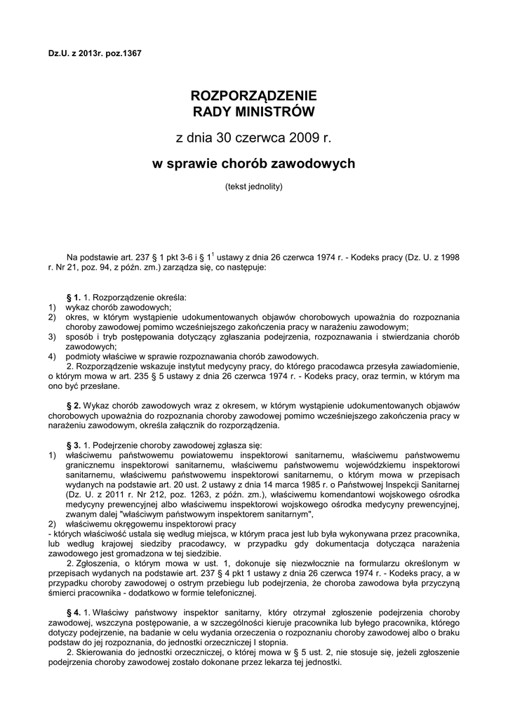 Dz.U. z 2013r. poz.1367 ROZPORZĄDZENIE RADY MINISTRÓW z dnia 30 czerwca 2009 r. w sprawie chorób zawodowych (tekst jednolity) 1 Na podstawie art. 237 § 1 pkt 3-6 i § 1 ustawy z dnia 26 czerwca 1974 r. - Kodeks pracy (Dz. U. z 1998 r. Nr 21, poz. 94, z późn. zm.) zarządza się, co następuje: § 1. 1. Rozporządzenie określa: wykaz chorób zawodowych; okres, w którym wystąpienie udokumentowanych objawów chorobowych upoważnia do rozpoznania choroby zawodowej pomimo wcześniejszego zakończenia pracy w narażeniu zawodowym; 3) sposób i tryb postępowania dotyczący zgłaszania podejrzenia, rozpoznawania i stwierdzania chorób zawodowych; 4) podmioty właściwe w sprawie rozpoznawania chorób zawodowych. 2. Rozporządzenie wskazuje instytut medycyny pracy, do którego pracodawca przesyła zawiadomienie, o którym mowa w art. 235 § 5 ustawy z dnia 26 czerwca 1974 r. - Kodeks pracy, oraz termin, w którym ma ono być przesłane. 1) 2) § 2. Wykaz chorób zawodowych wraz z okresem, w którym wystąpienie udokumentowanych objawów chorobowych upoważnia do rozpoznania choroby zawodowej pomimo wcześniejszego zakończenia pracy w narażeniu zawodowym, określa załącznik do rozporządzenia. § 3. 1. Podejrzenie choroby zawodowej zgłasza się: właściwemu państwowemu powiatowemu inspektorowi sanitarnemu, właściwemu państwowemu granicznemu inspektorowi sanitarnemu, właściwemu państwowemu wojewódzkiemu inspektorowi sanitarnemu, właściwemu państwowemu inspektorowi sanitarnemu, o którym mowa w przepisach wydanych na podstawie art. 20 ust. 2 ustawy z dnia 14 marca 1985 r. o Państwowej Inspekcji Sanitarnej (Dz. U. z 2011 r. Nr 212, poz. 1263, z późn. zm.), właściwemu komendantowi wojskowego ośrodka medycyny prewencyjnej albo właściwemu inspektorowi wojskowego ośrodka medycyny prewencyjnej, zwanym dalej "właściwym państwowym inspektorem sanitarnym", 2) właściwemu okręgowemu inspektorowi pracy - których właściwość ustala się według miejsca, w którym praca jest lub była wykonywana przez pracownika, lub według krajowej siedziby pracodawcy, w przypadku gdy dokumentacja dotycząca narażenia zawodowego jest gromadzona w tej siedzibie. 2. Zgłoszenia, o którym mowa w ust. 1, dokonuje się niezwłocznie na formularzu określonym w przepisach wydanych na podstawie art. 237 § 4 pkt 1 ustawy z dnia 26 czerwca 1974 r. - Kodeks pracy, a w przypadku choroby zawodowej o ostrym przebiegu lub podejrzenia, że choroba zawodowa była przyczyną śmierci pracownika - dodatkowo w formie telefonicznej. 1) § 4. 1. Właściwy państwowy inspektor sanitarny, który otrzymał zgłoszenie podejrzenia choroby zawodowej, wszczyna postępowanie, a w szczególności kieruje pracownika lub byłego pracownika, którego dotyczy podejrzenie, na badanie w celu wydania orzeczenia o rozpoznaniu choroby zawodowej albo o braku podstaw do jej rozpoznania, do jednostki orzeczniczej I stopnia. 2. Skierowania do jednostki orzeczniczej, o której mowa w § 5 ust. 2, nie stosuje się, jeżeli zgłoszenie podejrzenia choroby zawodowej zostało dokonane przez lekarza tej jednostki. 1 3. Lekarz, o którym mowa w art. 235 § 2 ustawy z dnia 26 czerwca 1974 r. - Kodeks pracy, albo właściwy państwowy inspektor sanitarny wydaje skierowanie do jednostki orzeczniczej na formularzu określonym w przepisach wydanych na podstawie art. 237 § 4 pkt 1 ustawy z dnia 26 czerwca 1974 r. Kodeks pracy. § 5. 1. Właściwym do orzekania w zakresie chorób zawodowych jest lekarz spełniający wymagania kwalifikacyjne określone w przepisach wydanych na podstawie art. 9 ust. 3 ustawy z dnia 27 czerwca 1997 r. o służbie medycyny pracy (Dz. U. z 2004 r. Nr 125, poz. 1317, z późn. zm.) zatrudniony w jednej z jednostek orzeczniczych, o których mowa w ust. 2 i 3. 2. Jednostkami orzeczniczymi I stopnia są: 1) poradnie chorób zawodowych wojewódzkich ośrodków medycyny pracy; 2) kliniki i poradnie chorób zawodowych uniwersytetów medycznych (akademii medycznych); 3) poradnie chorób zakaźnych wojewódzkich ośrodków medycyny pracy albo przychodnie i oddziały chorób zakaźnych poziomu wojewódzkiego - w zakresie chorób zawodowych zakaźnych i pasożytniczych; 4) podmioty lecznicze, w których nastąpiła hospitalizacja - w zakresie rozpoznawania chorób zawodowych u pracowników hospitalizowanych z powodu wystąpienia ostrych objawów choroby. 3. Jednostkami orzeczniczymi II stopnia od orzeczeń wydanych przez lekarzy zatrudnionych w jednostkach orzeczniczych I stopnia są instytuty badawcze w dziedzinie medycyny pracy. 4. Właściwość jednostki, o której mowa w ust. 2, ustala się zgodnie z kryteriami określonymi w § 3 ust. 1, a w przypadku gdy pracownik zamieszkuje w innym województwie niż była wykonywana praca w narażeniu zawodowym, właściwość jednostki orzeczniczej I stopnia ustala się według aktualnego miejsca zamieszkania pracownika. § 6. 1. Lekarz, o którym mowa w § 5 ust. 1, wydaje orzeczenie o rozpoznaniu choroby zawodowej albo o braku podstaw do jej rozpoznania, zwane dalej "orzeczeniem lekarskim", na podstawie wyników przeprowadzonych badań lekarskich i pomocniczych, dokumentacji medycznej pracownika lub byłego pracownika, dokumentacji przebiegu zatrudnienia oraz oceny narażenia zawodowego. 2. Narażenie zawodowe podlega ocenie, przy dokonywaniu której uwzględnia się w odniesieniu do: 1) czynników chemicznych i fizycznych - rodzaj czynnika, wartość stężeń lub natężeń i średni czas narażenia zawodowego; 2) czynników biologicznych - rodzaj czynnika, ustalenie kontaktu, okresu utajenia oraz stwierdzenie mechanizmu działania lub drogi szerzenia się czynnika, bez konieczności określenia stężenia tego czynnika; 3) czynników o działaniu uczulającym (alergenów) - rodzaj czynnika i stwierdzenie kontaktu z takim czynnikiem w czasie pracy, jeżeli występował on w środowisku pracy, narzędziach pracy, surowcach, półproduktach lub gotowych wyrobach, bez k