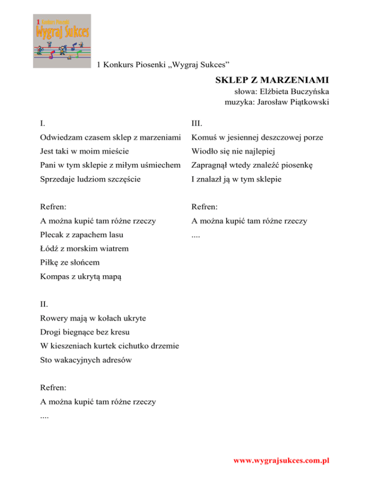 1 Konkurs Piosenki „Wygraj Sukces” SKLEP Z MARZENIAMI słowa: Elżbieta Buczyńska muzyka: Jarosław Piątkowski I. III. Odwiedzam czasem sklep z marzeniami Komuś w jesiennej deszczowej porze Jest taki w moim mieście Wiodło się nie najlepiej Pani w tym sklepie z miłym uśmiechem Zapragnął wtedy znaleźć piosenkę Sprzedaje ludziom szczęście I znalazł ją w tym sklepie Refren: Refren: A można kupić tam różne rzeczy A można kupić tam różne rzeczy Plecak z zapachem lasu .... Łódź z morskim wiatrem Piłkę ze słońcem Kompas z ukrytą mapą II. Rowery mają w kołach ukryte Drogi biegnące bez kresu W kieszeniach kurtek cichutko drzemie Sto wakacyjnych adresów Refren: A można kupić tam różne rzeczy .... www.wygrajsukces.com.pl