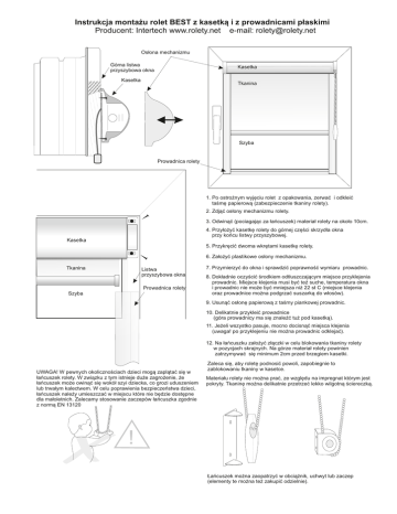 Instrukcja montażu rolet BEST z kasetką i z prowadnicami płaskimi Producent: Intertech www.rolety.net e-mail: [email protected] Osłona mechanizmu Górna listwa przyszybowa okna Kasetka Kasetka Tkanina Szyba Prowadnica rolety 1. Po ostrożnym wyjęciu rolet z opakowania, zerwać i odkleić taśmę papierową (zabezpieczenie tkaniny rolety). 2. Zdjąć osłony mechanizmu rolety. 3. Odwinąć (pociagając za łańcuszek) materiał rolety na około 10cm. 4. Przyłożyć kasetkę rolety do górnej części skrzydła okna przy końcu listwy przyszybowej. Kasetka 5. Przykręcić dwoma wkrętami kasetkę rolety. 6. Założyć plastikowe osłony mechanizmu. Tkanina Listwa przyszybowa okna Prowadnica rolety Szyba 7. Przymierzyć do okna i sprawdzić poprawność wymiaru prowadnic. 8. Dokładnie oczyścić środkiem odtłuszczającym miejsce przyklejenia prowadnic. Miejsce klejenia musi być też suche, temperatura okna i prowadnic nie może być mniejsza niż 22 st C (miejsce klejenia oraz prowadnice można podgrzać suszarką do włosów). 9. Usunąć osłonę papierową z taśmy piankowej prowadnic. 10. Delikatnie przykleić prowadnice (góra prowadnicy ma się znaleźć tuż pod kasetką). 11. Jeżeli wszystko pasuje, mocno docisnąć miejsca klejenia (uwaga! po przyklejeniu nie można prowadnic odklejać). 12. Na łańcuszku założyć złączki w celu blokowania tkaniny rolety w pozycjach skrajnych. Na górze materiał rolety powinien zatrzymywać się minimum 2cm przed brzegiem kasetki. UWAGA! W pewnych okolicznościach dzieci mogą zaplątać się w łańcuszek rolety. W związku z tym istnieje duże zagrożenie, że łańcuszek może owinąć się wokół szyi dziecka, co grozi uduszeniem lub trwałym kalectwem. W celu poprawienia bezpieczeństwa dzieci, łańcuszek należy umieszczać w miejscu które nie będzie dostępne dla małoletnich. Zalecamy stosowanie zaczepów łańcuszka zgodnie z normą EN 13120 Zaleca się, aby roletę podnosić powoli, zapobiegnie to zablokowaniu tkaniny w kasetce. Materiału rolety nie można prać, ze względu na impregnat którym jest pokryty. Tkaninę można delikatnie przetrzeć lekko wilgotną ściereczką. ! Łańcuszek można zaopatrzyć w obciążnik, uchwyt lub zaczep (elementy te można też zakupić odzielnie).