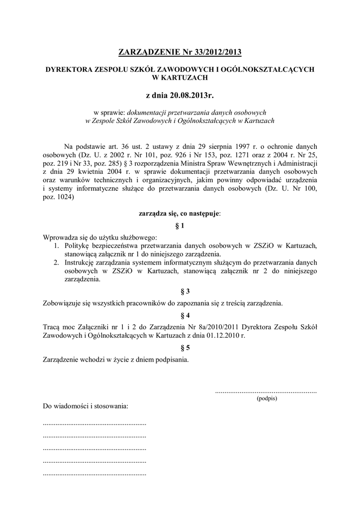 ZARZĄDZENIE Nr 33/2012/2013 DYREKTORA ZESPOŁU SZKÓŁ ZAWODOWYCH I OGÓLNOKSZTAŁCĄCYCH W KARTUZACH z dnia 20.08.2013r. w sprawie: dokumentacji przetwarzania danych osobowych w Zespole Szkół Zawodowych i Ogólnokształcących w Kartuzach Na podstawie art. 36 ust. 2 ustawy z dnia 29 sierpnia 1997 r. o ochronie danych osobowych (Dz. U. z 2002 r. Nr 101, poz. 926 i Nr 153, poz. 1271 oraz z 2004 r. Nr 25, poz. 219 i Nr 33, poz. 285) § 3 rozporządzenia Ministra Spraw Wewnętrznych i Administracji z dnia 29 kwietnia 2004 r. w sprawie dokumentacji przetwarzania danych osobowych oraz warunków technicznych i organizacyjnych, jakim powinny odpowiadać urządzenia i systemy informatyczne służące do przetwarzania danych osobowych (Dz. U. Nr 100, poz. 1024) zarządza się, co następuje: §1 Wprowadza się do użytku służbowego: 1. Politykę bezpieczeństwa przetwarzania danych osobowych w ZSZiO w Kartuzach, stanowiącą załącznik nr 1 do niniejszego zarządzenia. 2. Instrukcję zarządzania systemem informatycznym służącym do przetwarzania danych osobowych w ZSZiO w Kartuzach, stanowiącą załącznik nr 2 do niniejszego zarządzenia. §3 Zobowiązuje się wszystkich pracowników do zapoznania się z treścią zarządzenia. §4 Tracą moc Załączniki nr 1 i 2 do Zarządzenia Nr 8a/2010/2011 Dyrektora Zespołu Szkół Zawodowych i Ogólnokształcących w Kartuzach z dnia 01.12.2010 r. §5 Zarządzenie wchodzi w życie z dniem podpisania. ...................................................... (podpis) Do wiadomości i stosowania: ......................................................... ......................................................... ......................................................... ......................................................... ......................................................... Załącznik nr 1 do zarządzenia nr 33/12/13 Dyrektora ZSZiO w Kartuzach z dnia 20.08.2013r. POLITYKA BEZPIECZEŃSTWA przetwarzania danych osobowych w Zespole Szkół Zawodowych i Ogólnokształcących w Kartuzach §1 Postanowienia ogólne 1. Polityka bezpieczeństwa przetwarzania danych osobowych w ZSZiO w Kartuzach zwana dalej ,,Polityką bezpieczeństwa” określa tryb i zasady ochrony danych osobowych przetwarzanych w Zespole Szkół Zawodowych i Ogólnokształcących w Kartuzach. 2. Ilekroć w Polityce bezpieczeństwa jest mowa o: 1) ustawie – rozumie się przez to ustawę z dnia 29 sierpnia 1997 r. o ochronie danych osobowych, 1) rozporządzeniu – rozumie się przez to rozporządzenie Ministra Spraw Wewnętrznych i Administracji z dnia 29 kwietnia 2004 r. w sprawie dokumentacji przetwarzania danych osobowych oraz warunków technicznych i organizacyjnych, jakim powinny odpowiadać urządzenia i systemy informatyczne służące do przetwarzania danych osobowych, 2) danych osobowych - w rozumieniu ustawy za dane osobowe uważa się wszelkie informacje dotyczące zidentyfikowanej lub możliwej do zidentyfikowania osoby fizycznej, 3) zbiorze danych osobowych – rozumie się przez to każdy posiadający strukturę zestaw danych o charakterze osobowym, dostępnych według określonych kryteriów niezależnie od tego, czy zestaw ten jest rozproszony lub podzielony funkcjonalnie, 4) przetwarzaniu danych – rozumie się przez to jakiekolwiek operacje wykonywane na danych osobowych, takie jak zbieranie, utrwalanie, przechowywanie, opracowywanie, zmienianie, udostępnianie i usuwanie, a zwłaszcza te, które wykonuje się w systemach informatycznych, 5) systemie informatycznym – rozumie się przez to zespół współpracujących ze sobą urządzeń, programów, procedury przetwarzania informacji i narzędzi programowych zastosowanych w celu przetwarzania danych, 6) zabezpieczeniu danych w systemie informatycznym – rozumie się przez to wdrażanie i eksploatację stosowanych środków technicznych i organizacyjnych zapewniających ochronę danych przed ich nieuprawnionym przetwarzaniem, 7) usuwaniu danych – rozumie się przez to zniszczenie danych osobowych lub taką ich modyfikację, która nie pozwoli na ustalenie tożsamości osoby, której dane dotyczą, 8) ZSZiO – rozumie się przez to Zespół Szkół Zawodowych i Ogólnokształcących w Kartuzach, 9) dyrektorze – rozumie się przez Dyrektora ZSZiO w Kartuzach, 10) administratorze danych osobowych – rozumie się przez to dyrektora szkoły, 11) administratorze bezpieczeństwa informacji – rozumie się przez to osobę wyznaczoną przez administratora danych nadzorującą przestrzegania zasad ochrony, 12) administratorze systemu informatycznego – rozumie się przez to osobę wyznaczoną przez administratora danych odpowiedzialnego za funkcjonowanie systemu informatycznego, 13) użytkowniku – rozumie się przez to użytkownika systemu, pracownika ZSZiO upoważnionego przez administratora danych do przetwarzania danych osobowych, 14) identyfikatorze użytkownika (login) - ciąg znaków literowych, cyfrowych lub innych, jednoznacznie identyfikujący osobę upoważnioną do przetwarzania danych osobowych w systemie informatycznym, 15) haśle – rozumie się przez to ciąg znaków literowych, cyfrowych lub innych, znany jedynie osobie uprawnionej do pracy w systemie informatycznym, 16) uwierzytelnieniu – rozumie się przez to działanie, którego celem jest weryfikacja deklarowanej tożsamości podmiotu, 17) integralności danych – rozumie się przez to właściwość zapewniającą, że dane osobowe nie zostały zmienione lub zniszczone w sposób nieautoryzowany, 18) raporcie – rozumie się przez to przygotowane przez system informatyczny zestawienia zakresu i treści przetwarzanych danych, 19) poufności danych – rozumie się przez to właściwość zapewniającą, że dane nie są udostępnione nieupoważnionym podmiotom. 3. Polityka bezpieczeństwa zawiera: 1) zasady ochrony dostępu do danych osobowych, 2) kontrolę zabezpieczenia danych osobowych w systemie informatycznym, 3) tryb postępowan