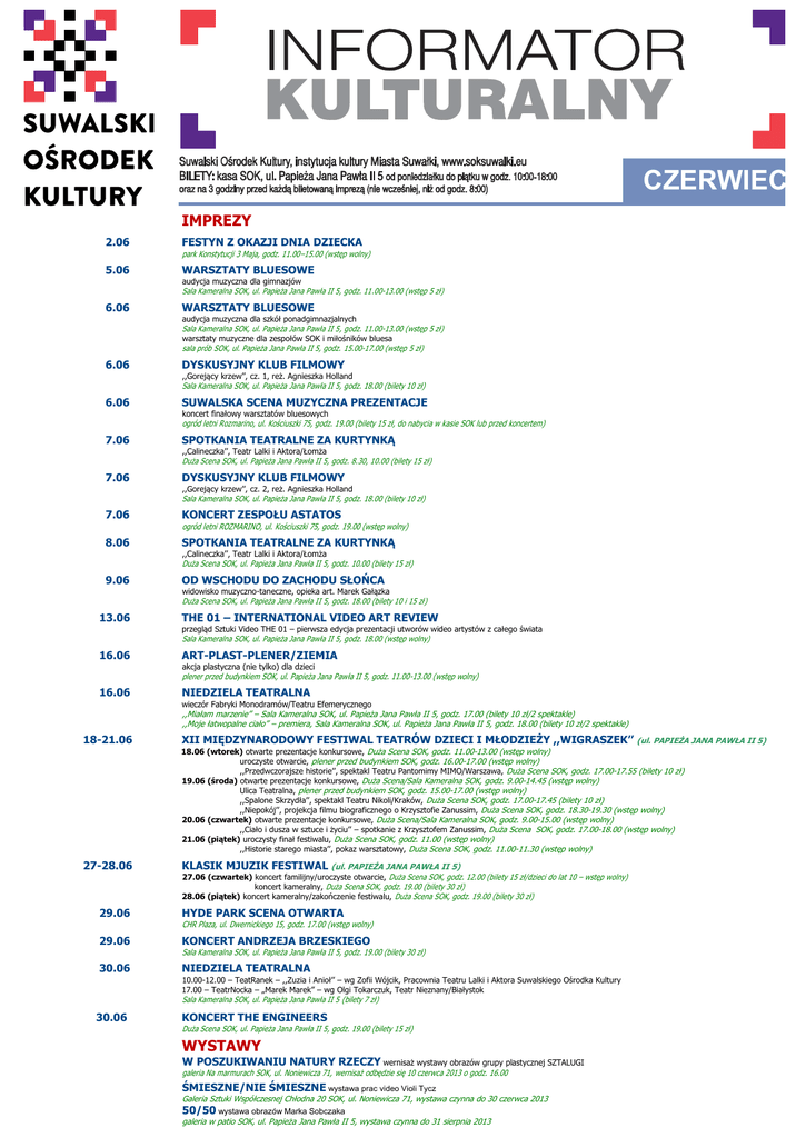 CZERWIEC IMPREZY 2.06 FESTYN Z OKAZJI DNIA DZIECKA 5.06 WARSZTATY BLUESOWE park Konstytucji 3 Maja, godz. 11.00–15.00 (wstęp wolny) audycja muzyczna dla gimnazjów Sala Kameralna SOK, ul. Papieża Jana Pawła II 5, godz. 11.00-13.00 (wstęp 5 zł) 6.06 WARSZTATY BLUESOWE audycja muzyczna dla szkół ponadgimnazjalnych Sala Kameralna SOK, ul. Papieża Jana Pawła II 5, godz. 11.00-13.00 (wstęp 5 zł) warsztaty muzyczne dla zespołów SOK i miłośników bluesa sala prób SOK, ul. Papieża Jana Pawła II 5, godz. 15.00-17.00 (wstęp 5 zł) 6.06 DYSKUSYJNY KLUB FILMOWY ,,Gorejący krzew’’, cz. 1, reż. Agnieszka Holland Sala Kameralna SOK, ul. Papieża Jana Pawła II 5, godz. 18.00 (bilety 10 zł) 6.06 SUWALSKA SCENA MUZYCZNA PREZENTACJE koncert finałowy warsztatów bluesowych ogród letni Rozmarino, ul. Kościuszki 75, godz. 19.00 (bilety 15 zł, do nabycia w kasie SOK lub przed koncertem) 7.06 SPOTKANIA TEATRALNE ZA KURTYNKĄ ,,Calineczka’’, Teatr Lalki i Aktora/Łomża Duża Scena SOK, ul. Papieża Jana Pawła II 5, godz. 8.30, 10.00 (bilety 15 zł) 7.06 DYSKUSYJNY KLUB FILMOWY ,,Gorejący krzew’’, cz. 2, reż. Agnieszka Holland Sala Kameralna SOK, ul. Papieża Jana Pawła II 5, godz. 18.00 (bilety 10 zł) 7.06 KONCERT ZESPOŁU ASTATOS 8.06 SPOTKANIA TEATRALNE ZA KURTYNKĄ ogród letni ROZMARINO, ul. Kościuszki 75, godz. 19.00 (wstęp wolny) ,,Calineczka’’, Teatr Lalki i Aktora/Łomża Duża Scena SOK, ul. Papieża Jana Pawła II 5, godz. 10.00 (bilety 15 zł) 9.06 OD WSCHODU DO ZACHODU SŁOŃCA widowisko muzyczno-taneczne, opieka art. Marek Gałązka Duża Scena SOK, ul. Papieża Jana Pawła II 5, godz. 18.00 (bilety 10 i 15 zł) 13.06 THE 01 – INTERNATIONAL VIDEO ART REVIEW przegląd Sztuki Video THE 01 – pierwsza edycja prezentacji utworów wideo artystów z całego świata Sala Kameralna SOK, ul. Papieża Jana Pawła II 5, godz. 18.00 (wstęp wolny) 16.06 ART-PLAST-PLENER/ZIEMIA akcja plastyczna (nie tylko) dla dzieci plener przed budynkiem SOK, ul. Papieża Jana Pawła II 5, godz. 11.00-13.00 (wstęp wolny) 16.06 NIEDZIELA TEATRALNA wieczór Fabryki Monodramów/Teatru Efemerycznego ,,Miałam marzenie’’ – Sala Kameralna SOK, ul. Papieża Jana Pawła II 5, godz. 17.00 (bilety 10 zł/2 spektakle) ,,Moje łatwopalne ciało’’ – premiera, Sala Kameralna SOK, ul. Papieża Jana Pawła II 5, godz. 18.00 (bilety 10 zł/2 spektakle) 18-21.06 27-28.06 XII MIĘDZYNARODOWY FESTIWAL TEATRÓW DZIECI I MŁODZIEŻY ,,WIGRASZEK’’ (ul. PAPIEŻA JANA PAWŁA II 5) 18.06 (wtorek) otwarte prezentacje konkursowe, Duża Scena SOK, godz. 11.00-13.00 (wstęp wolny) uroczyste otwarcie, plener przed budynkiem SOK, godz. 16.00-17.00 (wstęp wolny) ,,Przedwczorajsze historie’’, spektakl Teatru Pantomimy MIMO/Warszawa, Duża Scena SOK, godz. 17.00-17.55 (bilety 10 zł) 19.06 (środa) otwarte prezentacje konkursowe, Duża Scena/Sala Kameralna SOK, godz. 9.00-14.45 (wstęp wolny) Ulica Teatralna, plener przed budynkiem SOK, godz. 15.00-17.00 (wstęp wolny) ,,Spalone Skrzydła’’, spektakl Teatru Nikoli/Kraków, Duża Scena SOK, godz. 17.00-17.45 (bilety 10 zł) ,,Niepokój’’, projekcja filmu biograficznego o Krzysztofie Zanussim, Duża Scena SOK, godz. 18.30-19.30 (wstęp wolny) 20.06 (czwartek) otwarte prezentacje konkursowe, Duża Scena/Sala Kameralna SOK, godz. 9.00-15.00 (wstęp wolny) ,,Ciało i dusza w sztuce i życiu’’ – spotkanie z Krzysztofem Zanussim, Duża Scena SOK, godz. 17.00-18.00 (wstęp wolny) 21.06 (piątek) uroczysty finał festiwalu, Duża Scena SOK, godz. 11.00 (wstęp wolny) ,,Historie starego miasta’’, pokaz warsztatowy, Duża Scena SOK, godz. 11.00-11.30 (wstęp wolny) KLASIK MJUZIK FESTIWAL (ul. PAPIEŻA JANA PAWŁA II 5) 27.06 (czwartek) koncert familijny/uroczyste otwarcie, Duża Scena SOK, godz. 12.00 (bilety 15 zł/dzieci do lat 10 – wstęp wolny) koncert kameralny, Duża Scena SOK, godz. 19.00 (bilety 30 zł) 28.06 (piątek) koncert kameralny/zakończenie festiwalu, Duża Scena SOK, godz. 19.00 (bilety 30 zł) 29.06 HYDE PARK SCENA OTWARTA 29.06 KONCERT ANDRZEJA BRZESKIEGO 30.06 NIEDZIELA TEATRALNA CHR Plaza, ul. Dwernickiego 15, godz. 17.00 (wstęp wolny) Sala Kameralna SOK, ul. Papieża Jana Pawła II 5, godz. 19.00 (bilety 30 zł) 10.00-12.00 – TeatRanek – ,,Zuzia i Anioł’’ – wg Zofii Wójcik, Pracownia Teatru Lalki i Aktora Suwalskiego Ośrodka Kultury 17.00 – TeatrNocka – „Marek Marek” – wg Olgi Tokarczuk, Teatr Nieznany/Białystok Sala Kameralna SOK, ul. Papieża Jana Pawła II 5 (bilety 7 zł) 30.06 KONCERT THE ENGINEERS Duża Scena SOK, ul. Papieża Jana Pawła II 5, godz. 19.00 (bilety 15 zł) WYSTAWY W POSZUKIWANIU NATURY RZECZY wernisaż wystawy obrazów grupy plastycznej SZTALUGI galeria Na marmurach SOK, ul. Noniewicza 71, wernisaż odbędzie się 10 czerwca 2013 o godz. 16.00 ŚMIESZNE/NIE ŚMIESZNE wystawa prac video Violi Tycz Galeria Sztuki Współczesnej Chłodna 20 SOK, ul. Noniewicza 71, wystawa czynna do 30 czerwca 2013 50/50 wystawa obrazów Marka Sobczaka galeria w patio SOK, ul. Papieża Jana Pawła II 5, wystawa czynna do 31 sierpnia 2013