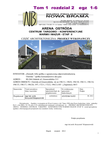 Tom 1 rozdział 2 egz 1-6 ARENA OSTRÓDA CENTRUM TARGOWO – KONFERENCYJNE WARMII I MAZUR - ETAP II CZĘŚĆ ARCHITEKTONICZNA- PROJEKT WYKONAWCZY INWESTOR: „Demuth Alfa spółka z ograniczoną odpowiedzialnością Ostróda ” spółka komandytowo-akcyjna ADRES : 80-266 Gdańsk ul. Grunwaldzka 211 ADRES OBIEKTU: Ostróda ul.Grunwaldzka dz nr:196/11; 196/8; 196/10; 196/11; 196/14; 196/15; 196/17; 196/24; 197; 172/1; 172/2; 196/2 (185 - j.Sajmino); 60/3 Stanowisko Tytuł zawodowy Imię i nazwisko Projektował mgr inż. arch. Specjalność uprawnień bud. do projektowania architektura Nr ewidencyjny uprawnień budowlanych Data Podpis AN/8346/16/83 08. 2012 Krzysztof Kiepuszewski Oświadczenie: Zgodnie z wymogiem art.20 ust 4 ustawy z dn.7 lipca 1994 roku Prawo budowlane (tekst jednolity: Dz.U. z dn.2006 r. Nr 156, poz.1118 z późniejszymi zmianami ) oświadczam, że - PROJEKT ARCHITEKTONICZNY ARENA OSTRÓDA CENTRUM TARGOWO – KONFERENCYJNE WARMII I MAZUR ETAP II został sporządzony zgodnie z obowiązującymi przepisami oraz zasadami wiedzy technicznej. Podpis projektanta mgr inż.arch. Krzysztof Kiepuszewski Słupsk sierpień 2012 1 1.SPIS RYSUNKÓW Nr rys. Tytuł rysunku Skala rys 1. Rzut poziomu – 500 = 105 m npm 1 : 250 2. Rzut poziomu +/- 0,00=110m npm 1 : 250 3. Rzut poziomu +350 1 : 250 4. Rzut poziomu +910 1 : 250 5. Rzut dachu 1 : 250 6. Przekroje poprzeczne 1 : 250 7. Elewacje 1 : 250 7.1 8. Elewacje – podkonstrukcje okładzin Cedral Zestawienie drzwi wewnętrznych 1: 250 1 : 100 9. Zestawienie ślusarki zewnętrznej - 10. Zestawienie witryn - 11. Hala nr 4 (łącznik) – strefa wejścia nr 1 1:75 12. Hala nr 4 (łącznik) – pomieszczenie obsługi 1:50 13. Hala nr 4 (łącznik) – strefa klienta 1:50 14. Hala nr 4 (łącznik) – strefa wejścia nr 2 1:75 15. Hala nr 5 – strefa wejścia nr 1 1:75 16. Hala nr 5 – zespół pomieszczeń sanitarnych nr 1 1:50 17. Hala nr 5 – kawiarnia 1:50 18. Hala nr 5 – strefa wejścia nr 2 1:50 19. Hala nr 6 – zespół pomieszczeń sanitarnych nr 1 1:50 20. Hala nr 6 – strefa wejścia nr 1 1:75 21. Hala nr 6 – zespół pomieszczeń sanitarnych nr 2 1:50 22. Pasaż – strefa wejścia 1:75 23. Hala nr 5 – zespół pomieszczeń sanitarnych nr 2 1:50 24. Poziom +3,50 – pomieszczenie techniczne nr 1 1:75 25. Poziom +3,50 – pomieszczenie techniczne nr 2 1:75 26. Poziom +3,50 – pomieszczenie techniczne nr 3 1:75 27. Poziom +3,50 – pomieszczenie techniczne nr 4 1:75 28. Poziom +9,10 – pomieszczenie techniczne nr 1 (cz.1) 1:75 29. Poziom +9,10 – pomieszczenie techniczne nr 1 (cz.2) 1:75 30. Poziom +9,10 – pomieszczenie techniczne nr 2 1:75 31. Poziom +9,10 – pomieszczenie techniczne nr 3 1:75 2 32. Przekrój 1 : 100 33. Przekrój 1 : 100 34. Przekrój 1 : 100 35. Rozwiązania materiałowe ścian 36. Daszki nad wejściami – hala 5 i 6 1 : 50 37. Schemat rozwiązania daszków szklanych 1 : 50 38. Wyłaz dachowy 1 : 10 39. Wyjście na dach 1 : 10 40. Klapa dymowa 1 : 10 41. Progi przy bramach i wejściach 1 : 10 42. Zestawienie balustrad 1 : 100 43. Schemat rozwiązań balustrad 1 : 10 44. Schemat ściany przesuwnej 1 : 10 45. Schody ruchome 1 : 100 46. Zespół wind osobowych 1 : 25 47. Uszczelnienie dylatacji z izolacją przeciwpożarową 1 : 20 48. Uszczelnienie dylatacji 1 : 20 49. Schemat rozwiązania fontann 1 : 100 50. Roleta zamykająca szatnię 51. Schody zewnętrzne przy hali nr 5 1 : 75 51A Schody zewnętrzne przy hali nr 6 1 : 75 52. Wycieraczka zewnętrzna z odwodnieniem 1 : 20 53. Detal obróbki otworów w ścianie warstwowej 1 : 10 54. Połączenie witryn hali nr 4 z halą nr 5 1 : 20 55. Wpusty dachowe 1 : 20 56. Detal montażu okładziny ściennej 1 : 20 - 1 : 10/1 : 100 3 OPIS TECHNICZNY- ARCHITEKTURA 1. PODSTAWA OPRACOWANIA a) Uchwała Nr X/75/99 z dn. 30.06.1990 r. w sprawie zmiany uchwalenia mpzp miasta Ostródy w obrębie dzielnicy Zajezierze b) Uchwała nr LIII/384/2006 Rady Miejskiej w Ostródzie z dn. 26.04.2006 r. w sprawie zmiany uchwalenia mpzp miasta Ostródy w obrębie dzielnicy Zajezierze. c) Uchwała Nr LV/314/2010 Rady Miejskiej w Ostródzie z dnia 23 czerwca 2010 r w sprawie uchwalenia miejscowego planu zagospodarowania przestrzennego miasta Ostródy w obrębie dzielnicy Zajezierze. d)Pismo UM Ostróda GP.6845.107.2012 z dn. 05.06.2012 e) Mapa sytuacyjno - wysokościowa w skali 1:500 wykonana w 2009 roku przez „Usługi Geodezyjne” Wiesław Rudnicki w Ostródzie f) Dokumentacja geotechniczna badań podłoża gruntowego opracowana w kwietniu 2012 przez Zakład Geologiczny „ Eljot” mgr inż. Lucjan Jureko w Słupsku g) Ustalenia materiałowe i funkcjonalne z inwestorem 2.CEL OPRACOWANIA Celem opracowania jest projekt wykonawczy budynku CENTRUM TARGOWO – KONFERENCYJNEGO w nawiązaniu do zespołu budynków o funkcji wystawienniczo- handlowej wraz z niezbędną infrastrukturą techniczną oraz dojazdami i miejscami parkingowymi. 3.DANE OGÓLNE 3.1 Budynek projektowany - poziom -5,0 Ilość kondygnacji: - Maksymalna wysokość bryły budynku 1 15,30 m - Maksymalna wysokość urządzeń technicznych budynku 15,60 m - Maksymalna długość budynku 61,40 m - Maksymalna szerokość budynku 48,70 m - Powierzchnia zabudowy łącznie 6 049,56 m2 4 201,05 m2 W tym kotłownia 46 454,57 m3 - Kubatura: łącznik Kotłownia 1118,5 m3 - Powierzchnia całkowita 6 049,56 m2 - Powierzchnia użytkowa (Pu): 5 743,69 m2 3.2 Budynek projektowany - poziom 0,0; 3,3; 9,1 - Ilość kondygnacji: 3 - Maksymalna wysokość bryły budynku 14,15 m - Powierzchnia zabudowy (Pz): 22 069,52 m2 - Kubatura 270 031,24 m3 - Powierzchnia całkowita 29 574,20 m2 - Powierzchnia użytkowa (Pu): 23 850,99 m2 w tym – Pomieszczenia na poziomie 0,00 poziom +3,50 21 015,166 m2 Pomieszczenia techniczne – poziom +3,50 1 199,00 m2 Pomieszczenia techniczne – poziom +9,10 1 636,83 m2 4. OPIS LOKALIZACJI INWESTYCJI Teren lokalizacji budynku centrum targowo-konferencyjnego etapu II znajduje się w Ostródzie przy ul Grunwal