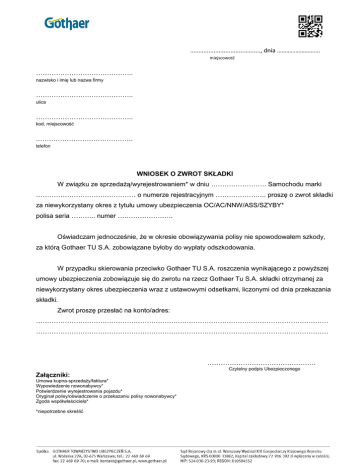 .........................................., dnia ………………………. miejscowość …………………………………….. nazwisko i imię lub nazwa firmy …………………………………….. ulica …………………………………….. kod, miejscowość .……………………………………. telefon WNIOSEK O ZWROT SKŁADKI W związku ze sprzedażą/wyrejestrowaniem* w dniu ……………………. Samochodu marki ……………………………………… o numerze rejestracyjnym ………………….. proszę o zwrot składki za niewykorzystany okres z tytułu umowy ubezpieczenia OC/AC/NNW/ASS/SZYBY* polisa seria ……….. numer ……………………. Oświadczam jednocześnie, że w okresie obowiązywania polisy nie spowodowałem szkody, za którą Gothaer TU S.A. zobowiązane byłoby do wypłaty odszkodowania. W przypadku skierowania przeciwko Gothaer TU S.A. roszczenia wynikającego z powyższej umowy ubezpieczenia zobowiązuje się do zwrotu na rzecz Gothaer Tu S.A. składki otrzymanej za niewykorzystany okres ubezpieczenia wraz z ustawowymi odsetkami, liczonymi od dnia przekazania składki. Zwrot proszę przesłać na konto/adres: …………………………………………………………………………………………………………………… …………………………………………………………………………………………………………………… …………………………………………. Czytelny podpis Ubezpieczonego Załączniki: Umowa kupna-sprzedaży/faktura* Wypowiedzenie nowonabywcy* Potwierdzenie wyrejestrowania pojazdu* Oryginał polisy/oświadczenie o przekazaniu polisy nowonabywcy* Zgoda współwłaściciela* *niepotrzebne skreślić