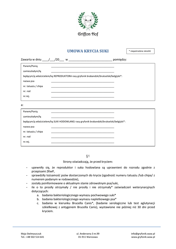 Griffon Hof UMOWA KRYCIA SUKI * niepotrzebne skreślid Zawarta w dniu ____/___/20___ w ___________________________ pomiędzy: Panem/Panią ________________________________________________ zamieszkałym/łą ________________________________________________ będącym/ą właścicielem/ką REPRODUKTORA rasy gryfonik brabandzki/brukselski/belgijski*: nazwa psa ________________________________________________ nr. tatuażu / chipa ________________________________________________ nr. rod ________________________________________________ nr.rej. ________________________________________________ a: Panem/Panią ________________________________________________ zamieszkałym/łą ________________________________________________ będącym/ą właścicielem/ką SUKI HODOWLANEJ rasy gryfonik brabandzki/brukselski/belgijski*: nazwa psa ________________________________________________ nr. tatuażu / chipa ________________________________________________ nr. rod ________________________________________________ nr.rej. ________________________________________________ §1 Strony oświadczają, że przed kryciem: - upewniły się, że reproduktor i suka hodowlana są uprawnieni do rozrodu zgodnie z przepisami ZKwP, sprawdziły tożsamośd psów dostarczonych do krycia (zgodnośd numeru tatuażu /lub chipa/ z numerem podanym w rodowodzie), zostały poinformowane o aktualnym stanie zdrowotnym psa/suki, ile o to prosiły otrzymały / nie prosiły i nie otrzymały* zaświadczeo weterynaryjnych dotyczących: a. badania bakteriologicznego wymazu pochwowego suki* b. badania bakteriologicznego wymazu napletkowego psa* c. badania w kierunku Brucella Canis*, (badanie serologiczne lub test aglutynacji szkiełkowej z antygenem Brucella Canis), wystawione nie później niż 30 dni przed kryciem. Maja Stelmaszczuk Tel.: +48 502 514 641 ul. Andersena 3 m.99 01-911 Warszawa [email protected] www.gryfonik.waw.pl Griffon Hof §2 Strony stwierdzają, że suka została pokryta przez w/w psa w dniu/dniach*: a) ___/___/ 20___r. b) ___/___/ 20___r. c) ___/___/ 20___r. §3 Ekwiwalentem za krycie jest: ________ (wpisad A, B, C lub D) A. Szczenię 1. W przypadku miotu składającego się z minimum 4 żywych i odchowanych szczeniąt właściciel reproduktora wybiera w pierwszej kolejności szczenię z miotu (bez względu na płed) lub wybiera jako drugi, w, przypadku gdy właściciel suki deklaruje chęd zostawienia szczenięcia tej samej płci w swojej hodowli. 2. Wybór szczenięcia nastąpi najpóźniej w dniu rozpoczynającym okres wydawania szczeniąt nabywcom wyznaczony przez właściciela suki. 3. Wyboru i odbioru szczenięcia dokona właściciel reproduktora lub upoważniona przez niego osoba. 4. Odbiór szczenięcia nastąpi w terminie uzgodnionym przez strony, ale nie później niż w ciągu ___ dni od dnia rozpoczynającego okres wydawania szczeniąt nabywcom. 5. W przypadku nie odebrania szczenięcia w wyżej określonym terminie, właścicielowi suki należy się od właściciela reproduktora zwrot kosztów utrzymania szczenięcia i opieki weterynaryjnej za każdy dzieo zwłoki. 6. Szczenię odbierane jest razem z metryką i książeczką zdrowia (lub paszportem). B. Ekwiwalent pieniężny za szczenię 1. W przypadku miotu składającego się z mniej niż 4 żywych i odchowanych szczeniąt ekwiwalentem za krycie jest kwota ustalona w następującej wysokości: - 3 urodzone szczenięta – równowartośd pieniężna 3/4 ustalonej wartości szczeniaka - 2 urodzone szczenięta – równowartośd pieniężna 1/2 ustalonej wartości szczeniaka - 1 urodzone szczenię – równowartośd pieniężna 1/4 ustalonej wartości szczeniaka / właściciel reproduktora zrzeka się ekwiwalentu* 2. Wartośd szczenięcia strony ustalają na zł. 3. Wypłata ekwiwalentu za szczenięcia nastąpi w terminie do 7 dni od odbioru miotu przez ZKwP (data Protokołu Przeglądu Miotu) / niezwłocznie po sprzedaży pierwszego szczeniaka z miotu*. C. Należność pieniężna 1. Strony ustalają cenę (należnośd pieniężną) za krycie w wysokości zł. 2. Należnośd pieniężna zostanie wypłacona w dniu krycia / terminie uzgodnionym przez strony*: ________________________________________________ (podad termin). 3. Właścicielowi suki przysługuje kryd (podad liczbę) w umówionych terminach podczas jednej rui suki. 4. W przypadku braku ciąży właścicielowi suki przysługuje / nie przysługuje* - zwrot % (podad wartośd) ustalonej ceny krycia* - możliwośd bezpłatnego pokrycia suki w kolejnej rui tym samym lub innym psem stanowiącym własnośd właściciela reproduktora*. D. Inne rozliczenie – opisad sposób rozliczenia w osobnym załączniku. Maja Stelmaszczuk Tel.: +48 502 514 641 ul. Andersena 3 m.99 01-911 Warszawa [email protected] www.gryfonik.waw.pl Griffon Hof §4 1. Właściciel suki jest obowiązany zawiadomid właściciela psa o urodzeniu się szczeniąt oraz o ilości szczeniąt w miocie w ciągu 3 dni po porodzie. 2. W przypadku braku ciąży lub urodzenia się martwych szczeniąt właściciel suki zobowiązany jest powiadomid właściciela reproduktora najszybciej jak to będzie możliwe, jednak nie później niż w ciągu tygodnia po spodziewanym terminie narodzin. §5 Właściciel suki dysponuje formularzem KARTY KRYCIA, którego wypełnienie i podpisanie przez Strony nastąpi po kryciu. §6 Do umowy dołączono __ / nie dołączono załączników*. §7 1. W sprawach nie określonych w niniejszej umowie mają zastosowanie przepisy Związku Kynologicznego w Polsce oraz Kodeksu Cywilnego. 2. Umowa została sporządzona w dwóch jednobrzmiących egzemplarzach Podpis właściciela suki Podpis właściciela reproduktora Załączniki: Maja Stelmaszczuk Tel.: +48 502 514 641 ul. Andersena 3 m.99 01-911 Warszawa [email protected] www.gryfonik.waw.pl