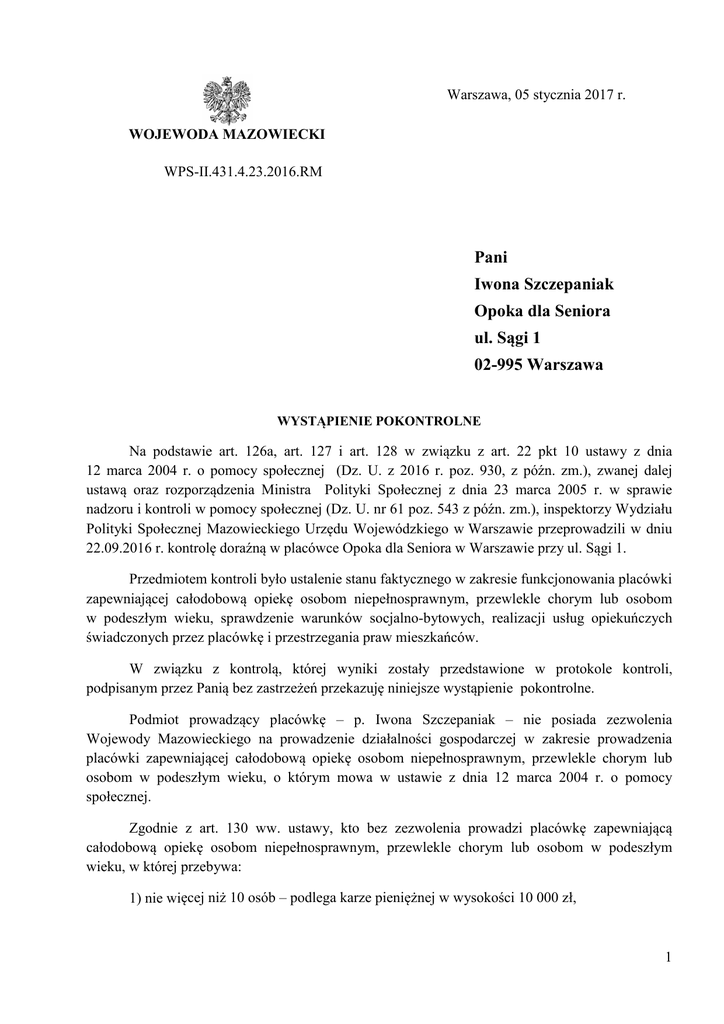 Warszawa, 05 stycznia 2017 r. WOJEWODA MAZOWIECKI WPS-II.431.4.23.2016.RM Pani Iwona Szczepaniak Opoka dla Seniora ul. Sągi 1 02-995 Warszawa WYSTĄPIENIE POKONTROLNE Na podstawie art. 126a, art. 127 i art. 128 w związku z art. 22 pkt 10 ustawy z dnia 12 marca 2004 r. o pomocy społecznej (Dz. U. z 2016 r. poz. 930, z późn. zm.), zwanej dalej ustawą oraz rozporządzenia Ministra Polityki Społecznej z dnia 23 marca 2005 r. w sprawie nadzoru i kontroli w pomocy społecznej (Dz. U. nr 61 poz. 543 z późn. zm.), inspektorzy Wydziału Polityki Społecznej Mazowieckiego Urzędu Wojewódzkiego w Warszawie przeprowadzili w dniu 22.09.2016 r. kontrolę doraźną w placówce Opoka dla Seniora w Warszawie przy ul. Sągi 1. Przedmiotem kontroli było ustalenie stanu faktycznego w zakresie funkcjonowania placówki zapewniającej całodobową opiekę osobom niepełnosprawnym, przewlekle chorym lub osobom w podeszłym wieku, sprawdzenie warunków socjalno-bytowych, realizacji usług opiekuńczych świadczonych przez placówkę i przestrzegania praw mieszkańców. W związku z kontrolą, której wyniki zostały przedstawione w protokole kontroli, podpisanym przez Panią bez zastrzeżeń przekazuję niniejsze wystąpienie pokontrolne. Podmiot prowadzący placówkę – p. Iwona Szczepaniak – nie posiada zezwolenia Wojewody Mazowieckiego na prowadzenie działalności gospodarczej w zakresie prowadzenia placówki zapewniającej całodobową opiekę osobom niepełnosprawnym, przewlekle chorym lub osobom w podeszłym wieku, o którym mowa w ustawie z dnia 12 marca 2004 r. o pomocy społecznej. Zgodnie z art. 130 ww. ustawy, kto bez zezwolenia prowadzi placówkę zapewniającą całodobową opiekę osobom niepełnosprawnym, przewlekle chorym lub osobom w podeszłym wieku, w której przebywa: 1) nie więcej niż 10 osób – podlega karze pieniężnej w wysokości 10 000 zł, 1 2) więcej niż 10 osób – podlega karze pieniężnej w wysokości 20 000 zł. Kto po uprawomocnieniu się decyzji o nałożeniu kary pieniężnej za prowadzenie bez zezwolenia wojewody placówki zapewniającej całodobową opiekę osobom niepełnosprawnym, przewlekle chorym lub osobom w podeszłym wieku nie zaprzestał jej prowadzenia, podlega karze pieniężnej w wysokości 40.000 zł. W wyniku działań kontrolnych ustalono następujący stan faktyczny. Placówkę pod ww. adresem prowadzi Pani od 2013 r. bez wymaganego zezwolenia wojewody. Budynek, w którym prowadzona jest placówka jest trzykondygnacyjny: parter, piętro i poddasze. Placówka dysponuje schodołazem. Z informacji udzielonej przez kierownika wynika, że jest on używany sporadycznie. W budynku nie ma windy. Teren wokół budynku ogrodzony, zagospodarowany. Budynek zaopatrzony w podstawowe media. Placówka przeznaczona jest dla 25 osób w podeszłym wieku i przewlekle chorych, dla których świadczone są usługi przez całą dobę. W dniu kontroli w placówce przebywało 20 osób. Najmłodszy mieszkaniec miał 70 lat, najstarszy 94 lata. Wśród mieszkańców była 1 osoba leżąca, 6 samodzielnych, pozostałe wymagały wspomagania w podstawowych czynnościach życiowych. Główne schorzenia występujące u mieszkańców wynikały z podeszłego wieku. Ponadto 16 mieszkańców korzystało z pieluchomajtek, 1 osoba była cewnikowana. W trakcie kontroli stwierdzono, że w budynku placówki znajdują się: 2 pokoje jednoosobowe, 4 pokoje dwuosobowe, 5 pokoi trzyosobowych. Powierzchnia pokoi była zgodna z obowiązującym standardem. W jednym z pokoi trzyosobowych wyposażenie było niekompletne (brakowało stołu, krzeseł i szafki przyłóżkowej). Z pomieszczeń ogólnego użytku placówka dysponuje pomieszczeniem pomocniczym do prania i suszenia. W placówce jest pokój dziennego pobytu służący jako jadalnia. W zakresie liczby łazienek i toalet placówka spełnia standard, zgodnie z którym jedna łazienka powinna być przeznaczona dla nie więcej niż 5 osób i jedna toaleta dla nie więcej niż 4 osób. W budynku znajdowały się cztery łazienki, w których były: wanna, 4 prysznice, 4 w-c, bidet, 4 umywalki. Dodatkowo były 2 toalety. Ponadto przy jednym z pokoi dwuosobowych znajdowała się łazienka, a w niej prysznic, w-c, umywalka. Nie wszystkie pomieszczenia sanitarne wyposażone były w uchwyty ułatwiające osobom mniej sprawnym samodzielne korzystanie z nich. Z informacji uzyskanej podczas kontroli wynika, że większość mieszkańców zgłoszona jest w ramach POZ do Przychodni przy ul. Mirkowskiej w Konstancinie Jeziornie. Opiekę medyczną zapewnia lekarz, który w ramach prywatnej praktyki przychodzi do mieszkańców raz w tygodniu. Koszt wizyt pokrywa właściciel placówki. Konsultacje lekarzy specjalistów realizowane są w ramach NFZ lub wizyt prywatnych, których koszt pokrywa rodzina mieszkańca. Trzy razy w tygodniu w placówce jest rehabilitant, który prowadzi zajęcia grupowe oraz indywidualne. Koszt wizyt reguluje właściciel placówki. Raz w tygodniu w placówce jest psycholog. Zatrudniony jest również terapeuta zajęciowy, z którym zajęcia odbywają się codziennie. 2 Placówka zatrudnia: pielęgniarkę, 7 opiekunek, osobę do sprzątania, rehabilitanta, terapeutę zajęciowego. Opiekę dzienną zapewniają 3 opiekunki i właścicielka, w nocy dyżur pełni 1 osoba. Pielęgniarka jest w placówce cztery razy w tygodniu. Placówka zapewnia mieszkankom pięć posiłków dziennie. Z uzyskanych informacji wynika, że kolacja podawana jest o godzinie 17:30. Zgodnie ze standardem ostatni posiłek nie powinien być podawany wcześniej niż o godzinie 18. Mieszkańcy mają możliwość korzystania z drobnych produktów żywnościowych i napojów między posiłkami. Mają również możliwość spożywania posiłków w pokoju mieszkalnym. W dniu kontroli 6 osób wymagało pomocy w spożywaniu posiłków. Z uzyskanych podczas kontroli informacji wynika, że podstawowe środki higieny osobistej, środki czystości, przybory toalet