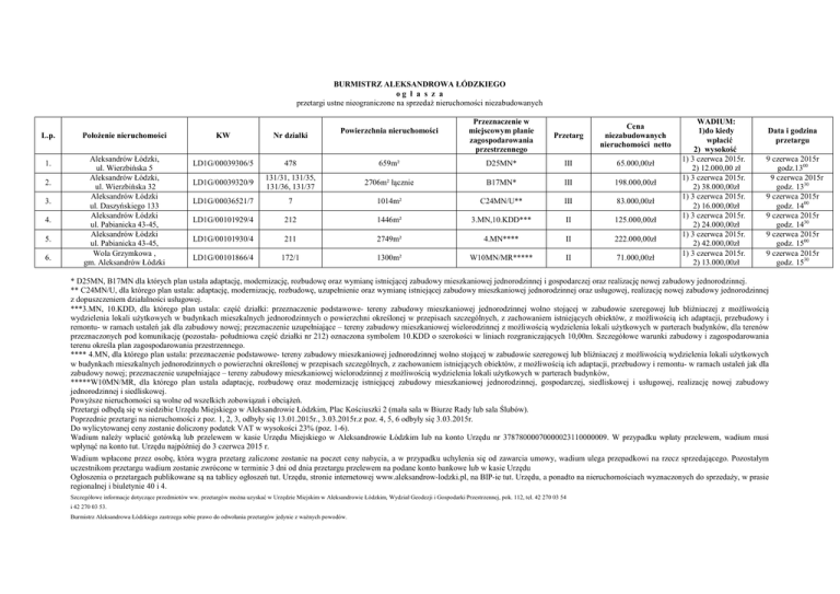 BURMISTRZ ALEKSANDROWA ŁÓDZKIEGO og ł a s z a przetargi ustne nieograniczone na sprzedaż nieruchomości niezabudowanych L.p. 1. 2. 3. 4. 5. 6. Położenie nieruchomości Aleksandrów Łódzki, ul. Wierzbińska 5 Aleksandrów Łódzki, ul. Wierzbińska 32 Aleksandrów Łódzki ul. Daszyńskiego 133 Aleksandrów Łódzki ul. Pabianicka 43-45, Aleksandrów Łódzki ul. Pabianicka 43-45, Wola Grzymkowa , gm. Aleksandrów Łódzki Przeznaczenie w miejscowym planie zagospodarowania przestrzennego Przetarg Cena niezabudowanych nieruchomości netto 659m² D25MN* III 65.000,00zł 131/31, 131/35, 131/36, 131/37 2706m² łącznie B17MN* III 198.000,00zł LD1G/00036521/7 7 1014m² C24MN/U** III 83.000,00zł LD1G/00101929/4 212 1446m² 3.MN,10.KDD*** II 125.000,00zł LD1G/00101930/4 211 2749m² 4.MN**** II 222.000,00zł LD1G/00101866/4 172/1 1300m² W10MN/MR***** II 71.000,00zł KW Nr działki LD1G/00039306/5 478 LD1G/00039320/9 Powierzchnia nieruchomości WADIUM: 1)do kiedy wpłacić 2) wysokość 1) 3 czerwca 2015r. 2) 12.000,00 zł 1) 3 czerwca 2015r. 2) 38.000,00zł 1) 3 czerwca 2015r. 2) 16.000,00zł 1) 3 czerwca 2015r. 2) 24.000,00zł 1) 3 czerwca 2015r. 2) 42.000,00zł 1) 3 czerwca 2015r. 2) 13.000,00zł Data i godzina przetargu 9 czerwca 2015r godz.1300 9 czerwca 2015r godz. 1330 9 czerwca 2015r godz. 1400 9 czerwca 2015r godz. 1430 9 czerwca 2015r godz. 1500 9 czerwca 2015r godz. 1530 * D25MN, B17MN dla których plan ustala adaptację, modernizację, rozbudowę oraz wymianę istniejącej zabudowy mieszkaniowej jednorodzinnej i gospodarczej oraz realizację nowej zabudowy jednorodzinnej. ** C24MN/U, dla którego plan ustala: adaptację, modernizację, rozbudowę, uzupełnienie oraz wymianę istniejącej zabudowy mieszkaniowej jednorodzinnej oraz usługowej, realizację nowej zabudowy jednorodzinnej z dopuszczeniem działalności usługowej. ***3.MN, 10.KDD, dla którego plan ustala: część działki: przeznaczenie podstawowe- tereny zabudowy mieszkaniowej jednorodzinnej wolno stojącej w zabudowie szeregowej lub bliźniaczej z możliwością wydzielenia lokali użytkowych w budynkach mieszkalnych jednorodzinnych o powierzchni określonej w przepisach szczególnych, z zachowaniem istniejących obiektów, z możliwością ich adaptacji, przebudowy i remontu- w ramach ustaleń jak dla zabudowy nowej; przeznaczenie uzupełniające – tereny zabudowy mieszkaniowej wielorodzinnej z możliwością wydzielenia lokali użytkowych w parterach budynków, dla terenów przeznaczonych pod komunikację (pozostała- południowa część działki nr 212) oznaczona symbolem 10.KDD o szerokości w liniach rozgraniczających 10,00m. Szczegółowe warunki zabudowy i zagospodarowania terenu określa plan zagospodarowania przestrzennego. **** 4.MN, dla którego plan ustala: przeznaczenie podstawowe- tereny zabudowy mieszkaniowej jednorodzinnej wolno stojącej w zabudowie szeregowej lub bliźniaczej z możliwością wydzielenia lokali użytkowych w budynkach mieszkalnych jednorodzinnych o powierzchni określonej w przepisach szczególnych, z zachowaniem istniejących obiektów, z możliwością ich adaptacji, przebudowy i remontu- w ramach ustaleń jak dla zabudowy nowej; przeznaczenie uzupełniające – tereny zabudowy mieszkaniowej wielorodzinnej z możliwością wydzielenia lokali użytkowych w parterach budynków, *****W10MN/MR, dla którego plan ustala adaptację, rozbudowę oraz modernizację istniejącej zabudowy mieszkaniowej jednorodzinnej, gospodarczej, siedliskowej i usługowej, realizację nowej zabudowy jednorodzinnej i siedliskowej. Powyższe nieruchomości są wolne od wszelkich zobowiązań i obciążeń. Przetargi odbędą się w siedzibie Urzędu Miejskiego w Aleksandrowie Łódzkim, Plac Kościuszki 2 (mała sala w Biurze Rady lub sala Ślubów). Poprzednie przetargi na nieruchomości z poz. 1, 2, 3, odbyły się 13.01.2015r., 3.03.2015r.z poz. 4, 5, 6 odbyły się 3.03.2015r. Do wylicytowanej ceny zostanie doliczony podatek VAT w wysokości 23% (poz. 1-6). Wadium należy wpłacić gotówką lub przelewem w kasie Urzędu Miejskiego w Aleksandrowie Łódzkim lub na konto Urzędu nr 37878000070000023110000009. W przypadku wpłaty przelewem, wadium musi wpłynąć na konto tut. Urzędu najpóźniej do 3 czerwca 2015 r. Wadium wpłacone przez osobę, która wygra przetarg zaliczone zostanie na poczet ceny nabycia, a w przypadku uchylenia się od zawarcia umowy, wadium ulega przepadkowi na rzecz sprzedającego. Pozostałym uczestnikom przetargu wadium zostanie zwrócone w terminie 3 dni od dnia przetargu przelewem na podane konto bankowe lub w kasie Urzędu Ogłoszenia o przetargach publikowane są na tablicy ogłoszeń tut. Urzędu, stronie internetowej www.aleksandrow-lodzki.pl, na BIP-ie tut. Urzędu, a ponadto na nieruchomościach wyznaczonych do sprzedaży, w prasie regionalnej i biuletynie 40 i 4. Szczegółowe informacje dotyczące przedmiotów ww. przetargów można uzyskać w Urzędzie Miejskim w Aleksandrowie Łódzkim, Wydział Geodezji i Gospodarki Przestrzennej, pok. 112, tel. 42 270 03 54 i 42 270 03 53. Burmistrz Aleksandrowa Łódzkiego zastrzega sobie prawo do odwołania przetargów jedynie z ważnych powodów.