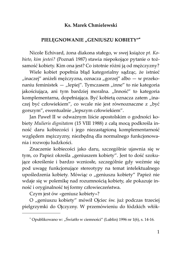 1 Ks. Marek Chmielewski PIELĘGNOWANIE „GENIUSZU KOBIETY