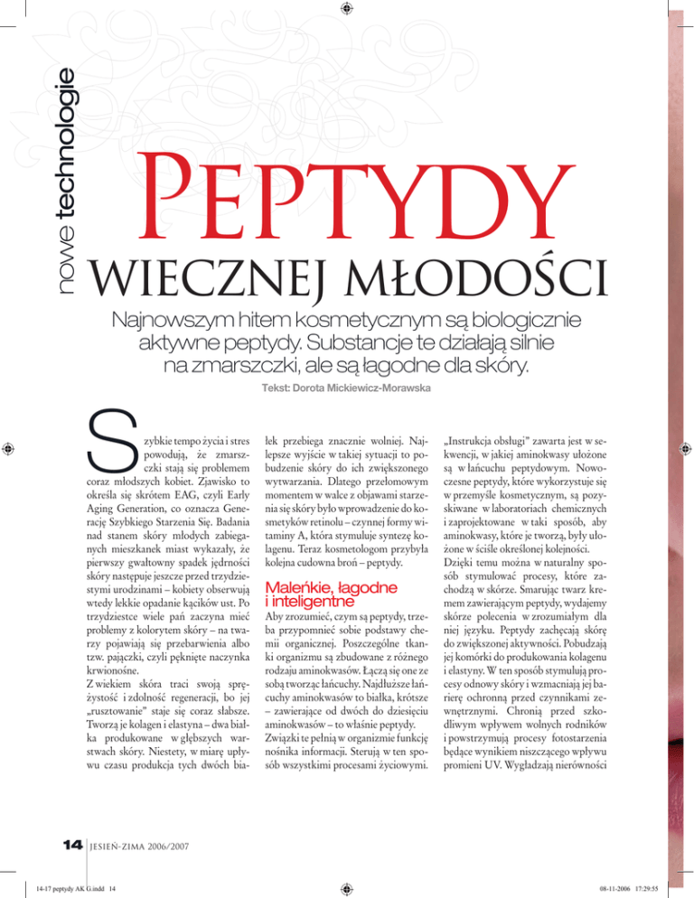 nowe technologie Peptydy wiecznej młodości Najnowszym hitem kosmetycznym są biologicznie aktywne peptydy. Substancje te działają silnie na zmarszczki, ale są łagodne dla skóry. S zybkie tempo życia i stres powodują, że zmarszczki stają się problemem coraz młodszych kobiet. Zjawisko to określa się skrótem EAG, czyli Early Aging Generation, co oznacza Generację Szybkiego Starzenia Się. Badania nad stanem skóry młodych zabieganych mieszkanek miast wykazały, że pierwszy gwałtowny spadek jędrności skóry następuje jeszcze przed trzydziestymi urodzinami – kobiety obserwują wtedy lekkie opadanie kącików ust. Po trzydziestce wiele pań zaczyna mieć problemy z kolorytem skóry – na twarzy pojawiają się przebarwienia albo tzw. pajączki, czyli pęknięte naczynka krwionośne. Z wiekiem skóra traci swoją sprężystość i zdolność regeneracji, bo jej „rusztowanie” staje się coraz słabsze. Tworzą je kolagen i elastyna – dwa białka produkowane w głębszych warstwach skóry. Niestety, w miarę upływu czasu produkcja tych dwóch bia- 14 Tekst: Dorota Mickiewicz-Morawska łek przebiega znacznie wolniej. Najlepsze wyjście w takiej sytuacji to pobudzenie skóry do ich zwiększonego wytwarzania. Dlatego przełomowym momentem w walce z objawami starzenia się skóry było wprowadzenie do kosmetyków retinolu – czynnej formy witaminy A, która stymuluje syntezę kolagenu. Teraz kosmetologom przybyła kolejna cudowna broń – peptydy. Maleńkie, łagodne i inteligentne Aby zrozumieć, czym są peptydy, trzeba przypomnieć sobie podstawy chemii organicznej. Poszczególne tkanki organizmu są zbudowane z różnego rodzaju aminokwasów. Łączą się one ze sobą tworząc łańcuchy. Najdłuższe łańcuchy aminokwasów to białka, krótsze – zawierające od dwóch do dziesięciu aminokwasów – to właśnie peptydy. Związki te pełnią w organizmie funkcję nośnika informacji. Sterują w ten sposób wszystkimi procesami życiowymi. „Instrukcja obsługi” zawarta jest w sekwencji, w jakiej aminokwasy ułożone są w łańcuchu peptydowym. Nowoczesne peptydy, które wykorzystuje się w przemyśle kosmetycznym, są pozyskiwane w laboratoriach chemicznych i zaprojektowane w taki sposób, aby aminokwasy, które je tworzą, były ułożone w ściśle określonej kolejności. Dzięki temu można w naturalny sposób stymulować procesy, które zachodzą w skórze. Smarując twarz kremem zawierającym peptydy, wydajemy skórze polecenia w zrozumiałym dla niej języku. Peptydy zachęcają skórę do zwiększonej aktywności. Pobudzają jej komórki do produkowania kolagenu i elastyny. W ten sposób stymulują procesy odnowy skóry i wzmacniają jej barierę ochronną przed czynnikami zewnętrznymi. Chronią przed szkodliwym wpływem wolnych rodników i powstrzymują procesy fotostarzenia będące wynikiem niszczącego wpływu promieni UV. Wygładzają nierówności jesień-zima 2006/2007 14-17 peptydy AK G.indd 14 08-11-2006 17:29:55 W skład kremów wchodzą takie składniki aktywne, jak: peptydy IQ To biologicznie czynne substancje nowej generacji o specyficznej budowie pozwalającej na precyzyjne wnikanie do fibroblastów – komórek skóry, w których odbywa się biosynteza kolagenu i elastyny. Tam aktywowane są geny odpowiedzialne za syntezę nowego kolagenu i elastyny. Dzięki peptydom IQ w skórze następuje proces regeneracji zniszczonych włókien podporowych. Nowy kolagen powoduje, że wyraźnie zwiększają się jędrność i elastyczność skóry, a procesy wiotczenia i jej biologicznego starzenia się są zahamowane. inteligentne biowektory ® To naturalne mikrozwiązki pochodzenia roślinnego, które hamują skurcze mięśni i rozluźniają napięte mięśnie twarzy. W efekcie wyraźnie spłycają zmarszczki mimiczne. Zwiększają też wytwarzanie oraz magazynowanie kolagenu i elastyny w skórze, co daje efekt wypełnienia zmarszczek oraz poprawienia jędrności skóry. jesień-zima 2006/2007 14-17 peptydy AK G.indd 15 15 08-11-2006 17:30:37 nowe technologie W skład serii wchodzą następujące preparaty skóry, poprawiają jej koloryt i likwidują przebarwienia. Co istotne, peptydy nie podrażniają naskórka, gdyż działają bardzo delikatnie. Nie można ich również „przedawkować”, ponieważ potrafią dostosować strategię działania do potrzeb skóry. Pobudzają i regenerują Bioaktywny krem ujędrniający z peptydami IQ na noc Wygładza zmarszczki oraz ujędrnia skłonne do wiotczenia partie twarzy i szyi. Nadaje skórze satynową gładkość, poprawia jej strukturę, elastyczność i sprężystość. pojemność: 50 ml, cena: 58 zł Bioaktywny krem ujędrniający z peptydami IQ pod oczy Spłyca zmarszczki i „kurze łapki”, poprawia elastyczność i sprężystość skóry wokół oczu, a także usuwa objawy zmęczenia i nadaje jędrność powiekom. Skóra staje się młodzieńczo elastyczna, aksamitnie gładka i świeża. pojemność: 15 ml, cena: 49 zł Bioaktywny krem ujędrniający z peptydami IQ na dzień Przeznaczony do intensywnej pielęgnacji każdego typu cery dojrzałej. Spłyca zmarszczki, ujędrnia skłonne do wiotczenia partie twarzy i szyi, poprawia sprężystość oraz elastyczność skóry i przedłuża jej młody wygląd. pojemność: 50 ml, cena: 58 zł W zależności od sposobu, w jaki peptydy działają na skórę, można je podzielić na trzy grupy. Peptydy stymulujące, zwane też aminopeptydami, sterują procesami, które zachodzą w komórkach skóry. Dają bodziec do regeneracji skaleczeń i uszkodzeń skóry. Pobudzają produkcję kolagenu i elastyny, włókien tworzących rusztowanie, dzięki któremu skóra jest elastyczna i gładka. Przy uszkodzeniu skóry odczytują jej potrzebę gojenia się i wysyłają komunikat: przyspieszyć syntezę kolagenu i elastyny. Są skuteczne w walce z przebarwieniami skóry, gdyż – regularnie stosowane – rozjaśniają i wyrównują jej koloryt. Skóra staje 
