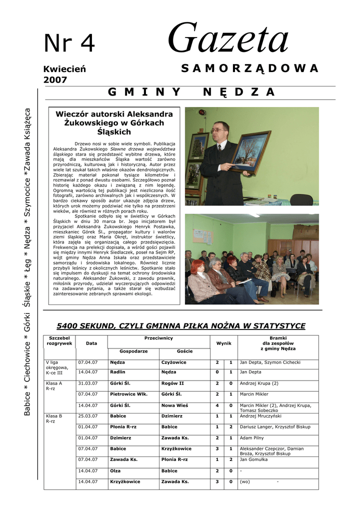 Gazeta Nr 4 Babice * Ciechowice * Górki Śląskie * Łęg * Nędza * Szymocice *Zawada KsiąŜęca Kwiecień 2007 SAMORZĄDOWA G M I N Y N Ę D Z A Wieczór autorski Aleksandra śukowskiego w Górkach Śląskich Drzewo nosi w sobie wiele symboli. Publikacja Aleksandra śukowskiego Sławne drzewa województwa śląskiego stara się przedstawić wybitne drzewa, które mają dla mieszkańców Śląska wartość zarówno przyrodniczą, kulturową jak i historyczną. Autor przez wiele lat szukał takich właśnie okazów dendrologicznych. Zbierając materiał pokonał tysiące kilometrów i rozmawiał z ponad dwustu osobami. Szczegółowo poznał historię kaŜdego okazu i związaną z nim legendę. Ogromną wartością tej publikacji jest niezliczona ilość fotografii, zarówno archiwalnych jak i współczesnych. W bardzo ciekawy sposób autor ukazuje zdjęcia drzew, których urok moŜemy podziwiać nie tylko na przestrzeni wieków, ale równieŜ w róŜnych porach roku. Spotkanie odbyło się w świetlicy w Górkach Śląskich w dniu 30 marca br. Jego inicjatorem był przyjaciel Aleksandra śukowskiego Henryk Postawka, mieszkaniec Górek Śl., propagator kultury i walorów ziemi śląskiej oraz Maria Okręt, instruktor świetlicy, która zajęła się organizacją całego przedsięwzięcia. Frekwencja na prelekcji dopisała, a wśród gości pojawili się między innymi Henryk Siedlaczek, poseł na Sejm RP, wójt gminy Nędza Anna Iskała oraz przedstawiciele samorządu i środowiska lokalnego. RównieŜ licznie przybyli leśnicy z okolicznych leśnictw. Spotkanie stało się impulsem do dyskusji na temat ochrony środowiska naturalnego. Aleksander śukowski, z zawodu prawnik, miłośnik przyrody, udzielał wyczerpujących odpowiedzi na zadawane pytania, a takŜe starał się wzbudzać zainteresowanie zebranych sprawami ekologii. 5400 SEKUND, CZYLI GMINNA PIŁKA NOśNA W STATYSTYCE Szczebel rozgrywek Data Przeciwnicy Gospodarze V liga okręgowa, K-ce III 07.04.07 Nędza Klasa A R-rz Klasa B R-rz Goście Bramki dla zespołów z gminy Nędza Wynik Radlin CzyŜowice Nędza 2 1 Jan Depta, Szymon Cichecki 31.03.07 Górki Śl. Rogów II 2 0 Andrzej Krupa (2) 07.04.07 Pietrowice Wlk. Górki Śl. 2 1 Marcin Mikler 14.04.07 Górki Śl. Nowa Wieś 4 0 25.03.07 Babice Dzimierz 1 1 Marcin Mikler (2), Andrzej Krupa, Tomasz Sobeczko Andrzej Mruczyński 01.04.07 Płonia R-rz Babice 1 2 Dariusz Langer, Krzysztof Biskup 01.04.07 Dzimierz Zawada Ks. 2 1 Adam Pilny 07.04.07 Babice KrzyŜkowice 3 1 07.04.07 Zawada Ks. Płonia R-rz 1 2 Aleksander Czepczor, Damian BroŜa, Krzysztof Biskup Jan Gomułka 14.04.07 Olza Babice 2 0 - 14.04.07 KrzyŜkowice Zawada Ks. 3 0 (wo) 14.04.07 0 1 Jan Depta - Zawody spławikowe Wiosna 2007 W sobotę, 24 marca br. na zbiorniku Babiczok w Babicach odbyły się zawody spławikowe Wiosna 2007. Wzięło w nich udział 21 zawodników. Zawody sędziowali: Adam Sobeczko i Piotr Zdziebło. Pierwsze miejsce zajął Michał Bugla (1,6 kg), drugie - Adam Sobeczko, a trzecie - Ryszard Jonderko. PANORAMA KLUBÓW SPORTOWYCH LKS SPARTA BABICE Rok załoŜenia: 1951 (w latach 1987-2001 działalność była zawieszona) Adres: ul. Rybacka (boisko), Babice, www. spartababice.aplus.pl. Zarząd: prezes Roland Panek wiceprezes Henryk BroŜa skarbnik Ginter Jarzombek sekretarz Krzysztof Biskup członek Józef Syrnik kierownik druŜyny Bronisław Franosz trener druŜyny seniorów: Benedykt Gomułka (od rundy wiosennej), Kazimierz Grycman (w rundzie jesiennej) NajwaŜniejsze sukcesy: od 2003 udział w rozgrywkach klasy B podokręgu raciborskiego w piłce noŜnej. Kadra seniorów w sezonie 2006/2007: kapitan zespołu Krzysztof Behrendt, bramkarze: Piotr Paszek, Robert Potyka, Paweł Kiebała zawodnicy: Sebastian BroŜa, Piotr Krzyszkowski, Andrzej Więckowski, Damian BroŜa, Bernard Depta, Krzysztof Biskup, Maciej Sak, Sebastian Pytlarz, Mirosław Achtelik, Damian Kułaga, Mateusz Wydra, Dariusz Kwapik, Dariusz Langer, Tomasz Banisz, Grzegorz Depta, Dariusz Rataj, Sebastian Kowol, Andrzej Mruczyński, Piotr Niedziela, Denis Przybyła, Oleg Wadula, Aleksander Czepczor, Dariusz Chluba, Marek Cyran, Krzysztof Cyran, Damian Kocur. Wyniki w klasie B podokręgu raciborskiego rundzie jesiennej sezonu 2006/2007 w Mecze u siebie: Płonia Racibórz 3:3, LKS Olza 3:1, Ocice Racibórz 1:2, KS Pietraszyn 3:0, Zgoda Zawada Ks. 1:0, LKS Bogunice 2:0, LKS Czernica 2:3, LKS Studzienna 0:0. Mecze na wyjeździe: LKS Dzimierz 0:3, LKS KrzyŜkowice 1:2, LKS PstrąŜna 1:1, Rafako Racibórz 3:1, LKS Lyski 0:2, LKS Bolesław 1:1, Wypoczynek Buków 3:2. PODSUMOWANIE DruŜyna LKS Baterex Szczebel rozgrywek V liga okręgowa Miejsce XIV Ilość meczów 19 Bramki Zw. Rem. Por. 22 21-32 6 4 9 31 36-27 9 4 5 Punkty Katowice III (-11) Nędza LKS Górki Śląskie LKS Klasa A Racibórz Klasa B Racibórz VI VI 18 19 29 (+9) 30-26 (+4) 8 5 6 Sparta Babice LKS Zgoda Zawada Ks. Strzelcy bramek 8 5 2 1 Jan Depta, A. Cichecki, M. Bochenek, Sz. Cichecki, Jacek Depta, M. Gawron, M. Niedziela, T. Przeliorz, R. Wieczorek. 12- A. Krupa, 6 - M. Mikler, 5 - T. Czerny, 4 - Ł. Czerny, 3 - T. Sobeczko, 2 - R. Hanusek, 1 6 5 4 3 2 1 Klasa B Racibórz XV 18 13 21-41 (-20) 4 1 13 6 5 2 1 - - Ł. KałuŜa, Ł. Sombrowski. D. Kwapik, D. Chluba, K. Biskup, A. Mruczyński A. Czepczor, D. Langer, O. Waduła, - M. Achtelik, K. Behrendt, D. BroŜa, S. BroŜa, B. Depta, G. Depta - J. Gomułka, - B. Gomułka, - K. Kalisz, M. Ochojski, A. Pilny, - G. Donga, R. Pchałek, A. Szebel, J. Wałach. III Powiatowy Turniej Badmintona Dnia 17 marca 2007 r. w Zespole Szkolno-Gimnazjalnym w Nędzy odbył się juŜ po raz trzeci Powiatowy Turniej Badmintona. Organizatorem turnieju byli: Grzegorz Swoboda, wójt gminy Nędza W kategorii Open męŜczyzn pierwsze miejsce zajął Kazimierz Grycman z Ciechowic, drugie - Krzysztof Popławski z Tworkowa, a trzecie - Grzegorz Swoboda z Nędzy. Wśród kobiet najlepsza była Maria Czerwińska z Kuźni Raciborskiej, drugie miejsce zaję