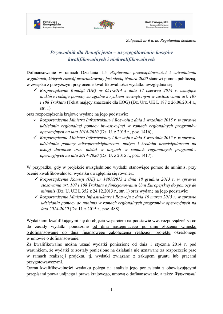 Załącznik nr 6 a. do Regulaminu konkursu Przewodnik dla Beneficjenta – uszczegółowienie kosztów kwalifikowalnych i niekwalifikowalnych Dofinansowanie w ramach Działania 1.5 Wspieranie przedsiębiorczości i zatrudnienia w gminach, których rozwój uwarunkowany jest siecią Natura 2000 stanowi pomoc publiczną, w związku z powyższym przy ocenie kwalifikowalności wydatku uwzględnia się: Rozporządzenie Komisji (UE) nr 651/2014 z dnia 17 czerwca 2014 r. uznające niektóre rodzaje pomocy za zgodne z rynkiem wewnętrznym w zastosowaniu art. 107 i 108 Traktatu (Tekst mający znaczenie dla EOG) (Dz. Urz. UE L 187 z 26.06.2014 r., str. 1) oraz rozporządzenia krajowe wydane na jego podstawie: Rozporządzenie Ministra Infrastruktury i Rozwoju z dnia 3 września 2015 r. w sprawie udzielania regionalnej pomocy inwestycyjnej w ramach regionalnych programów operacyjnych na lata 2014-2020 (Dz. U. z 2015 r., poz. 1416); Rozporządzenie Ministra Infrastruktury i Rozwoju z dnia 3 września 2015 r. w sprawie udzielania pomocy mikroprzedsiębiorcom, małym i średnim przedsiębiorcom na usługi doradcze oraz udział w targach w ramach regionalnych programów operacyjnych na lata 2014-2020 (Dz. U. z 2015 r., poz. 1417); W przypadku, gdy w projekcie uwzględniono wydatki stanowiące pomoc de minimis, przy ocenie kwalifikowalności wydatku uwzględnia się również: Rozporządzenie Komisji (UE) nr 1407/2013 z dnia 18 grudnia 2013 r. w sprawie stosowania art. 107 i 108 Traktatu o funkcjonowaniu Unii Europejskiej do pomocy de minimis (Dz. U. UE L 352 z 24.12.2013 r., str. 1) oraz wydane na jego podstawie: Rozporządzenie Ministra Infrastruktury i Rozwoju z dnia 19 marca 2015 r. w sprawie udzielania pomocy de minimis w ramach regionalnych programów operacyjnych na lata 2014-2020 (Dz. U. z 2015 r., poz. 488). Wydatkami kwalifikującymi się do objęcia wsparciem na podstawie ww. rozporządzeń są co do zasady wydatki ponoszone od dnia następującego po dniu złożenia wniosku o dofinansowanie do dnia finansowego zakończenia realizacji projektu określonego w umowie o dofinansowanie. Za kwalifikowalne można uznać wydatki poniesione od dnia 1 stycznia 2014 r. pod warunkiem, że wydatki te zostały poniesione na działania nie uznawane za rozpoczęcie prac w ramach realizacji projektu, tj. wydatki związane z zakupem gruntu lub pracami przygotowawczymi. Ocena kwalifikowalności wydatku polega na analizie jego poniesienia z obowiązującymi przepisami prawa unijnego i prawa krajowego, umową o dofinansowanie, a także Wytycznymi -1- Ministra Infrastruktury i Rozwoju w zakresie kwalifikowalności wydatków w ramach EFRR, EFS oraz Funduszu Spójności na lata 2014-2020 (zwanymi dalej Wytycznymi krajowymi). Na etapie oceny formalno-merytorycznej wniosku o dofinansowanie dokonywana jest wstępna ocena kwalifikowalności planowanych wydatków. Kwalifikowalność wydatków oceniana jest także w trakcie realizacji projektu kiedy Beneficjent przedkłada kolejne wnioski o płatność, jak również podczas kontroli projektu. Wydatkiem kwalifikowanym jest wówczas wydatek poniesiony przez beneficjenta zgodnie z zapisami ustawy Prawo zamówień publicznych albo zasadą konkurencyjności oraz innymi przepisami prawa mającymi zastosowanie (np. ustawa o swobodzie działalności i kwota graniczna płatności gotówkowej). Wydatki kwalifikowane w ramach Działaniu 1.5 Katalog wydatków kwalifikowalnych jest katalogiem zamkniętym, natomiast katalog wydatków niekwalifikowalnych jest katalogiem otwartym i zawiera jedynie wybrane wydatki niekwalifikowalne. Szczegółowe warunki i procedury w zakresie kwalifikowalności wskazanych poniżej wydatków określone są w Wytycznych krajowych i ww. rozporządzeniach dotyczących pomocy publicznej. Niniejszy załącznik do Regulaminu konkursu określa zaś katalog wydatków kwalifikowalnych w projektach realizowanych w ramach Działania 1.5, a także ewentualne limity i inne ograniczenia w odniesieniu do niektórych wydatków. Katalog wydatków kwalifikowalnych obejmuje: 1. Wydatki na opracowanie dokumentacji związanej z przygotowaniem projektu, w tym: niezbędna dokumentacja techniczna; niezbędne decyzje administracyjne (np. w związku z oceną oddziaływania na środowisko), mapy lub szkice sytuujące projekt. Wydatki wymienione w pkt 1 są kwalifikowane w ramach pomocy de minimis (pomoc udzielana na podstawie Rozporządzenia Ministra Infrastruktury i Rozwoju z dnia 19 marca 2015 r. w sprawie udzielenia pomocy de minimis w ramach regionalnych programów operacyjnych na lata 2014-2020) 2. Wydatki na nadzór budowlany i autorski: inwestorski, w tym inwestora zastępczego, oraz nadzór autorski, pod warunkiem, że stanowią integralną część wydatków ponoszonych na nabycie prawa własności lub wieczystego użytkowania nieruchomości, lub środków trwałych w ramach projektu objętego pomocą. 3. Wydatki na materiały i roboty budowlane: wydatki na materiały i roboty budowlane są kwalifikowalne pod warunkiem, iż dotyczą budynku wykorzystywanego tylko do celów działalności gospodarczej objętej wnioskiem o dofinansowanie projektu, z zastrzeżeniem pkt 6. Przez roboty budowlane rozumie się budowę, a także prace polegające na przebudowie, montażu, remoncie, rozbiórce obiektu budowlanego, tj.: wydatki na prace: ziemne, budowlano-montażowe, instalacyjne, wykończeniowe, dostosowanie obiektów i pomieszczeń w zakresie niezbędnym dla realizowanego -2- 4. 5. 6. 7. projektu; wydatki na budowę przyłączy do sieci wodociągowych, kanalizacyjnych, elektroenergetycznych lub gazowych mogą być uznane za kwalifikowalne, jeśli przyłącza będą stanowiły własność Beneficjenta; wydatki na adaptację i remont 1 pomieszczeń do specyficznych wymogów technicznych dla danego rodzaju działalności; wydatek związany z zagospodarowaniem terenu przyległego, o ile jest to wydatek niezbędny i integralnie związany z przedmiotem projektu. Wydatki na grunty niez