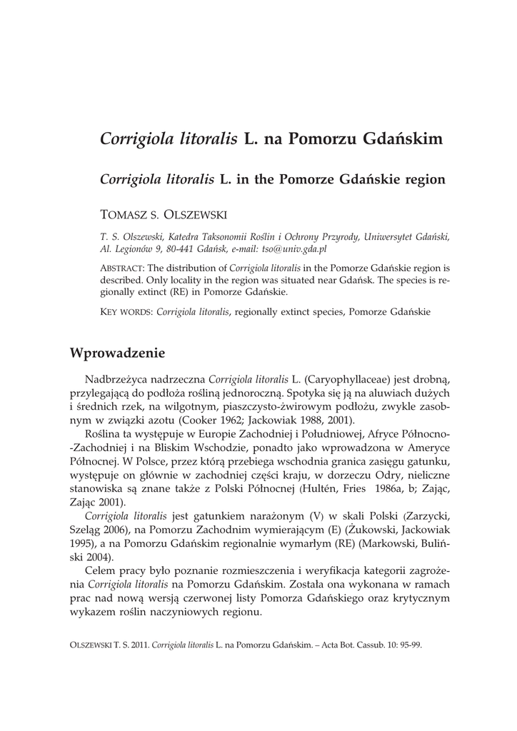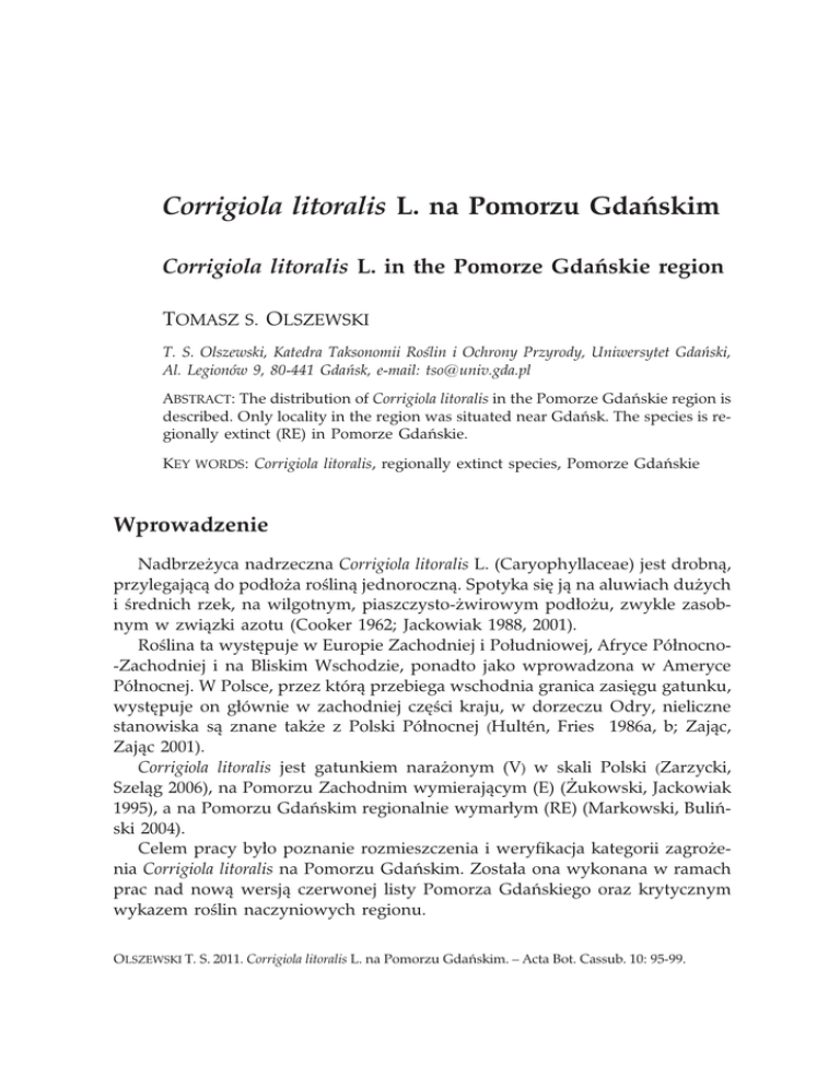 Corrigiola litoralis L. na Pomorzu Gdañskim Corrigiola litoralis L. in the Pomorze Gdañskie region TOMASZ S. OLSZEWSKI T. S. Olszewski, Katedra Taksonomii Roœlin i Ochrony Przyrody, Uniwersytet Gdañski, Al. Legionów 9, 80-441 Gdañsk, e-mail: [email protected] ABSTRACT: The distribution of Corrigiola litoralis in the Pomorze Gdañskie region is described. Only locality in the region was situated near Gdañsk. The species is regionally extinct (RE) in Pomorze Gdañskie. KEY WORDS: Corrigiola litoralis, regionally extinct species, Pomorze Gdañskie Wprowadzenie Nadbrze¿yca nadrzeczna Corrigiola litoralis L. (Caryophyllaceae) jest drobn¹, przylegaj¹c¹ do pod³o¿a roœlin¹ jednoroczn¹. Spotyka siê j¹ na aluwiach du¿ych i œrednich rzek, na wilgotnym, piaszczysto-¿wirowym pod³o¿u, zwykle zasobnym w zwi¹zki azotu (Cooker 1962; Jackowiak 1988, 2001). Roœlina ta wystêpuje w Europie Zachodniej i Po³udniowej, Afryce Pó³nocno-Zachodniej i na Bliskim Wschodzie, ponadto jako wprowadzona w Ameryce Pó³nocnej. W Polsce, przez któr¹ przebiega wschodnia granica zasiêgu gatunku, wystêpuje on g³ównie w zachodniej czêœci kraju, w dorzeczu Odry, nieliczne stanowiska s¹ znane tak¿e z Polski Pó³nocnej (Hultén, Fries 1986a, b; Zaj¹c, Zaj¹c 2001). Corrigiola litoralis jest gatunkiem nara¿onym (V) w skali Polski (Zarzycki, Szel¹g 2006), na Pomorzu Zachodnim wymieraj¹cym (E) (¯ukowski, Jackowiak 1995), a na Pomorzu Gdañskim regionalnie wymar³ym (RE) (Markowski, Buliñski 2004). Celem pracy by³o poznanie rozmieszczenia i weryfikacja kategorii zagro¿enia Corrigiola litoralis na Pomorzu Gdañskim. Zosta³a ona wykonana w ramach prac nad now¹ wersj¹ czerwonej listy Pomorza Gdañskiego oraz krytycznym wykazem roœlin naczyniowych regionu. OLSZEWSKI T. S. 2011. Corrigiola litoralis L. na Pomorzu Gdañskim. – Acta Bot. Cassub. 10: 95-99. 96 Tomasz S. Olszewski 1. Materia³ i metody Materia³ do badañ nad rozmieszczeniem stanowi³y dane literaturowe z okresu 1894-1976, wyniki w³asnych badañ terenowych przeprowadzonych w latach 2009-2011 oraz okazy zdeponowane w Zielniku Instytutu Ekologii i Ochrony Przyrody Uniwersytetu Miko³aja Kopernika w Toruniu (TRN). Granice Pomorza Gdañskiego przyjêto za Markowskim i Buliñskim (2004). Na podstawie zebranych danych sporz¹dzono wykaz stanowisk, z lokalizacj¹ w sieci kwadratów ATPOL (por. Zaj¹c 1978), w postaci uszczegó³owionej, tj. w kwadratach ni¿szego rzêdu o boku 5 km (por. Markowski, Buliñski 2004). W przypadku dawnych, niemieckich nazw geograficznych, dla których nie uda³o siê ustaliæ obecnego polskiego odpowiednika, podano ich oryginaln¹ pisowniê. Zgromadzone dane pos³u¿y³y do sporz¹dzenia mapy rozmieszczenia Corrigiola litoralis na Pomorzu Gdañskim w siatce kwadratów ATPOL. 2. Wyniki Wykaz stanowisk DA80b – Gdañsk-Westerplatte, Riff, 1891 (Bail s.n., TRN); Gdañsk-Westerplatte (okaz zielnikowy Bail 1891 za Schwarz 1967); okolice Gdañska (Bail 1894); Schwarz (1967) i Misiewicz (1976) nie odnaleŸli gatunku; w latach 2010-2011 nie odnotowano (T. S. Olszewski 2010-2011, mat. niepubl.) (ryc. 1). 3. Podsumowanie wyników i dyskusja Na terenie Pomorza Gdañskiego odnotowano tylko jedno stanowisko Corrigiola litoralis. Schwarz (1967) w oparciu o okaz zebrany przez Baila w 1891 r. podaje je z Westerplatte. Autor ten w wydanej kilka lat póŸniej pracy (Bail 1894) wymienia gatunek z okolic Gdañska, nie precyzuj¹c jednak po³o¿enia stanowiska. Prawdopodobnie chodzi o to samo stanowisko, zlokalizowane nad Wis³¹ Martw¹, co odpowiada wymaganiom siedliskowym gatunku. Stanowi ono najdalej na pó³noc wysuniêt¹ czêœæ jego zasiêgu w Polsce (por. Zaj¹c, Zaj¹c 2001). Stanowisko to ma wspó³czeœnie charakter historyczny. Gatunek podawany by³ tu pod koniec XIX w. i w okresie póŸniejszym nie zosta³ odnotowany (por. Schwarz 1967; Misiewicz 1976). Nie odnaleziono go tak¿e w s¹siedztwie podawanego stanowiska, nad Wis³¹ Martw¹ i Œmia³¹, na preferowanym przez gatunek siedlisku brzegów rzecznych (T. S. Olszewski 2009-2010, mat. niepubl.). Zanik nadbrze¿ycy nadrzecznej zwi¹zany by³ tutaj przypuszczalnie z prze- Corrigiola litoralis (L.) Rich. na Pomorzu Gdañskim 97 Ryc. 1. Rozmieszczenie Corrigiola litoralis na Pomorzu Gdañskim. Fig. 1. Distribution of Corrigiola litoralis in the Pomorze Gdañskie region. kszta³ceniem jej siedlisk spowodowanym umacnianiem, regulacj¹ i zabudow¹ brzegów Wis³y (por. Jackowiak 1988). Prawdopodobnie w podobnym okresie Corrigiola litoralis ust¹pi³a tak¿e z s¹siednich stanowisk, po³o¿onych na pó³nocnym i pó³nocno-wschodnim skraju zasiêgu w Polsce. Abromeit i in. (1898) podaj¹, ¿e stanowiska w Szczytnie (kwadrat ATPOL EB75) nie uda³o siê potwierdziæ w 1886 r. i w okresie póŸniejszym. Z kolei stanowisko z okolicy Nadarzyc (kwadrat BB86) nie zosta³o potwierdzone po 1877 r. (Ruhmer 1878; Ruhmer s.n., 1877, TRN). Nieco d³u¿ej gatunek wystêpowa³ w dolnym biegu Odry (por. Decker 1911; Holzfuss 1925; Liebbert 1934; Zaj¹c, Zaj¹c 2001). Wobec znacznego przekszta³cenia i zniszczenia siedlisk zajmowanych niegdyœ przez Corrigiola litoralis, jak równie¿ nie odnalezienie jej w ci¹gu ostatnich 115 lat, stanowisko w Gdañsku mo¿na uznaæ za historyczne. Tym samym status nadbrze¿ycy nadrzecznej na Pomorzu Gdañskim jako gatunku regionalnie wymar³ego (RE) nie uleg³ zmianie. W zwi¹zku z ustêpowaniem gatunku w Polsce (por. Jackowiak 1988, 2001) prawdopodobieñstwo ponownego pojawu w regionie jest niewielkie. Stanowiska w pó³nocnej czêœci kraju zanik³y stosunkowo wczeœnie i s¹ oddalone od istniej¹cych obecnie nielicznych miejsc wystêpowania gatunku. Ponadto populacje krajowe podlegaj¹ prawdopodobnie szeregowi 98 Tomasz S. Olszewski niekorzystnych zjawisk zwi¹zanych z kresem zasiêgowym (por. np. Durka 1999). Tym nie mniej zaleca siê okresowe poszukiwanie gatunku na odpowiednich dla niego siedliskach w regionie. Podziêkowania Autor s