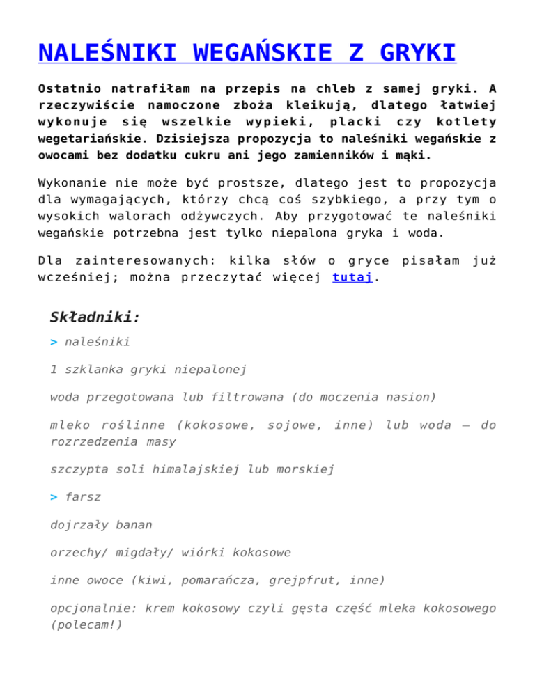 NALEŚNIKI WEGAŃSKIE Z GRYKI Ostatnio natrafiłam na przepis na chleb z samej gryki. A rzeczywiście namoczone zboża kleikują, dlatego łatwiej wykonuje się wszelkie wypieki, placki czy kotlety wegetariańskie. Dzisiejsza propozycja to naleśniki wegańskie z owocami bez dodatku cukru ani jego zamienników i mąki. Wykonanie nie może być prostsze, dlatego jest to propozycja dla wymagających, którzy chcą coś szybkiego, a przy tym o wysokich walorach odżywczych. Aby przygotować te naleśniki wegańskie potrzebna jest tylko niepalona gryka i woda. Dla zainteresowanych: kilka słów o gryce pisałam już wcześniej; można przeczytać więcej tutaj. Składniki: > naleśniki 1 szklanka gryki niepalonej woda przegotowana lub filtrowana (do moczenia nasion) mleko roślinne (kokosowe, sojowe, inne) lub woda – do rozrzedzenia masy szczypta soli himalajskiej lub morskiej > farsz dojrzały banan orzechy/ migdały/ wiórki kokosowe inne owoce (kiwi, pomarańcza, grejpfrut, inne) opcjonalnie: krem kokosowy czyli gęsta część mleka kokosowego (polecam!) > opcjonalnie krem z awokado, banana i kakao (lub karobu) krem daktylowy z awokado bądź inny krem wegański (bez cukru) Przygotowanie 1. Grykę płuczemy na sitku, a następnie zalewamy wodą przegotowaną lub filtrowaną i moczymy przez noc. Woda powinna sięgać kilka centymetrów nad poziom gryki. 2. Następnego dnia odcedzamy grykę i blenderujemy na gładką masę. 3. Dodajemy mleko – taką ilość, aby powstała konsystencja ciasta naleśnikowego. Oczywiście można zrobić również gęste ciasto i grubsze placki :) 4. Dodajemy również szczyptę soli i ponownie blenderujemy, aby masa się dokładnie połączyła z mlekiem. 5. Na patelni rozgrzewamy masło klarowane lub olej kokosowy (potrzebny jest tylko za pierwszym razem). 6. Wylewamy ciasto na patelnię i smażymy naleśniki (z obu stron). 7. Wypełniamy naleśniki farszem, który można przygotować w różny sposób: ja użyłam rozgniecionego banana jako smarowidło. Następnie posypałam pokrojonymi owocami, orzechami i wiórkami oraz polałam śmietanką kokosową. Zdrowe kombo: węglowodany + zdrowy tłuszcz. Można również naleśniki posmarować dowolnymi kremami czy konfiturą. Ważne, aby całość zawierała naturalnie występujące cukry i tłuszcz (z mleka roślinnego, orzechów, awokado czy kokosa). Naleśniki są elastyczne, dlatego można je zwinąć w rulonik. Ja jadłam swoje jak tacos, czyli złożone na pół, ponieważ same placki smażyłam na małej patelni :) Było dla mnie tak wygodniej. Dla nie wegan: Ze względu na to, że gryka świetnie smakuje także z mięsem czy twarogiem, takie placki są idealne także do dań wytrawnych czy pasztecików. Myślę, że takie naleśniki wegańskie z gryki mogą stać się ważnym elementem diety bezglutenowej. Tym bardziej, że są elastyczne (a to naturalna rzadkość :) ) i są możliwe do przygotowania na wiele smaków – na słodko czy wytrawnie. Smacznego eksperymentowania!