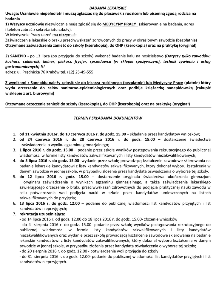 BADANIA LEKARSKIE Uwaga: Uczniowie niepełnoletni muszą zgłaszać się do placówek z rodzicem lub pisemną zgodą rodzica na badania 1) Wszyscy uczniowie niezwłocznie mają zgłosić się do MEDYCYNY PRACY (skierowanie na badania, adres i telefon zabrać z sekretariatu szkoły). W Medycynie Pracy uczeń ma otrzymać: Zaświadczenie lekarskie o braku przeciwwskazań zdrowotnych do pracy w określonym zawodzie (bezpłatnie) Otrzymane zaświadczenia zanieść do szkoły (kserokopia), do OHP (kserokopia) oraz na praktykę (oryginał) 2) SANEPID - po 13 lipca (po przyjęciu do szkoły) wykonać badanie kału na nosicielstwo (Dotyczy tylko zawodów: kucharz, cukiernik, kelner, piekarz, fryzjer, sprzedawca (w sklepie spożywczym), technik żywienia i usług gastronomicznych) !!! adres: ul. Prądnicka 76 Kraków tel. (12) 25-49-555 Z wynikami z Sanepidu należy zgłosić się do lekarza rodzinnego (bezpłatnie) lub Medycyny Pracy (płatnie) który wyda orzeczenie do celów sanitarno-epidemiologicznych oraz podbije książeczkę sanepidowską (zakupić w sklepie z art. biurowymi) Otrzymane orzeczenie zanieść do szkoły (kserokopia), do OHP (kserokopia) oraz na praktykę (oryginał) TERMINY SKŁADANIA DOKUMENTÓW 1. od 11 kwietnia 2016r. do 10 czerwca 2016 r. do godz. 15.00 – składanie przez kandydatów wniosków; 2. od 24 czerwca 2016 r. do 28 czerwca 2016 r. do godz. 15.00 – dostarczenie świadectwa i zaświadczenia o wyniku egzaminu gimnazjalnego; 3. 1 lipca 2016 r. do godz. 15.00 – podanie przez szkołę wyników postępowania rekrutacyjnego do publicznej wiadomości w formie listy kandydatów zakwalifikowanych i listy kandydatów niezakwalifikowanych; 4. do 5 lipca 2016 r. do godz. 15.00- wydanie przez szkołę prowadzącą kształcenie zawodowe skierowania na badanie lekarskie kandydatowi z listy kandydatów zakwalifikowanych, który dokonał wyboru kształcenia w danym zawodzie w jednej szkole, w przypadku złożenia przez kandydata oświadczenia o wyborze tej szkoły; 5. do 12 lipca 2016 r. godz. 15.00 – dostarczenie oryginału świadectwa ukończenia gimnazjum i oryginału zaświadczenia o wynikach egzaminu gimnazjalnego, a także zaświadczenia lekarskiego zawierającego orzeczenie o braku przeciwwskazań zdrowotnych do podjęcia praktycznej nauki zawodu w celu potwierdzania woli podjęcia nauki w szkole przez kandydatów umieszczonych na listach zakwalifikowanych do przyjęcia; 6. 13 lipca 2016 r. do godz. 12.00 – podanie do publicznej wiadomości list kandydatów przyjętych i list kandydatów nieprzyjętych; 7. rekrutacja uzupełniająca: - od 14 lipca 2016 r. od godz. 12.00 do 18 lipca 2016 r. do godz. 15.00- złożenie wniosków - do 4 sierpnia 2016 r. do godz. 15.00- podanie przez szkołę wyników postępowania rekrutacyjnego do publicznej wiadomości w formie listy kandydatów zakwalifikowanych i listy kandydatów niezakwalifikowanych oraz wydanie przez szkołę prowadzącą kształcenie zawodowe skierowania na badanie lekarskie kandydatowi z listy kandydatów zakwalifikowanych, który dokonał wyboru kształcenia w danym zawodzie w jednej szkole, w przypadku złożenia przez kandydata oświadczenia o wyborze tej szkoły; - do 20 sierpnia 2016 r. do godz. 12.00 - potwierdzenie woli przyjęcia do szkoły - do 31 sierpnia 2016 r. do godz. 12.00- podanie do publicznej wiadomości list kandydatów przyjętych i list kandydatów nieprzyjętych.