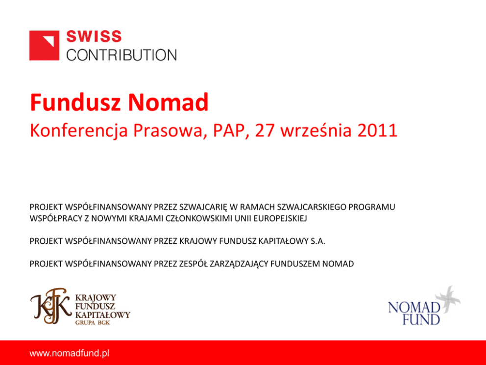 Fundusz Nomad Konferencja Prasowa, PAP, 27 września 2011 PROJEKT WSPÓŁFINANSOWANY PRZEZ SZWAJCARIĘ W RAMACH SZWAJCARSKIEGO PROGRAMU WSPÓŁPRACY Z NOWYMI KRAJAMI CZŁONKOWSKIMI UNII EUROPEJSKIEJ PROJEKT WSPÓŁFINANSOWANY PRZEZ KRAJOWY FUNDUSZ KAPITAŁOWY S.A. PROJEKT WSPÓŁFINANSOWANY PRZEZ ZESPÓŁ ZARZĄDZAJĄCY FUNDUSZEM NOMAD www.nomadfund.pl Przedstawienie Funduszu Nomad Wielkośd funduszu: 40 mln PLN Struktura kapitalizacji: 50% inwestorzy prywatni, 50% KFK Horyzont inwestycyjny: 10 lat Cykl inwestycyjny: okres 3-5 lat Typowa wielkośd inwestycji: ok. 3 mln zł (max. 6 mln/min. 2 mln zł) Planowana liczba projektów inwestycyjnych: 10 Inwestycje w spółki z siedzibą w Polsce, szczególnie w woj. małopolskim, świętokrzyskim i podkarpackim Udział funduszu w spółkach portfelowych: min. 10% - po pakiety kontrolne Branże: zgodnie z ustawą o KFK www.nomadfund.pl 2 40 mln RYNEK GŁÓWNY SPÓŁKI ŚREDNIEJ WIELKOŚCI – pre IPO 4 mln Wielkość inwestycji Strategia: Budowa wartości portfela przede wszystkim poprzez rynek kapitałowy NEWCONNECT Rynek publiczny www.nomadfund.pl SPÓŁKI MŁODE, TECHNOLOGICZNE Rynek prywatny Główna forma wyjścia 3 Rynek kapitałowy umożliwia najefektywniejszą budowę wartości w powiązaniu z funduszem VC Luka kapitałowa na rynku NewConnect Liczba notowanych spółek na NewConnect 350 300 250 200 150 100 50 0 mln zł Struktura inwestorów Pozyskany kapitał 100 100% 80 301 185 24 84 107 85,10 80% 60 60% 40 40% 95% 20% 20 3,51 4,08 średnia 80% 0% 0 max 5% Inwestorzy instytucjonalni Inwestorzy prywatni www.nomadfund.pl 4 Współpraca strategiczna z funduszami VC w Europie i na świecie Syndykacja projektów inwestycyjnych Strategicznie wczesne planowanie synergii z nurtami inwestycyjnymi wiodących Funduszy Możliwośd wspólnych inwestycji w ramach różnych portfeli inwestycyjnych Szansa na wypromowanie spółek portfelowych na rynkach zagranicznych www.nomadfund.pl 5 Rola Zespołu Nomad w Spółkach Portfelowych Kompleksowe due dilligence Zaangażowanie na poziomie Rady Nadzorczej Rada definiuje plan strategiczny i sposób tworzenia wartości Part-time CFO, miesięczny monitoring i kontroling Umowa inwestycyjna – kontrola i wsparcie Zdolnośd pozyskania dodatkowych inwestorów instytucjonalnych Zdolnośd pozyskania kapitału dłużnego www.nomadfund.pl 6 Wiodący inwestor i Główny Partner Zarządzający – Pan Andrzej Niżnik Doświadczony Przedsiębiorca, który sam osiągnął sukces Poszukiwania firmy o podobnym potencjale, z którą wspólnie odniesiemy sukces Firmy z Polski, szczególnie spółki technologiczne, mają potencjał, aby również byd w gronie liderów na świecie Mamy silny i zgrany zespół Partnerów Zarządzających Inwestujemy w Fundusz nie tylko naszą wiedzę i doświadczenie, ale też i własny kapitał www.nomadfund.pl 7 Partner Zarządzający Bogusława Cimoszko Skowrooska - ponad dwudziestoletnie doświadczenie transakcyjne jako Senior Banker w Europejskim Banku Odbudowy i Rozwoju w Londynie, w UBS AG w Zurychu, w butiku inwestycyjnym Fincoord Ltd., gdzie przeprowadziła szereg bardzo innowacyjnych transakcji na polskim rynku kapitałowym, i wreszcie jako założyciel i Prezes CMS Corporate Management Services Sp. z o.o., spółki która między innymi działa jako Autoryzowany Doradca NewConnect. www.nomadfund.pl 8 Partner Zarządzający Włodzimierz Laskowski - ponad dziesięcioletnie doświadczenie w pozyskiwaniu finansowania dla spółek z różnych branż - głównie od funduszy Venture Capital i banków. Posiada rozległe umiejętności i wiedzę w dziedzinie due dilligence, zarządzania ryzykiem i zarządzania jakością. Pracował w prestiżowych organizacjach finansowych (Merrill Lynch, HSBC Investment Bank, NatWest Markets, GE Capital). Stworzył od podstaw firmę Bot.Net, która współpracowała z takimi spółkami jak Boeing Corporation czy Marriott Hotels, a następnie została sprzedana do Ernst & Young Technology. www.nomadfund.pl 9 Dyrektor Inwestycyjny Michał Urbanowski - 15-letnie doświadczenie w audycie, doradztwie gospodarczym, transakcyjnym, finansowym i biznesowym zdobyte w najbardziej renomowanych firmach doradczych (Arthur Andersen i Ernst&Young) oraz od 2009 roku w ramach własnej firmy (Urcon). Realizował projekty doradcze dla bardzo szerokiego kręgu odbiorców praktycznie z większości dziedzin gospodarki, a projekty te każdorazowo wymagały dogłębnego poznania danej branży. www.nomadfund.pl 10 Rada Nadzorcza Przemysław Schmidt - Partner Zarządzający Trigon, przeprowadził z sukcesem transakcje o wartości ponad 26 mld Euro. Tadeusz Kozaczyoski - Wiceprezes, Dyrektor Finansowy Trakcja – Tiltra S.A. Dyrektor Finansowy Roku 2008. Rafał Stroioski - Prawnik z ponad 16-to letnim doświadczeniem w międzynarodowych kancelariach, takich jak CMS Cameron McKenna i Clifford Chance. Założyciel kancelarii prawnej JS Legal. Dodatkowo 2 członków Rady zostanie nominowanych przez KFK. www.nomadfund.pl 11 Doświadczona Rada Doradców Krzysztof Surgowt – Prezes spółki ASTRA Marketing Polska. Bardzo szeroka znajomośd rynku mediowego w Polsce i w całej Europie Centralnej Janusz Żebrowski – CEO giełdowej grupy K2, odpowiedzialny za strategie rozwoju Bogdan Kryca – jeden z wczesnych inwestorów w Ipopema S.A., przewodniczący Rady Nadzorczej Ipopema TFI S.A., Członek Rady Nadzorczej Ipopema Securities Tomasz Matczuk - Radca Prawny, specjalizuje się w problematyce prawnej obejmującej funkcjonowanie rynku kapitałowego, zajmuje się również problematyką prawną związaną z przejęciami oraz łączeniami przedsiębiorstw Robert Kuc – licencjonowany makler, na stanowisku zarządczym w Domu Maklerskim PKO BP. Był wykładowcą Szkoły Giełdy GPW. Przewodniczący Oddziału Stowarzyszenia Inwestorów Indywidualnych w Krakowie dr Marek Żabicki - ponad 20-letnie doświadczenie w zakresie budowy systemów kompleksowego wyszukiwania informacji, systemów dystrybuc