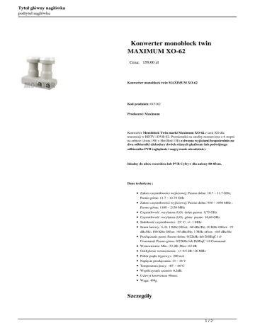 Tytuł główny nagłówka podtytuł nagłówka Konwerter monoblock twin MAXIMUM XO-62 Cena: 159.00 zł Konwerter monoblock twin MAXIMUM XO-62 Kod produktu: 013162 Producent: Maximum Konwerter Monoblock Twin marki Maximum XO-62 z serii XO dla transmisji w HDTV i DVB-S2. Promienniki na satelity rozstawione o 6 stopni na orbicie (Astra 19E + Hot Bird 13E) z dwoma wyjściami bezpośrednio na dwa odbiorniki (dekodery dwóch różnych platform) lub podwójnego odbiornika PVR (oglądanie i nagrywanie niezależnie). Idealny do nbox recordera lub PVR Cyfry+ dla anteny 80-85cm. Dane techniczne : Zakres częstotliwości wejściowej: Pasmo dolne: 10.7 ~ 11.7 GHz; Pasmo górne: 11.7 ~ 12.75 GHz Zakres częstotliwości wyjściowej: Pasmo dolne: 950 ~ 1950 MHz ; Pasmo górne: 1100 ~ 2150 MHz Częstotliwość oscylatora (LO) dolne pasmo 9,75 GHz Częstotliwość oscylatora (LO) górne pasmo 10,60 GHz Stabilność częstotliwości: 25° C: +/- 1 MHz Szum fazowy: L.O. 1 KHz Offset: -60 dBc/Hz; 10 KHz Offset: -75 dBc/Hz; 100 KHz Offset: -95 dBc/Hz; 1 MHz offset: -105 dBc/Hz Przełączanie pasm: Pasmo dolne: 0/22kHz lub DiSEqC 1.0 Command; Pasmo górne: 0/22kHz lub DiSEqC 1.0 Command Wzmocnienie: Min.: 53 dB; Max.: 63 dB Odchylenie wzmocnienia: +/- 0.5 dB / 26 MHz Pobór prądu (typowy).: 200 mA Napięcie przełączania: 13 ~ 18 V Temperatura pracy: -40° ~ 60°C Współczynnik szumów 0,2dB. Uchwyt konwertera 40mm. Waga: 499g Szczegóły 1/2 Tytuł główny nagłówka podtytuł nagłówka Rodzaj konwertera Osprzęt RTV - SAT Monoblock konwertery 2/2 Powered by TCPDF (www.tcpdf.org)