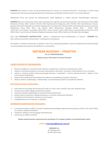 KARMAR S.A. działa na rynku od ponad dwudziestu lat, ciesząc się uznaniem Klientów i utrzymując na rynku usług budowlanych kluczową pozycję jako generalny wykonawca projektów kubaturowych oraz przemysłowych. Wizytówką Firmy jest ponad sto zakończonych, bądź będących w trakcie procesu budowlanego inwestycji. KARMAR S.A. jest również laureatem wielu prestiżowych nagród i wyróżnień branżowych, jak Przejrzysta Firma 2009, Diamenty Forbesa 2010, Srebrne Wiertło 2010 (Apartamenty Elekcyjna), Złote Wiertło 2011 (Scandinavian House), Budowa Roku 2011 (Rezydencja Foksal), Budowlana Firma Roku 2012, Budowa Roku 2012 (Rezydencja Naruszewicza), Budowlana Firma Roku 2013, Top Builder 2014 (Miasteczko Orange), Obiekt Roku – edycja 2012 i 2013 (CH Toruń Plaza), Top Builder 2015 (Silver Tower Center), Green Office Silver Level (Osiedle Centauris), Green Office Silver Level (Centrum Edukacji Międzynarodowej), Green Office Gold Level (Osiedle Nocznickiego). Jako część BOUYGUES CONSTRUCTION - jednej z największych grup budowlanych na świecie - KARMAR S.A. jest cenionym partnerem biznesowym i atrakcyjnym pracodawcą. W związku z rozwojem aktywności na polskim rynku oraz realizacją projektów z zakresu budownictwa kubaturowego i przemysłowego poszukujemy Kandydatów na stanowisko: INŻYNIER BUDOWY – PRAKTYKI Nr ref. PRAK/KAR/2016 Miejsce pracy: Warszawa/ Poznań/ Wrocław ZAKRES GŁÓWNYCH OBOWIĄZKÓW: bieżąca współpraca z Kierownictwem Budowy i Nadzorem w zakresie realizowanych zadań wsparcie Inżynierów Budowy w procesie sporządzania obmiarów, zestawień materiałowych oraz cenowych udział w realizacji polityki Zrównoważonego Rozwoju i projektach z zakresu Bezpieczeństwa i Higieny Pracy oraz Ochrony Środowiska zapewnienie efektywnej komunikacji oraz dbanie o prawidłowy przepływ informacji bieżące zadania wypływające z wdrożonego i utrzymywanego Systemu Zarządzania Jakością OD KANDYDATÓW OCZEKUJEMY: wykształcenia wyższego lub kontynuacji nauki na 4 lub 5 roku studiów, kierunek: Budownictwo teoretycznej wiedzy objętej programem studiów znajomości języka angielskiego na poziomie komunikatywnym bardzo dobrej znajomości obsługi komputera w zakresie środowiska Windows umiejętności komunikacji i dzielenia się informacją zaangażowania oraz inicjatywy w działaniu WYBRANYM KANDYDATOM OFERUJEMY: 3-miesięczne płatne praktyki w grupie kapitałowej posiadającej ugruntowaną pozycję w Polsce oraz status lidera na rynkach międzynarodowych możliwość zdobycia interesującego doświadczenia referencje po odbyciu praktyk Osoby zainteresowane zapraszamy do przesłania CV w języku polskim za pośrednictwem opcji: APLIKUJ ([email protected]) KARMAR S.A. Al. Wyścigowa 6, 02-681 Warszawa www.karmar.com.pl www.bouygues-construction.com Prosimy o dopisanie następującej klauzuli: "Wyrażam zgodę na przetwarzanie moich danych osobowych zawartych w mojej ofercie pracy dla potrzeb niezbędnych do realizacji procesów rekrutacji przez Karmar S.A. (zgodnie z ustawą z dn. 29.08.97 roku o Ochronie Danych Osobowych Dz. Ust Nr 133 poz. 883)".