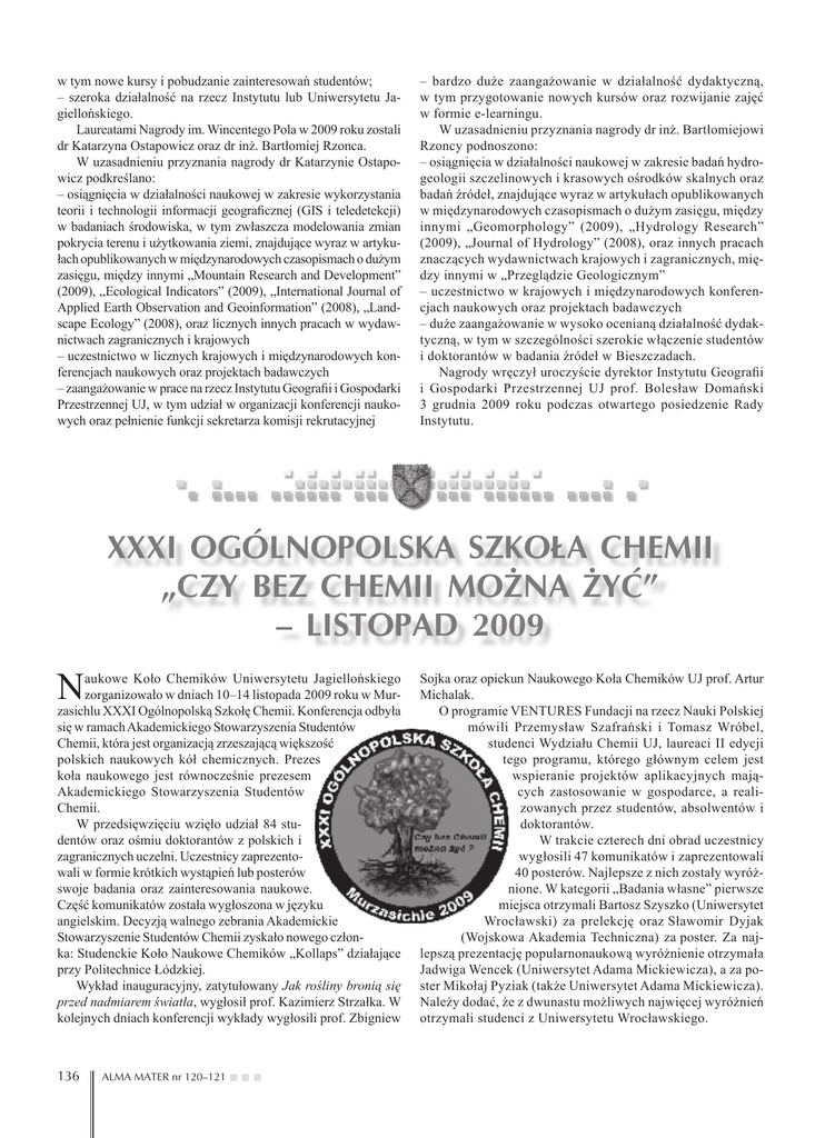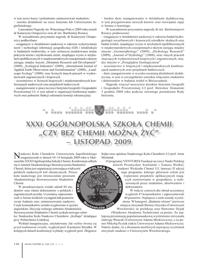 w tym nowe kursy i pobudzanie zainteresowań studentów; – szeroka działalność na rzecz Instytutu lub Uniwersytetu Jagiellońskiego. Laureatami Nagrody im. Wincentego Pola w 2009 roku zostali dr Katarzyna Ostapowicz oraz dr inż. Bartłomiej Rzonca. W uzasadnieniu przyznania nagrody dr Katarzynie Ostapowicz podkreślano: – osiągnięcia w działalności naukowej w zakresie wykorzystania teorii i technologii informacji geograficznej (GIS i teledetekcji) w badaniach środowiska, w tym zwłaszcza modelowania zmian pokrycia terenu i użytkowania ziemi, znajdujące wyraz w artykułach opublikowanych w międzynarodowych czasopismach o dużym zasięgu, między innymi „Mountain Research and Development” (2009), „Ecological Indicators” (2009), „International Journal of Applied Earth Observation and Geoinformation” (2008), „Landscape Ecology” (2008), oraz licznych innych pracach w wydawnictwach zagranicznych i krajowych – uczestnictwo w licznych krajowych i międzynarodowych konferencjach naukowych oraz projektach badawczych – zaangażowanie w prace na rzecz Instytutu Geografii i Gospodarki Przestrzennej UJ, w tym udział w organizacji konferencji naukowych oraz pełnienie funkcji sekretarza komisji rekrutacyjnej – bardzo duże zaangażowanie w działalność dydaktyczną, w tym przygotowanie nowych kursów oraz rozwijanie zajęć w formie e-learningu. W uzasadnieniu przyznania nagrody dr inż. Bartłomiejowi Rzoncy podnoszono: – osiągnięcia w działalności naukowej w zakresie badań hydrogeologii szczelinowych i krasowych ośrodków skalnych oraz badań źródeł, znajdujące wyraz w artykułach opublikowanych w międzynarodowych czasopismach o dużym zasięgu, między innymi „Geomorphology” (2009), „Hydrology Research” (2009), „Journal of Hydrology” (2008), oraz innych pracach znaczących wydawnictwach krajowych i zagranicznych, między innymi w „Przeglądzie Geologicznym” – uczestnictwo w krajowych i międzynarodowych konferencjach naukowych oraz projektach badawczych – duże zaangażowanie w wysoko ocenianą działalność dydaktyczną, w tym w szczególności szerokie włączenie studentów i doktorantów w badania źródeł w Bieszczadach. Nagrody wręczył uroczyście dyrektor Instytutu Geografii i Gospodarki Przestrzennej UJ prof. Bolesław Domański 3 grudnia 2009 roku podczas otwartego posiedzenie Rady Instytutu. XXXI OGÓLNOPOLSKA SZKOŁA CHEMII „CZY BEZ CHEMII MOŻNA ŻYĆ” – LISTOPAD 2009 N aukowe Koło Chemików Uniwersytetu Jagiellońskiego zorganizowało w dniach 10–14 listopada 2009 roku w Murzasichlu XXXI Ogólnopolską Szkołę Chemii. Konferencja odbyła się w ramach Akademickiego Stowarzyszenia Studentów Chemii, która jest organizacją zrzeszającą większość polskich naukowych kół chemicznych. Prezes koła naukowego jest równocześnie prezesem Akademickiego Stowarzyszenia Studentów Chemii. W przedsięwzięciu wzięło udział 84 studentów oraz ośmiu doktorantów z polskich i zagranicznych uczelni. Uczestnicy zaprezentowali w formie krótkich wystąpień lub posterów swoje badania oraz zainteresowania naukowe. Część komunikatów została wygłoszona w języku angielskim. Decyzją walnego zebrania Akademickie Stowarzyszenie Studentów Chemii zyskało nowego członka: Studenckie Koło Naukowe Chemików „Kollaps” działające przy Politechnice Łódzkiej. Wykład inauguracyjny, zatytułowany Jak rośliny bronią się przed nadmiarem światła, wygłosił prof. Kazimierz Strzałka. W kolejnych dniach konferencji wykłady wygłosili prof. Zbigniew 136 ALMA MATER nr 120–121 Sojka oraz opiekun Naukowego Koła Chemików UJ prof. Artur Michalak. O programie VENTURES Fundacji na rzecz Nauki Polskiej mówili Przemysław Szafrański i Tomasz Wróbel, studenci Wydziału Chemii UJ, laureaci II edycji tego programu, którego głównym celem jest wspieranie projektów aplikacyjnych mających zastosowanie w gospodarce, a realizowanych przez studentów, absolwentów i doktorantów. W trakcie czterech dni obrad uczestnicy wygłosili 47 komunikatów i zaprezentowali 40 posterów. Najlepsze z nich zostały wyróżnione. W kategorii „Badania własne” pierwsze miejsca otrzymali Bartosz Szyszko (Uniwersytet Wrocławski) za prelekcję oraz Sławomir Dyjak (Wojskowa Akademia Techniczna) za poster. Za najlepszą prezentację popularnonaukową wyróżnienie otrzymała Jadwiga Wencek (Uniwersytet Adama Mickiewicza), a za poster Mikołaj Pyziak (także Uniwersytet Adama Mickiewicza). Należy dodać, że z dwunastu możliwych najwięcej wyróżnień otrzymali studenci z Uniwersytetu Wrocławskiego. Organizacja tak dużego, ogólnopolskiego przedsięwzięcia nie byłaby możliwa bez pomocy współorganizatorów i sponsorów. Szczególne podziękowania organizatorzy kierują do rektora UJ prof. Karola Musioła, pani dziekan Wydziału Chemii prof. Grażyny Stochel, opiekuna Naukowego Koła Chemików UJ prof. Artura Michalaka, prezydenta Krakowa prof. Jacka Majchrowskiego, Działu Rekrutacji UJ, Naukowego Koła Fizyków UJ, Rady Kół Naukowych UJ, Fundacji Studentów i Absolwentów UJ „Bratniak” oraz sponsorów i patronatów medialnych. Krzysztof Lewandowski Marzena Krzek członkowie Koła Naukowego Chemików UJ Lista osób wyróżnionych XXXI Ogólnopolskiej Szkoły Chemii – listopad 2009 Bartosz Szyszko Adam Strzęp Kamila Olech REFERAT Z BADAŃ WŁASNYCH Uniwersytet Wrocławski Kontrola steryczna w syntezie rozszerzonych p-benziporNKCh „Jeż” firyn Badanie mechanizmów reakcji z ciężkimi jonami w obUniwersytet Wrocławski szarze energii Fermiego (20–50 MeV/A) na separatorach NKCh „Jeż” fragmentów Politechnika Wrocławska KNSCh „Allin” Księżycowa kataliza REFERAT POPULARNONAUKOWY Jadwiga Wencek Damian Myśliwiec Uniwersytet im. Adama Mickiewicza NKCH Uniwersytet Wrocławski NKCh „Jeż” Aktywność opiekuńcza onkogenu MDM2 Dendrymery – molekularne drzewka Polowanie na dalekie minima – met