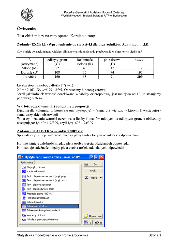 Katedra Genetyki i Podstaw Hodowli Zwierząt Wydział Hodowli i Biologii Zwierząt, UTP w Bydgoszczy Ćwiczenie: Test chi2 i miary na nim oparte. Korelacja rang. Zadanie (EXCEL): (Wprowadzenie do statystyki dla przyrodników, Adam Łomnicki): Czy istnieje związek między wiekiem ślimaków a skłonnością do przebywania w określonym siedlisku? fo (otrzymane) Młode (M) Dorosłe (D) Σsiedlisk odkryty grunt (G) 52 108 160 Roślinność zielona (R) 43 15 58 pnie drzew (D) 17 74 91 Σwieku 112 197 309 Liczba stopni swobody df=(k-1)*(w-1) Χ2 = 49,163 Χ20,05=5,991 df=2. Odrzucamy hipotezę zerową. Jeżeli jakakolwiek wartość oczekiwana w tablicy czteropolowej jest mniejsza od 10, to stosujemy poprawkę Yatesa. Wartość oczekiwaną (fe ) obliczamy z proporcji: fe/(suma dla kolumny, w której sie ona występuje) = (suma dla wiersza, w którym fe występuje) / suma wszystkich obserwacji W naszym zadaniu wartość oczekiwaną liczby ślimaków młodych na odkrytym gruncie obliczamy następująco: fe/160=112/309, czyli fe=(160*112)/309 Zadanie (STATISTICA) – ankieta2009.xls: Sprawdź czy istnieje zależność między płcią a udzielonymi w ankiecie odpowiedziami. H0 : nie istnieje zależność między płcią osób a treścią udzielanych odpowiedzi H1 : istnieje zależność między płcią osób a treścią udzielanych odpowiedzi Statystyka i modelowanie w ochronie środowiska Strona 1 Katedra Genetyki i Podstaw Hodowli Zwierząt Wydział Hodowli i Biologii Zwierząt, UTP w Bydgoszczy Statystyka i modelowanie w ochronie środowiska Strona 2 Katedra Genetyki i Podstaw Hodowli Zwierząt Wydział Hodowli i Biologii Zwierząt, UTP w Bydgoszczy Prawdopodobieństwo, jakie wynika z przeprowadzonego testu χ2 (0,01853) pozwala odrzucić hipotezę zerową i stwierdzić, że istnieje zależność statystycznie istotna między płcią osób a odpowiedzią na pytanie: czy lubisz słodycze? Otrzymany rozkład udzielanych odpowiedzi pozwala wnioskować, że kobiety częściej niż mężczyźni deklarują, iż lubią słodycze. Zadanie (STATISTICA) – skora.xls Sprawdź czy istnieje zależność między paleniem papierosów (palenie) a niektórymi dolegliwościami skórnymi oraz płcią osób. Zadanie (STATISTICA) – roztocze.xls Poddaj ocenie zależność między rodzajem zakładu przemysłowego a wybranymi gatunkami mechowców: C_sch_r Chamobates schuetzi E_obl_r Eremaeus oblongus E_tor_r Eupelops torulosus Wcześniej jednak dokonaj przekodowania powyższych kolumn, tzn. stwórz 3 nowe kolumny zawierające „1” i „0”. „1” ma wystąpić w sytuacji, gdy dany gatunek mechowców wystąpił, zaś „0”, gdy był nieobecny w próbie. Statystyka i modelowanie w ochronie środowiska Strona 3 Katedra Genetyki i Podstaw Hodowli Zwierząt Wydział Hodowli i Biologii Zwierząt, UTP w Bydgoszczy Korelacja rang – Spearmana 1. Otwórz skoroszyt dziecko.xls. Oblicz współczynniki korelacji SPEARMANA między skalą APGAR a wiekiem wprowadzenia do diety dziecka różnych posiłków. Sprawdź ich istotność. Statystyka i modelowanie w ochronie środowiska Strona 4