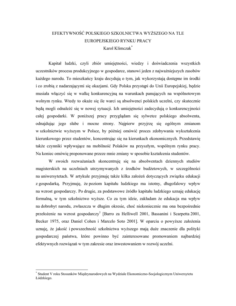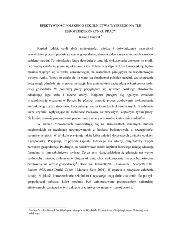 EFEKTYWNOŚĆ POLSKIEGO SZKOLNICTWA WYŻSZEGO NA TLE EUROPEJSKIEGO RYNKU PRACY Karol Klimczak* Kapitał ludzki, czyli zbiór umiejętności, wiedzy i doświadczenia wszystkich uczestników procesu produkcyjnego w gospodarce, stanowi jeden z najważniejszych zasobów każdego narodu. To mieszkańcy kraju decydują o tym, jak wykorzystają dostępne im środki i co zrobią z nadarzającymi się okazjami. Gdy Polska przystąpi do Unii Europejskiej, będzie musiała włączyć się w walkę konkurencyjną na warunkach panujących na wspólnotowym wolnym rynku. Wtedy to okaże się ile warci są absolwenci polskich uczelni, czy skutecznie będą mogli odnaleźć się w nowej sytuacji. Ich umiejętności zadecydują o konkurencyjności całej gospodarki. W poniższej pracy przyglądam się sylwetce polskiego absolwenta, odnajdując jego słabe i mocne strony. Najpierw przyjrzę się ogólnym zmianom w szkolnictwie wyższym w Polsce, by później omówić proces zdobywania wykształcenia kierunkowego przez studentów, koncentrując się na kierunkach ekonomicznych. Przedstawię także czynniki wpływające na mobilność Polaków na przyszłym, wspólnym rynku pracy. Na koniec omówię proponowane przeze mnie zmiany w sposobie kształcenia studentów. W swoich rozważaniach skoncentruję się na absolwentach dziennych studiów magisterskich na uczelniach utrzymywanych z środków budżetowych, w szczególności na uniwersytetach. W artykule przyjmuję także kilka założeń dotyczących związku edukacji z gospodarką. Przyjmuję, że poziom kapitału ludzkiego ma istotny, długofalowy wpływ na wzrost gospodarczy. Po drugie, za podstawowe źródło kapitału ludzkiego uznaję edukację formalną, w tym szkolnictwo wyższe. Co za tym idzie, zakładam że edukacja ma wpływ na dobrobyt narodu, zwłaszcza w długim okresie, choć niekoniecznie ma ona bezpośrednie przełożenie na wzrost gospodarczy1 [Barro za Helliwell 2001, Bassanini i Scarpetta 2001, Becker 1975, oraz Daniel Cohen i Marcelo Soto 2001]. W oparciu o powyższe założenia uznaję, że jakość i powszechność szkolnictwa wyższego mają duże znaczenie dla polityki gospodarczej państwa, które powinno być zainteresowane promowaniem najbardziej efektywnych rozwiązań w tym zakresie oraz inwestowaniem w rozwój uczelni. * Student V roku Stosunków Międzynarodowych na Wydziale Ekonomiczno-Socjologicznym Uniwersytetu Łódzkiego. 2 I. Obecna sytuacja Polski w zarysie Statystyki dotyczące liczby uczniów i studentów wskazują na coraz większą świadomość potrzeby zdobywania gruntownego wykształcenia. Od 1989 roku nastąpił stopniowy odpływ uczniów z zasadniczych szkół zawodowych, dających wąskie, szybko dezaktualizujące się wykształcenie, natomiast wzrósła liczba uczniów wybierających licea albo technika, a następnie studia. Trend ten nadal się utrzymuje, co najlepiej widać w zmianie liczby studentów z 403,8 tysięcy w roku akademickim 1990/1991 do 1,09 miliona w roku 1997/1998, 1,43 miliona w 1999/2000 i 1,71 miliona w roku 2001/2002. Warto zauważyć, że od połowy lat dziewięćdziesiątych nastąpił szybki wzrost liczby studentów w szkołach niepaństwowych, z 89 tys. w roku szkolnym 1995/1996 do 419 tys. w roku 1999/2000 i 508 tys. w roku 2001/2002. Jednocześnie wzrastały współczynniki skolaryzacji (liczba uczniów w ogóle ludności w danej grupie wiekowej). Największy, bo ponad trzykrotny wzrost wystąpił w udziale studentów w grupie 19-24 lata, osiągając w 2000 roku wartość 30,6%. Pozytywne wyniki daje także porównanie Polski do innych krajów pod względem liczby studentów na 10 tys. ludności (patrz Tabela 1), zwłaszcza jeśli weźmiemy pod uwagę, że w 2000 roku wskaźnik ten wyniósł już 404 studentów na 10 tys. mieszkańców. Tabela 1. Liczba studentów na 10 tys. mieszkańców. Rok Kraj 1990 1999 134 287 Polska 115 187 Czechy 300 360 Francja 258 263 Niemcy 540 534 St. Zjednoczone Źródło: Bulska B. M., Studia wyższe w Polsce, „Wiadomości Statystyczne”, 11/2000, 2000, oraz obliczenia własne na podstawie danych GUS Mimo tych pozytywnych zmian, pod względem stopnia wykształcenia ludności Polska cały czas odbiega od średniej krajów OECD: osoby z wykształceniem zasadniczym zawodowym stanowią 29 proc. dorosłej ludności, z wykształceniem podstawowym 37,7 proc., a z wykształceniem wyższym jedynie 11,1 proc. W OECD średnio 29,1 proc. ludności posiada wykształcenie wyższe, a tylko 27,7 proc. podstawowe. Możemy natomiast pochwalić się niskim wskaźnikiem osób, które nie ukończyły żadnej szkoły – 1,7 proc. w porównaniu do 4,1 proc. średnio w OECD.2 Choć powyższe dane wskazują, że Polacy zauważyli konieczność zdobywania wyższego wykształcenia, to pozostaje pytanie, czy instytucje ich kształcące sprostały 3 wyzwaniu, oraz czy są one w stanie zaoferować im odpowiedni poziom kształcenia. Wątpliwości nasuwają się już, gdy spojrzymy na zmianę liczby studentów studiujących dziennie, wieczorowo i zaocznie (Wykres 1). Okazuje się, że nawet gdy za bazę porównania przyjmiemy rok 1995, kiedy przemiany w Polsce zdążyły się już zaznaczyć, to i tak widać jak nieproporcjonalne zmiany wystąpiły. Od roku 1995 do 2001 liczba studentów ogółem zwiększyła się 2,15 raza, natomiast liczba studentów dziennych jedynie 1,66 raza. Z drugiej strony liczba studiujących zaocznie zwiększyła się 2,78 raza, a studiujących wieczorowo 3,05 raza (choć tych ostatnich cały czas jest stosunkowo niewielu). Wykres 1. Liczba studentów według systemu studiowania. 1800000 1600000 1400000 1200000 zaoczne 1000000 wieczorowe 800000 dzienne 600000 400000 200000 0 1995/1996 2001/2002 Źródło: GUS Powyższy wykres pokazuje wyraźnie, że większość studentów studiuje w systemie zaocznym oraz, że system ten zyskiwał na popularności w ciągu ostatnich lat. Z jednej strony możemy uznać ten fakt za pozytywny – coraz więcej ludzi stu