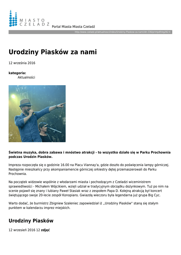Portal Miasta Miasta Czeladź http://www.czeladz.pl/aktualnosci/index/Urodziny-Piaskow-za-nami/idn:336/printpdf/stg262:4 Urodziny Piasków za nami 12 września 2016 kategoria: Aktualności Świetna muzyka, dobra zabawa i mnóstwo atrakcji - to wszystko działo się w Parku Prochownia podczas Urodzin Piasków. Impreza rozpoczęła się o godzinie 16.00 na Placu Viannay'a, gdzie doszło do poświęcenia lampy górniczej. Następnie mieszkańcy przy akompaniamencie górniczej orkiestry dętej przemaszerowali do Parku Prochownia. Na początek widzowie wspólnie z włodarzami miasta i pochodzącym z Czeladzi wiceministrem sprawiedliwości - Michałem Wójcikiem, wzięli udział w tradycyjnym obrządku dożynkowym. Tuż po nim na scenie pojawił się znany i lubiany Paweł Stasiak wraz z zespołem Papa D. Kolejną atrakcją był koncert świętującego swoje 20-lecie zespół Konopians. Gwiazdą wieczoru była legendarna już grupa Big Cyc. Warto dodać, że burmistrz Zbigniew Szaleniec zapowiedział iż ,,Urodziny Piasków" staną się stałym punktem w kalendarzu imprez miejskich. Urodziny Piasków 12 wrzesień 2016 12 zdjęć Urodziny Piasków Urodziny Piasków Urodziny Piasków Urodziny Piasków Urodziny Piasków Urodziny Piasków Urodziny Piasków Urodziny Piasków Urodziny Piasków Urodziny Piasków Urodziny Piasków Urodziny Piasków Urodziny Piasków za nami - strona 1 Urodziny Piasków za nami - strona 2 Urodziny Piasków za nami - strona 3 Urodziny Piasków za nami - strona 4