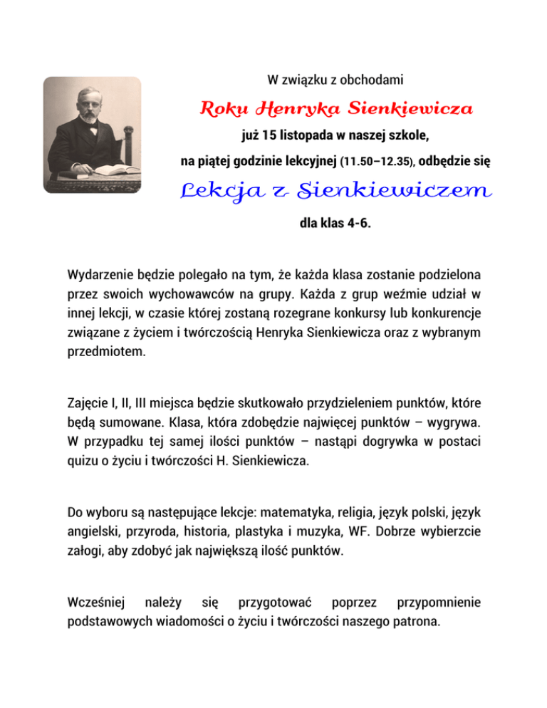 W związku z obchodami Roku Henryka Sienkiewicza już 15 listopada w naszej szkole, na piątej godzinie lekcyjnej (11.50–12.35), odbędzie się Lekcja z Sienkiewiczem dla klas 4-6. Wydarzenie będzie polegało na tym, że każda klasa zostanie podzielona przez swoich wychowawców na grupy. Każda z grup weźmie udział w innej lekcji, w czasie której zostaną rozegrane konkursy lub konkurencje związane z życiem i twórczością Henryka Sienkiewicza oraz z wybranym przedmiotem. Zajęcie I, II, III miejsca będzie skutkowało przydzieleniem punktów, które będą sumowane. Klasa, która zdobędzie najwięcej punktów – wygrywa. W przypadku tej samej ilości punktów – nastąpi dogrywka w postaci quizu o życiu i twórczości H. Sienkiewicza. Do wyboru są następujące lekcje: matematyka, religia, język polski, język angielski, przyroda, historia, plastyka i muzyka, WF. Dobrze wybierzcie załogi, aby zdobyć jak największą ilość punktów. Wcześniej należy się przygotować poprzez przypomnienie podstawowych wiadomości o życiu i twórczości naszego patrona.