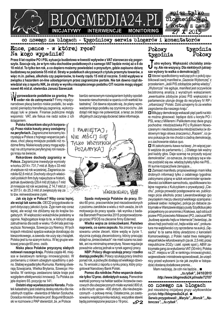 wpisz tylko blogmedia24.pl i zostañ z nami! 27 X 2015 ========================================================================================== 275 co nowego na blogach - tygodniowy serwis blogerów i komentatorów ========================================================================================== Ence, pence - w której rêce? tygodnia Po³owy Na kogo wypadnie? Po³owy tygodnia Przez 8 lat rządów PO i PSL sytuacja budżetowa w kwestii wpływów z VAT stanowczo się pogorszyła. Szacuje się, że w tym roku dochodów podatkowych z samego VAT będzie mniej aż o 8 do 10 mld zł. To tylko ten rok, a co dopiero możemy powiedzieć o przyszłym, gdzie zapisano dziurę budżetową na poziomie 55 mld zł. Straty w podatkach akcyzowych z tytułu przemytu towarów, a więc m.in. paliwa, alkoholu czy papierosów, to kwoty rzędu 15 mld zł rocznie. 5 mld wypływa w związku z hazardem on-line udostępnianym przez zagraniczne portale. Nie tak dawno rząd dowiedział się z raportu NIK, że straty w wyniku niezapłaconego podatku CIT rocznie mogą sięgać nawet 46 mld zł. stwierdza Janusz Szewczak W yprowadzanie podatków za granicę. Proceder nie do zatrzymania? Firmy międzynarodowe płacą bardzo niskie podatki, bo większość pieniędzy transferują zagranicę, wykorzystując luki w prawie. Finanse publiczne mógły wspomóc VAT, ale fiskus nie radzi sobie z ich ściąganiem. Polska folwarkiem obcych korporacji. Przez niskie koszty pracy zostajemy na peryferiach. Zagraniczne koncerny korzystają w Polsce z hojnego wsparcia państwa, choć płacą mniejsze podatki niż rodzime firmy. Niskie koszty pracy mogą wpłynąć na utrzymanie peryferyjnej roli naszego kraju na świecie. Rekordowe dochody zagranicy w Polsce. Zagraniczne inwestycje wyniosły w końcu 2014 r. 731,7 mld zł. Były o 33 mld zł większe niż rok wcześniej. Zagranica zarobiła 62,6 mld zł. Dochody obcych właścicieli polskich firm były najwyższe w historii, jednak dywidendy (29,4 mld zł) były o 7 mld zł mniejsze niż rok wcześniej. Z 14,7 mld zł w 2013 r. do 25,3 mld zł zwiększyły się za to tzw. reinwestowane zyski. Jak się żyje w Polsce? Niby coraz lepiej, ale wciąż tak samo źle. OECD przygotowała raport dotyczący jakości życia. Żyje nam się coraz lepiej, ale wciąż nie zbliżamy się do krajów bogatszych. W większości wskaźników jesteśmy w ogonie. Najbogatsze kraje to te, w których stopa zatrudnienia dla osób w wieku 15-64 lata jest najwyższa: Norwegia, Szwecja czy Niemcy. W tych krajach młodzież spędza wakacje dorabiając do kieszonkowego, a zawodu nie uczy się z książek. Polska jest tu na szarym końcu. W tej grupie wiekowej pracuje 60 proc. osób. Niska płaca Polaków przyczyną słabych notowań naszego kraju. Polska zajęła 46. miejsce w światowym rankingu innowacyjności. W porównaniu z rokiem ubiegłym spadliśmy o jedno. Słabiej wypadła tylko Rumunia. Ranking otwierają Szwajcaria, Wielka Brytania, Szwecja i Holandia. W rankingu zestawiono także kraje pod względem efektywności innowacji. Tu Polska zajęła dopiero 93. pozycję na 141. Ostatni etap wywłaszczania Narodu. Podatek katastralny jest ostatnią deską ratunku dla nieudolnych rządów - stwierdza dr Marian Szołucha. Doradca ministra finansów prof. Bogumił Brzeziński w rozmowie z PAP stwierdził, że „w Polsce bardzo sensownym rozwiązaniem byłoby opodatkowanie nieruchomości w oparciu o ich wartość katastralną”. Od dawna słyszało się, że plany wprowadzenia tego podatku są czynione po cichu. Jak dotąd nikt tego nie potwierdzał, a teraz ze źródeł oficjalnych zaczynają docierać takie informacje. Spada motywacja Polaków do pracy. Blisko 60 proc. pracowników jest niezadowolonych z poziomu zarobków a wielu z nich uważa, że ich motywacja do pracy spada - tak wynika z badania Barometr Pracownika 2015 przeprowadzonego przez IPSOS na zlecenie firmy Edenred. Wielka wojna ze śmieciówkami. Państwo naprawia, co samo zepsuło. Na zmiany w ozusowaniu umów zleceń, które wejdą w życie 1. stycznia zyskają zleceniobiorcy, którzy pracując dotąd na „śmieciówkach” nie mieli szans na zasiłek, ani na minimalną emeryturę. Nowe regulacje poważnie uderzą jednak w rynek agencji pracy. NBP: Polacy długo szukają pracy i rzadko dostają podwyżki. Polacy szukają pracy średnio ponad rok, a podwyżki dostają od wielkiego dzwonu. To wnioski z raportu o rynku pracy, który przygotował Narodowy Bank Polski. Pomoc dla rolników. Pełne wsparcie dostanie tylko 12 proc. dotkniętych suszą. Pierwotnie wartość pomocy na hektar sadów i krzewów owocowych dla ubezpieczonych miała wynieść 800 zł, a dla innych upraw - 400 złotych, dla nieubezpieczonych - o połowę mniej. Ostatecznie, po zastosowaniu współczynnika redukcji, wszystkie stawki będą pomniejszone jeszcze o 19 proc. 2 J utro wybory. Większość chciałaby zmiany. Ale nie wszyscy. Dla niektórych jutrzejsze wybory to walka o demokrację(!) Ideowi spadkobiercy walczących o pokój opublikowali swój manifest w „Gazecie Wyborczej” z przesłaniem „Jeśli PiS zdobędzie pełnię władzy”. „Wyborcza” nie agituje, manifest jest oczywiście bezstronną analizą z wyraźnym wskazaniem: „ewentualne zdobycie przez PiS większości w parlamencie utoruje drogę do recydywy IV RP i „orbanizacji” Polski. Dziś uznajemy to za wielkie zagrożenie dla naszego kraju”. Miłujący demokrację wskazali pięć partii na które można głosować: będące dziś u koryta PO i PSL wraz z Millerem i Palikotem oraz dwie grupy pochodne: młodzieżówka PO z Ryśkiem Nowoczesnym i nieobolszewicka młodzieżówka (w dosłownym tego słowa znaczeniu) „Razem”, co jasno pokazuje że nie chodzi o żadną demokrację, a o zachowanie status quo. W zakończeniu kawa na ławę: „Im więcej partii wejdzie do parlamentu (...) Dlatego tak ważny jest każdy głos. Daje szansę na przyszły sojusz demokratów”, co oznacza, 