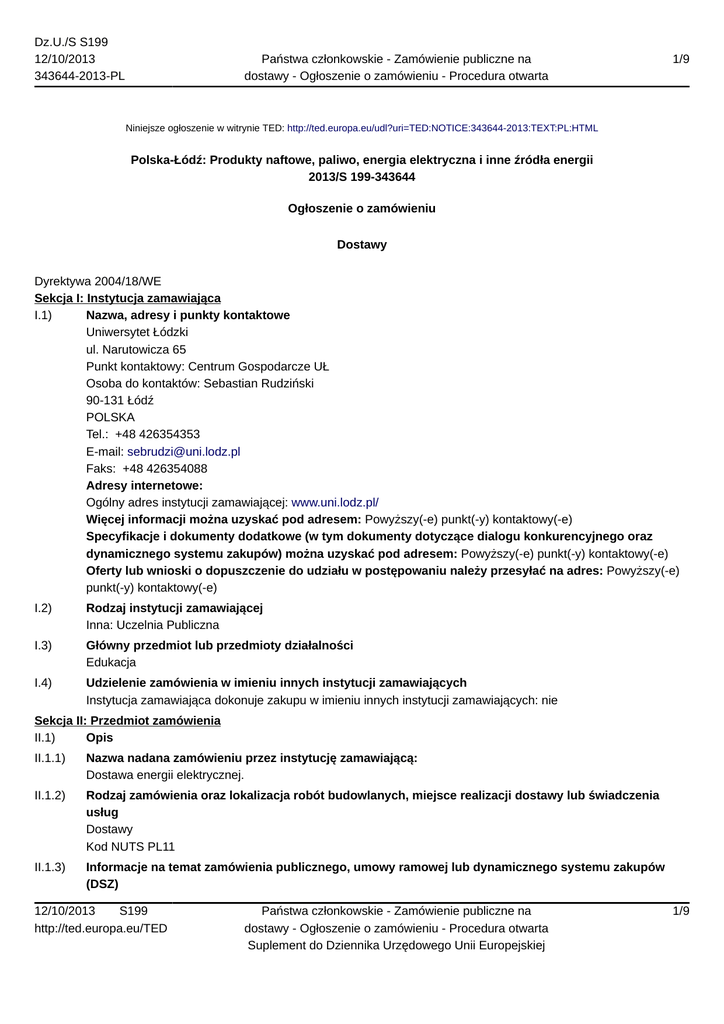 Dz.U./S S199 12/10/2013 343644-2013-PL Państwa członkowskie - Zamówienie publiczne na dostawy - Ogłoszenie o zamówieniu - Procedura otwarta 1/9 Niniejsze ogłoszenie w witrynie TED: http://ted.europa.eu/udl?uri=TED:NOTICE:343644-2013:TEXT:PL:HTML Polska-Łódź: Produkty naftowe, paliwo, energia elektryczna i inne źródła energii 2013/S 199-343644 Ogłoszenie o zamówieniu Dostawy Dyrektywa 2004/18/WE Sekcja I: Instytucja zamawiająca I.1) Nazwa, adresy i punkty kontaktowe Uniwersytet Łódzki ul. Narutowicza 65 Punkt kontaktowy: Centrum Gospodarcze UŁ Osoba do kontaktów: Sebastian Rudziński 90-131 Łódź POLSKA Tel.: +48 426354353 E-mail: [email protected] Faks: +48 426354088 Adresy internetowe: Ogólny adres instytucji zamawiającej: www.uni.lodz.pl/ Więcej informacji można uzyskać pod adresem: Powyższy(-e) punkt(-y) kontaktowy(-e) Specyfikacje i dokumenty dodatkowe (w tym dokumenty dotyczące dialogu konkurencyjnego oraz dynamicznego systemu zakupów) można uzyskać pod adresem: Powyższy(-e) punkt(-y) kontaktowy(-e) Oferty lub wnioski o dopuszczenie do udziału w postępowaniu należy przesyłać na adres: Powyższy(-e) punkt(-y) kontaktowy(-e) I.2) Rodzaj instytucji zamawiającej Inna: Uczelnia Publiczna I.3) Główny przedmiot lub przedmioty działalności Edukacja I.4) Udzielenie zamówienia w imieniu innych instytucji zamawiających Instytucja zamawiająca dokonuje zakupu w imieniu innych instytucji zamawiających: nie Sekcja II: Przedmiot zamówienia II.1) Opis II.1.1) Nazwa nadana zamówieniu przez instytucję zamawiającą: Dostawa energii elektrycznej. II.1.2) Rodzaj zamówienia oraz lokalizacja robót budowlanych, miejsce realizacji dostawy lub świadczenia usług Dostawy Kod NUTS PL11 II.1.3) Informacje na temat zamówienia publicznego, umowy ramowej lub dynamicznego systemu zakupów (DSZ) 12/10/2013 S199 http://ted.europa.eu/TED Państwa członkowskie - Zamówienie publiczne na dostawy - Ogłoszenie o zamówieniu - Procedura otwarta Suplement do Dziennika Urzędowego Unii Europejskiej 1/9 Dz.U./S S199 12/10/2013 343644-2013-PL Państwa członkowskie - Zamówienie publiczne na dostawy - Ogłoszenie o zamówieniu - Procedura otwarta 2/9 Ogłoszenie dotyczy zamówienia publicznego II.1.4) Informacje na temat umowy ramowej II.1.5) Krótki opis zamówienia lub zakupu 1. Przedmiotem zamówienia jest sprzedaż energii elektrycznej w rozumieniu ustawy Prawo energetyczne (Dz. U. z 2006 r. Nr 81 poz. 615 z późn. zm.), do punktów poboru przedstawionych w zestawieniu zbiorczym (załączniku nr 1 do SIWZ). 1) Okres trwania zamówienia od 01.01.2014 r. do 31.12.2016 r. jednakże dla punktów poboru opisanych w Zestawieniu nr 1 pod pozycjami 3, 5 – 6 i 15 umowa będzie obowiązywać od 01.01.2014r. do 31.12.2016r., natomiast dla pozostałych punktów poboru energii wskazanych w Zestawieniach nr 1 - 3 od 1.03.2014r. do 31.12.2016r. 2) Planowana ilość około 35.715.056 kWh (w okresie od 01.01.2014 r. do 31.12.2014 r. – 10.130.996,50 kWh, w okresie od 01.01.2015 r. do 31.12.2015 r. – 12.792.030,00 kWh i w okresie od 01.01.2016r. do 31.12.2016r. – 12.792.030,00 kWh). 3) Zamawiający informuje, że planowana ilość jest wartością szacunkową wyliczoną na podstawie zużycia energii elektrycznej w ostatnim okresie. 4) Zamawiający informuje, że nie będzie ponosił żadnych opłat z tytułu niewykorzystania pełnej ilości zamawianego wolumenu energii elektrycznej, a opłata będzie naliczona zgodnie z faktycznym zużyciem energii. 2. Zamawiający informuje, że nie posiada rozdzielonych umów kompleksowych a proces zmiany sprzedawcy odbywa się po raz pierwszy. 3. Zamawiający informuje, iż dystrybutorem energii elektrycznej na terenie funkcjonowania Zamawiającego jest PGE Dystrybucja S.A. W załączniku nr 1 do SIWZ (Zestawienia nr 1 - 3) Zamawiający wskazuje wszystkie punkty poboru energii elektrycznej objęte przedmiotem zamówienia. 4. Energia elektryczna powinna spełniać parametry techniczne zgodnie z zapisami ustawy Prawo energetyczne oraz rozporządzeniami wykonawczymi do tej ustawy i Polskimi Normami. II.1.6) Wspólny Słownik Zamówień (CPV) 09000000, 09300000, 09310000 II.1.7) Informacje na temat Porozumienia w sprawie zamówień rządowych (GPA) Zamówienie jest objęte Porozumieniem w sprawie zamówień rządowych (GPA): tak II.1.8) Części To zamówienie podzielone jest na części: nie II.1.9) Informacje o ofertach wariantowych Dopuszcza się składanie ofert wariantowych: nie II.2) Wielkość lub zakres zamówienia II.2.1) Całkowita wielkość lub zakres: Szacunkowa wartość bez VAT: Zakres: między 1 000 000 i 1 500 000 EUR II.2.2) Informacje o opcjach Opcje: nie II.2.3) Informacje o wznowieniach Jest to zamówienie podlegające wznowieniu: nie II.3) Czas trwania zamówienia lub termin realizacji 12/10/2013 S199 http://ted.europa.eu/TED Państwa członkowskie - Zamówienie publiczne na dostawy - Ogłoszenie o zamówieniu - Procedura otwarta Suplement do Dziennika Urzędowego Unii Europejskiej 2/9 Dz.U./S S199 12/10/2013 343644-2013-PL Państwa członkowskie - Zamówienie publiczne na dostawy - Ogłoszenie o zamówieniu - Procedura otwarta 3/9 Rozpoczęcie 1.1.2014. Zakończenie 31.12.2016 Sekcja III: Informacje o charakterze prawnym, ekonomicznym, finansowym i technicznym III.1) Warunki dotyczące zamówienia III.1.1) Wymagane wadia i gwarancje: 1. Każdy wykonawca przystępujący do niniejszego postępowania musi wnieść wadium w wysokości: 50.000,zł. (słownie zł: pięćdziesiąt tysięcy złotych). Wpłacona przez wykonawcę kwota wadium powinna również uwzględniać ewentualne koszty związane z prowizją bankową za przelew kwoty wadium na konto wskazane przez zamawiającego. 2. Wadium należy wnieść najpóźniej do dnia osta¬tecznego terminu składania ofert. 3. Wadium może być wnoszone w jednej lub kilku następujących formach: a) pieniądzu, b) poręczeniach bankowych lub poręczeniach spółdzielczej kasy oszczędn