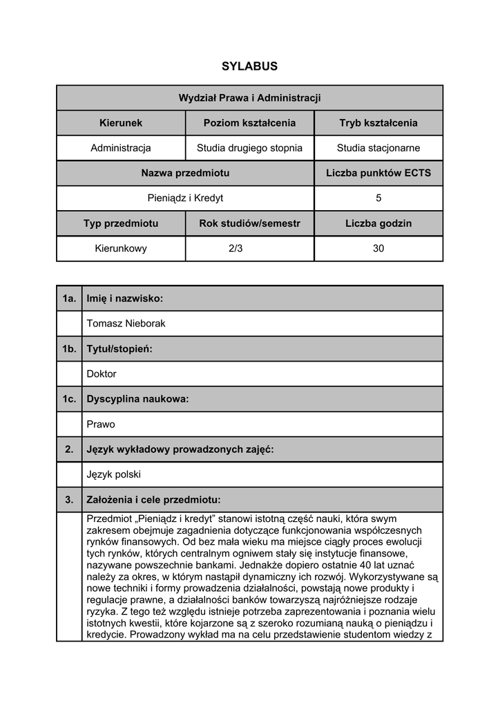 SYLABUS Wydział Prawa i Administracji Kierunek Poziom kształcenia Tryb kształcenia Administracja Studia drugiego stopnia Studia stacjonarne Nazwa przedmiotu Liczba punktów ECTS Pieniądz i Kredyt 5 Typ przedmiotu Rok studiów/semestr Kierunkowy 1a. 2/3 Liczba godzin 30 Imię i nazwisko: Tomasz Nieborak 1b. Tytuł/stopień: Doktor 1c. Dyscyplina naukowa: Prawo 2. Język wykładowy prowadzonych zajęć: Język polski 3. Założenia i cele przedmiotu: Przedmiot „Pieniądz i kredyt” stanowi istotną część nauki, która swym zakresem obejmuje zagadnienia dotyczące funkcjonowania współczesnych rynków finansowych. Od bez mała wieku ma miejsce ciągły proces ewolucji tych rynków, których centralnym ogniwem stały się instytucje finansowe, nazywane powszechnie bankami. Jednakże dopiero ostatnie 40 lat uznać należy za okres, w którym nastąpił dynamiczny ich rozwój. Wykorzystywane są nowe techniki i formy prowadzenia działalności, powstają nowe produkty i regulacje prawne, a działalności banków towarzyszą najróżniejsze rodzaje ryzyka. Z tego też względu istnieje potrzeba zaprezentowania i poznania wielu istotnych kwestii, które kojarzone są z szeroko rozumianą nauką o pieniądzu i kredycie. Prowadzony wykład ma na celu przedstawienie studentom wiedzy z tego zakresu. Konstruowany jest on w oparciu o założenie, iż prezentacja omawianej tematyki powinna opierać się na trzech zasadniczych filarach: 1. nauki o pieniądzu (jego pojęciu, teoriach, historii, sposobach powstawania oraz kształtowania jego podaży i popytu), 2. kwestii dotyczących systemów bankowych, obejmujących zarówno instytucje bankowe, jak i instytucje odpowiedzialne za bezpieczeństwo rynku (zagadnienia powstawania banku, odpowiednich wymogów kapitałowych i ostrożnościowych, systemów nadzoru bankowego etc.) 3. oraz zagadnienia na temat działalności bankowej sensu largo (obejmującej typowe czynności bankowe, ale i także nowe usługi bankowe). Na podstawie tej koncepcji konstruowany jest wykład, którego program przedstawiony został poniżej. 4. Wymagania wstępne: Brak 5. Metody dydaktyczne: Wykład z wykorzystaniem nowoczesnych środków przekazu, w szczególności materiałów na foliach oraz rzutnika multimedialnego. 6. Forma i warunki zaliczania przedmiotu: Egzamin pisemny 7. Treści kształcenia (programowe): I. Pieniądz . pojęcie, formy, teorie, historia. Sposoby kreacji pieniądza (rola banków komercyjnych i banku centralnego). Podstawowe pojęcie dotyczące pieniądza (popyt, podaż, inflacja, deflacja). II. Pieniądz a waluta. Wymienialność pieniądza. Pieniądz międzynarodowy. Międzynarodowe organizacje finansowe (rola, cele i zadania). III. Pieniądz międzynarodowy, międzynarodowe organizacje finansowe. IV. Powstanie i ewolucja bankowości. Bankowość centralna - geneza, ewolucja, funkcje. V. Nadzór bankowy. VI. Bank jako specyficzna forma przedsiębiorstwa. Podstawy prawne działalności banków w Polsce (założenie banku, formy prawne, zadania). VII. Podstawy prawne działalności banków (likwidacja, przejęcie zawieszenie i upadłość banku). VIII. Istota i geneza systemu gwarantowania depozytów bankowych. Systemy rozliczeń międzybankowych. IX. Operacje bankowe - pojęcie, rodzaje. Ryzyko bankowe (pojęcie i sposoby zabezpieczania się przed nim). Bankowość hipoteczna oraz bankowość spółdzielcza - historia, zadania i organizacja. X. Krajowe a zagraniczne operacje bankowe. Rola banków w zagranicznych operacjach rozliczeniowych (czeki, weksle, akredytywa, inkaso). Banki a rynek kapitałowy. Banki a działalność dewizowa. Pochodne instrumenty finansowe. 8. Wykaz literatury podstawowej: T. Gruszecki, Teoria pieniądza i polityka pieniężna, Oficyna Ekonomiczna, Kraków 2004 9. Wykaz literatury uzupełniającej: F. S. Mishkin, Ekonomika pieniądza, bankowości i rynków finansowych, Wydawnictwo Naukowe PWN, Warszawa 2002 W. Przybylska-Kapuścińska [red.], Współczesna polityka pieniężna, Difin, Warszawa 2008.