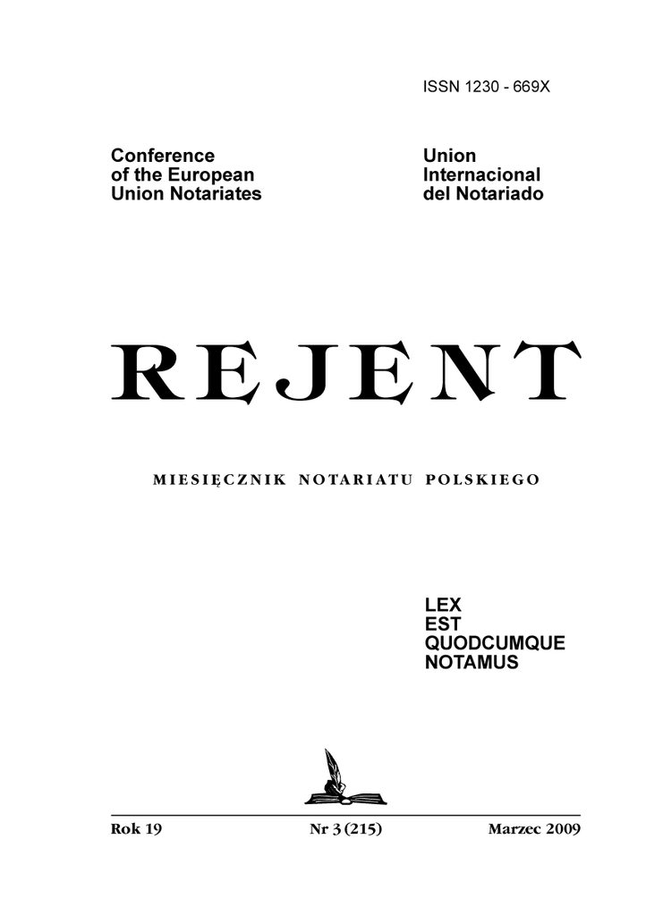 1 2 Miesiêcznik Notariatu Polskiego REJENT Rok 19 Nr 3(215) Marzec 2009 Spis treœci Artyku³y Edward G n i e w e k Przestroga dla s¹dów wieczystoksiêgowych – na tle b³êdnej wyk³adni S¹du Najwy¿szego ......................... 11 El¿bieta K r e m e r Zasady nabywania rent strukturalnych – zagadnienia wybrane ............................................................ 15 Berenika K a c z m a r e k Utopia czy realna mo¿liwoœæ? Przeszkody na drodze do sporz¹dzenia aktu notarialnego w formie elektronicznej ........................................................................... 37 Grzegorz K o z i e ³ Powstanie stosunku cz³onkostwa w handlowej spó³ce osobowej jako konsekwencja ustania bytu prawnego wspólnika .................................................................................. 52 Hanna W i t c z a k Skutki wy³¹czenia od dziedziczenia ........................................ 73 Mariusz Z a ³ u c k i Konstrukcja prawna zasiedzenia w³asnoœci nieruchomoœci w kontekœcie regulacji nowego kodeksu cywilnego ................. 97 3 Glosa Piotr B i e l s k i Glosa do wyroku S¹du Najwy¿szego z dnia 5 grudnia 2003 r., IV CK 286/02 ................................ 116 Polemiki i refleksje Jerzy J a c y s z y n Zmiany w kodeksie spó³ek handlowych ................................ 128 Z ¿ycia Stowarzyszenia Grzegorz B ³ a s z c z y k Nowa siedziba ZG Stowarzyszenia Notariuszy RP .............. 134 Z kart historii notariatu Tomasz J. K o t l i ñ s k i Towarzystwo Galicyjskich Kandydatów Notarialnych Wschodniej Ma³opolski we Lwowie ....................................... 136 Recenzja Przemys³aw Szustakiewicz, Jacek Zaleœny, Organy pomocy prawnej, Difin spó³ka z o.o., Warszawa 2009, s. 295 (rec. J. J a c y s z y n) ............................................................... 145 Aktualnoœci .............................................................................. 149 Przegl¹d orzecznictwa .......................................................... 162 Przegl¹d prawodawstwa ...................................................... 182 Co pisz¹ inni... ......................................................................... 190 4 Monthly Magazine of the Polish Notariate REJENT (Notary) 19th Year of Publicatio No 3(215) March 2009 Table of contents Articles Edward G n i e w e k Caution to the Land Registry courts – in the erroneous interpretation of the Supreme Court ...................................... 11 El¿bieta K r e m e r Principles of acquisitions of structural pension – chosen question ..................................................................... 15 Berenika K a c z m a r e k Utopia or real possibility? Barriers on way to compose notarial act in the electronic form .......................................... 37 Grzegorz K o z i e ³ The emergence of commercial membership in the unincorporated partnership as consequence of ceasing of life of legal partner .............................................. 52 Hanna W i t c z a k Results of exclusions from inheriting ..................................... 73 Mariusz Z a ³ u c k i Legal construction of possession the ownership of property in the context of new regulations of the Civil Code ................ 97 5 Gloss Piotr B i e l s k i Gloss on decision of the Supreme Court dated 5th December 2003, IV CK 286/02 ............................. 116 Polemics and reflections Jerzy J a c y s z y n Changes in the Commercial Company Code ......................... 128 Activities of Polish Notary Association Grzegorz B ³ a s z c z y k New seat of Main Management of Notary Association of Polish Republic .................................................................. 134 From notary history Tomasz J. K o t l i ñ s k i The Galician Notarial Candidates of Eastern Ma³opolska (Little Poland) in Lviv ........................................................... 136 Book review Przemys³aw Szustakiewicz, Jacek Zaleœny, Organy pomocy prawnej [Organs of legal assistance], Difin spó³ka z o.o., Warszawa 2009, p. 295 (rev. J. J a c y s z y n) ............................................................... 145 News ........................................................................................... 149 Review of jurisdiction ........................................................... 162 Review of legislation .............................................................. 182 From other publications... ................................................... 190 6 Monatszeitschrift des Polnischen Notariats REJENT (Notar) 19. Jahrgang Nr. 3(215) März 2009 Inhaltsverzeichnis Artikel Edward G n i e w e k Achtung zu den Grundbuch – Gerichten – in die falsche Auslegung des Obersten Gerichts .................. 11 El¿bieta K r e m e r Die Bedingungen der Übernahme der Strukturrente – ausgewählte Themen ............................................................ 15 Berenika K a c z m a r e k Utopie oder reale Möglichkeit? Hindernisse für die Erstellung eines notariellen Urkunde in der elektronischen Form ..................................................... 37 Grzegorz K o z i e ³ Die Entstehung der kommerziellen Mitgliedschaft in der Personengesellschaften als Folge einer Einstellung des rechtlichen dasein vom Partner ....................................... 52 Hanna W i t c z a k Auswirkungen der Befreiung von der Erbschaft .................... 73 Mariusz Z a ³ u c k i Rechtliche Konstruktion der Ersitzung von Immobilieneigentum im Rahmen der neuen Regelungen des Zivilgesetzbuches ......................... 97 7 Glosse Piotr B i e l s k i Glosse zum Urteil des Obersten Gerichts vom 5 Dezember 2003, IV CK 286/02 ................................... 116 Polemiken und Reflexionen Jerzy J a c y s z y n Änderungen im Handelsgesetzbuch ...................................... 128 Activities of Polish Notary Association Grzegorz B ³ a s z c z y k Neue Hauptsitz der Hauptverwaltung des Vereins der Nota