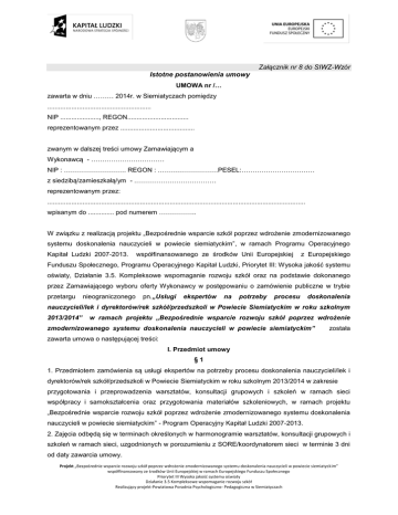 Załącznik nr 8 do SIWZ-Wzór Istotne postanowienia umowy UMOWA nr /… zawarta w dniu ……… 2014r. w Siemiatyczach pomiędzy ........................................................ NIP ....................., REGON................................. reprezentowanym przez ........................................ zwanym w dalszej treści umowy Zamawiającym a Wykonawcą - …………………………… NIP : ………………………. REGON : ………………………PESEL:…………………………… z siedzibą/zamieszkałą/ym - .……………………………… reprezentowanym przez: ........................................................................................................................................... wpisanym do .............. pod numerem …………….. W związku z realizacją projektu „Bezpośrednie wsparcie szkół poprzez wdrożenie zmodernizowanego systemu doskonalenia nauczycieli w powiecie siemiatyckim”, w ramach Programu Operacyjnego Kapitał Ludzki 2007-2013. współfinansowanego ze środków Unii Europejskiej z Europejskiego Funduszu Społecznego, Programu Operacyjnego Kapitał Ludzki, Priorytet III: Wysoka jakość systemu oświaty, Działanie 3.5. Kompleksowe wspomaganie rozwoju szkół oraz na podstawie dokonanego przez Zamawiającego wyboru oferty Wykonawcy w postępowaniu o zamówienie publiczne w trybie przetargu nieograniczonego pn.„Usługi ekspertów na potrzeby procesu doskonalenia nauczycieli/lek i dyrektorów/rek szkół/przedszkoli w Powiecie Siemiatyckim w roku szkolnym 2013/2014” w ramach projektu „Bezpośrednie wsparcie rozwoju szkół poprzez wdrożenie zmodernizowanego systemu doskonalenia nauczycieli w powiecie siemiatyckim” została zawarta umowa o następującej treści: I. Przedmiot umowy §1 1. Przedmiotem zamówienia są usługi ekspertów na potrzeby procesu doskonalenia nauczycieli/lek i dyrektorów/rek szkół/przedszkoli w Powiecie Siemiatyckim w roku szkolnym 2013/2014 w zakresie przygotowania i przeprowadzenia warsztatów, konsultacji grupowych i szkoleń w ramach sieci współpracy i samokształcenia oraz przygotowania materiałów szkoleniowych, w ramach projektu „Bezpośrednie wsparcie rozwoju szkół poprzez wdrożenie zmodernizowanego systemu doskonalenia nauczycieli w powiecie siemiatyckim” - Program Operacyjny Kapitał Ludzki 2007-2013. 2. Zajęcia odbędą się w terminach określonych w harmonogramie warsztatów, konsultacji grupowych i szkoleń w ramach sieci, uzgodnionych w porozumieniu z SORE/koordynatorem sieci w terminie 3 dni od daty zawarcia umowy. Projekt „Bezpośrednie wsparcie rozwoju szkół poprzez wdrożenie zmodernizowanego systemu doskonalenia nauczycieli w powiecie siemiatyckim” współfinansowany ze środków Unii Europejskiej w ramach Europejskiego Funduszu Społecznego Priorytet III Wysoka jakość systemu oświaty Działanie 3.5 Kompleksowe wspomaganie rozwoju szkół Realizujący projekt-Powiatowa Poradnia Psychologiczno- Pedagogiczna w Siemiatyczach 3. W terminie 3 dni przed rozpoczęciem zajęć w szkole/przedszkolu Wykonawca przekaże Zamawiającemu szczegółowy program spotkań zgodnie z zakresem opisanym w Załączniku nr 1 do SIWZ oraz komplet materiałów szkoleniowych przygotowanych dla uczestników warsztatów/konsultacji grupowych/szkoleń w ramach sieci. 3. Szczegółowe warunki przeprowadzenia szkolenia określa Specyfikacja Istotnych Warunków Zamówienia oraz załącznik nr 1 do SIWZ (Szczegółowy opis przedmiotu zamówienia). 4. Oferta Wykonawcy, Specyfikacja Istotnych Warunków Zamówienia oraz Załącznik nr 1 do SIWZ stanowią integralną cześć umowy. 5. Wykonawca oświadcza, iż posiada uprawnienia oraz odpowiednie kwalifikacje i warunki do należytego wykonania zamówienia. 6. Warsztaty, konsultacje grupowe i szkolenia z ramach sieci będzie prowadziła osoba wykazana w ofercie. W sytuacji wystąpienia okoliczności uniemożliwiających przeprowadzenie zajęć przez osobę, o której mowa zdaniu 1, Wykonawca za zgodą Zamawiającego wskaże inną osobę do ich prowadzenia. Warunkiem uzyskania zgody Zamawiającego jest złożenie pisemnego wniosku oraz załączenie dokumentu potwierdzającego, że wskazana osoba spełnia co najmniej wymagania określone w rozdziale VI SIWZ. 7. W terminie do 5 dni po zakończeniu warsztatów/konsultacji grupowych/szkoleń Wykonawca przekaże Zamawiającemu dziennik zajęć oraz komplet materiałów szkoleniowych przekazanych uczestnikom szkolenia. §2 Zamawiający zastrzega sobie prawo do kontroli przeprowadzanych warsztatów, konsultacji grupowych i szkoleń z ekspertem w ramach sieci współpracy i samokształcenia a także do wykonywania zdjęć. II. Terminy wykonania przedmiotu umowy §3 1. Termin realizacji zamówienia: do 31 maja 2014 roku. III. Wynagrodzenie Wykonawcy i rozliczenie finansowe §4 1. Zamawiający, niniejszą umową zobowiązuje się wobec Wykonawcy do zapłaty umownego wynagrodzenia za wykonanie przedmiotu umowy, zgodnie z wybraną ofertą przetargową w wysokości: ……………… zł (słownie złotych: …………………… brutto). 2. Przez kwotę wynagrodzenia Wykonawcy brutto należy rozumieć kwotę obejmującą wszystkie składniki wynagrodzenia Wykonawcy. Zamawiający zastrzega sobie prawo do potrącenia z wynagrodzenia podatków i składek których wysokość wynika z odrębnych przepisów. 3. Wynagrodzenie umowne określone w ust. 1 ma charakter ryczałtowy i obejmuje wszystkie koszty związane z wykonaniem przedmiotu umowy. Kwota, o której mowa w ust. 1 zaspokaja wszelkie roszczenia Wykonawcy wobec Zamawiającego z tytułu wykonania umowy i obejmuje wszelkie koszty związane z jej realizacją. Projekt „Bezpośrednie wsparcie rozwoju szkół poprzez wdrożenie zmodernizowanego systemu doskonalenia nauczycieli w powiecie siemiatyckim” współfinansowany ze środków Unii Europejskiej w ramach Europejskiego Funduszu Społecznego Priorytet III Wysoka jakość 