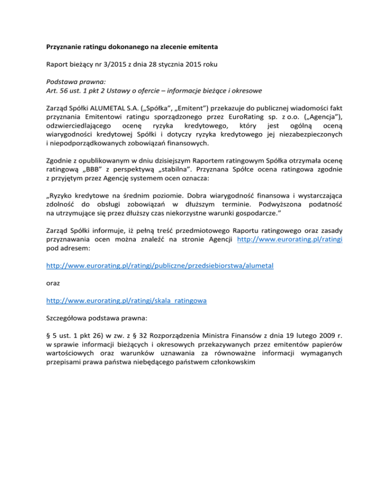 Przyznanie ratingu dokonanego na zlecenie emitenta Raport bieżący nr 3/2015 z dnia 28 stycznia 2015 roku Podstawa prawna: Art. 56 ust. 1 pkt 2 Ustawy o ofercie – informacje bieżące i okresowe Zarząd Spółki ALUMETAL S.A. („Spółka”, „Emitent”) przekazuje do publicznej wiadomości fakt przyznania Emitentowi ratingu sporządzonego przez EuroRating sp. z o.o. („Agencja”), odzwierciedlającego ocenę ryzyka kredytowego, który jest ogólną oceną wiarygodności kredytowej Spółki i dotyczy ryzyka kredytowego jej niezabezpieczonych i niepodporządkowanych zobowiązań finansowych. Zgodnie z opublikowanym w dniu dzisiejszym Raportem ratingowym Spółka otrzymała ocenę ratingową „BBB” z perspektywą „stabilna”. Przyznana Spółce ocena ratingowa zgodnie z przyjętym przez Agencję systemem ocen oznacza: „Ryzyko kredytowe na średnim poziomie. Dobra wiarygodność finansowa i wystarczająca zdolność do obsługi zobowiązań w dłuższym terminie. Podwyższona podatność na utrzymujące się przez dłuższy czas niekorzystne warunki gospodarcze.” Zarząd Spółki informuje, iż pełną treść przedmiotowego Raportu ratingowego oraz zasady przyznawania ocen można znaleźć na stronie Agencji http://www.eurorating.pl/ratingi pod adresem: http://www.eurorating.pl/ratingi/publiczne/przedsiebiorstwa/alumetal oraz http://www.eurorating.pl/ratingi/skala_ratingowa Szczegółowa podstawa prawna: § 5 ust. 1 pkt 26) w zw. z § 32 Rozporządzenia Ministra Finansów z dnia 19 lutego 2009 r. w sprawie informacji bieżących i okresowych przekazywanych przez emitentów papierów wartościowych oraz warunków uznawania za równoważne informacji wymaganych przepisami prawa państwa niebędącego państwem członkowskim
