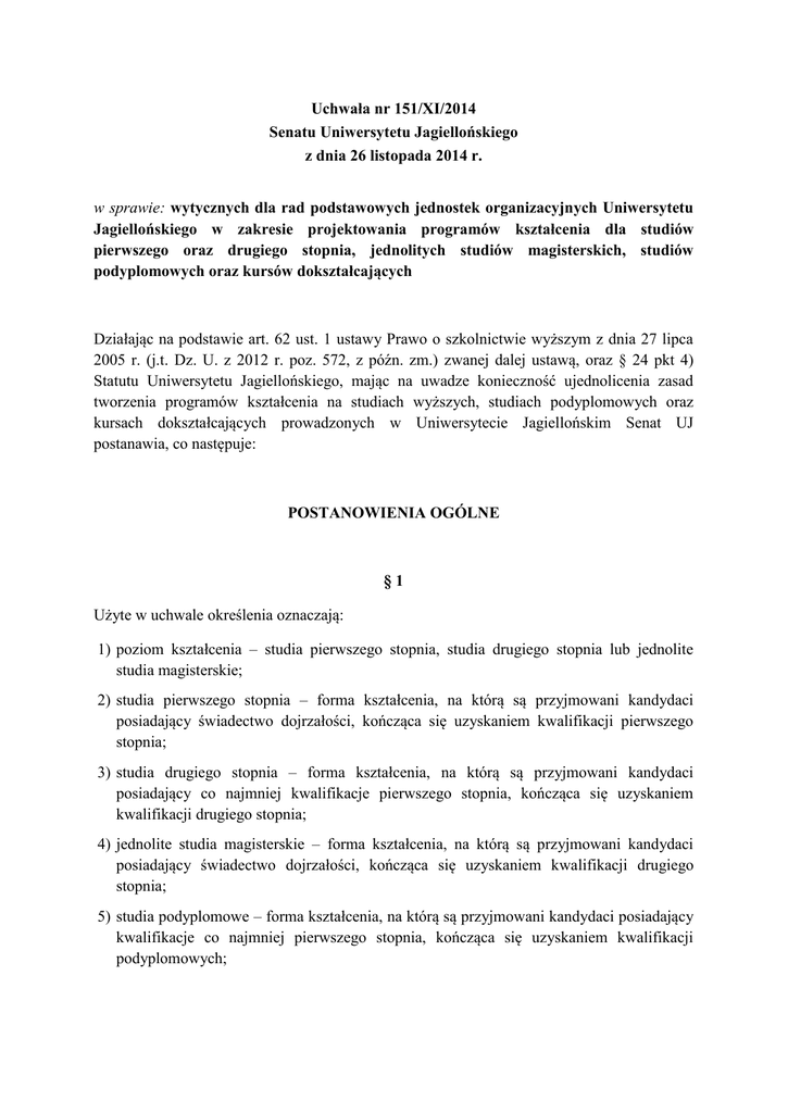 Uchwała nr 151/XI/2014 Senatu Uniwersytetu Jagiellońskiego z dnia 26 listopada 2014 r. w sprawie: wytycznych dla rad podstawowych jednostek organizacyjnych Uniwersytetu Jagiellońskiego w zakresie projektowania programów kształcenia dla studiów pierwszego oraz drugiego stopnia, jednolitych studiów magisterskich, studiów podyplomowych oraz kursów dokształcających Działając na podstawie art. 62 ust. 1 ustawy Prawo o szkolnictwie wyższym z dnia 27 lipca 2005 r. (j.t. Dz. U. z 2012 r. poz. 572, z późn. zm.) zwanej dalej ustawą, oraz § 24 pkt 4) Statutu Uniwersytetu Jagiellońskiego, mając na uwadze konieczność ujednolicenia zasad tworzenia programów kształcenia na studiach wyższych, studiach podyplomowych oraz kursach dokształcających prowadzonych w Uniwersytecie Jagiellońskim Senat UJ postanawia, co następuje: POSTANOWIENIA OGÓLNE §1 Użyte w uchwale określenia oznaczają: 1) poziom kształcenia – studia pierwszego stopnia, studia drugiego stopnia lub jednolite studia magisterskie; 2) studia pierwszego stopnia – forma kształcenia, na którą są przyjmowani kandydaci posiadający świadectwo dojrzałości, kończąca się uzyskaniem kwalifikacji pierwszego stopnia; 3) studia drugiego stopnia – forma kształcenia, na którą są przyjmowani kandydaci posiadający co najmniej kwalifikacje pierwszego stopnia, kończąca się uzyskaniem kwalifikacji drugiego stopnia; 4) jednolite studia magisterskie – forma kształcenia, na którą są przyjmowani kandydaci posiadający świadectwo dojrzałości, kończąca się uzyskaniem kwalifikacji drugiego stopnia; 5) studia podyplomowe – forma kształcenia, na którą są przyjmowani kandydaci posiadający kwalifikacje co najmniej pierwszego stopnia, kończąca się uzyskaniem kwalifikacji podyplomowych; 6) kurs dokształcający – krótka forma kształcenia, której ukończenie umożliwia uzyskanie lub uzupełnienie wiedzy, uzyskanie lub rozwinięcie umiejętności lub kompetencji społecznych, niezbędnych na rynku pracy w systemie uczenia się przez całe życie; 7) kwalifikacje pierwszego stopnia – efekt kształcenia na studiach pierwszego stopnia, zakończonych uzyskaniem tytułu zawodowego licencjata, inżyniera lub równorzędnego określonego kierunku studiów i profilu kształcenia, potwierdzony odpowiednim dyplomem; 8) kwalifikacje drugiego stopnia – efekt kształcenia na studiach drugiego stopnia, zakończonych uzyskaniem tytułu zawodowego magistra, magistra inżyniera lub równorzędnego określonego kierunku studiów i profilu kształcenia, potwierdzony odpowiednim dyplomem; 9) kwalifikacje podyplomowe – osiągnięcie zakładanych efektów kształcenia na studiach podyplomowych, potwierdzone świadectwem; 10) profil kształcenia – profil praktyczny lub profil ogólnoakademicki; 11) profil praktyczny – profil programu kształcenia obejmującego moduły zajęć służące zdobywaniu przez studenta umiejętności praktycznych i kompetencji społecznych, realizowany przy założeniu, że ponad połowa programu studiów określonego w punktach ECTS obejmuje zajęcia praktyczne kształtujące te umiejętności i kompetencje, w tym umiejętności uzyskiwane na zajęciach warsztatowych, które są prowadzone przez osoby posiadające doświadczenie zawodowe zdobyte poza uczelnią; 12) profil ogólnoakademicki – profil programu kształcenia obejmującego moduły zajęć powiązane z prowadzonymi w uczelni badaniami naukowymi, realizowany przy założeniu, że ponad połowa programu studiów określonego w punktach ECTS obejmuje zajęcia służące zdobywaniu przez studenta pogłębionej wiedzy; 13) zajęcia dydaktyczne wymagające bezpośredniego udziału studentów i nauczycieli akademickich – zajęcia odbywane przy jednoczesnej obecności prowadzącego oraz studentów. §2 1. Studia pierwszego stopnia, studia drugiego stopnia oraz jednolite studia magisterskie na Uniwersytecie Jagiellońskim są prowadzone w ramach kierunku studiów. 2. Kierunek studiów może być prowadzony przez podstawową jednostkę organizacyjną albo łącznie przez kilka takich jednostek. 3. Kierunek studiów jest realizowany w sposób określony przez program kształcenia. 4. Podstawowa jednostka organizacyjna posiadająca uprawnienie do nadawania stopnia naukowego doktora habilitowanego może prowadzić studia na uchwalonym przez Senat Uniwersytetu Jagiellońskiego kierunku studiów o określonym poziomie i profilu kształcenia w ramach obszarów kształcenia oraz dziedzin odpowiadających uprawnieniom tej jednostki do nadawania stopnia naukowego doktora habilitowanego, przy jednoczesnym spełnieniu wymogów dotyczących minimum kadrowego dla danego kierunku studiów określonych odrębnymi przepisami. Uchwała Senatu określa efekty kształcenia, do których są dostosowane programy studiów, w tym plany studiów odpowiednio do poziomu i profilu kształcenia. W przypadku kierunków studiów wymienionych w art. 9b ustawy, uchwała Senatu uwzględnia standardy kształcenia określone dla tych kierunków. 5. Podstawowa jednostka organizacyjna nieposiadająca uprawnienia do nadawania stopnia naukowego doktora habilitowanego w obszarze kształcenia i dziedzinie, do których jest przyporządkowany kierunek studiów, spełniająca wymogi dotyczące minimum kadrowego dla danego kierunku studiów określone odrębnymi przepisami, która: 1) posiada uprawnienie do nadawania stopnia naukowego doktora w obszarze kształcenia i dziedzinie, do których jest przyporządkowany kierunek studiów – może uzyskać uprawnienie do prowadzenia, zgodnie z opisem efektów kształcenia określonym przez Senat Uczelni: a) studiów o profilu praktycznym na tym kierunku i określonym poziomie kształcenia, b) studiów o profilu ogólnoakademickim na tym kierunku i określonym poziomie kształcenia. 2) nie posiada uprawnienia do nadawania stopnia naukowego doktora w obszarze kształcenia i dziedzinie, do których jest przyporządkowany kierune