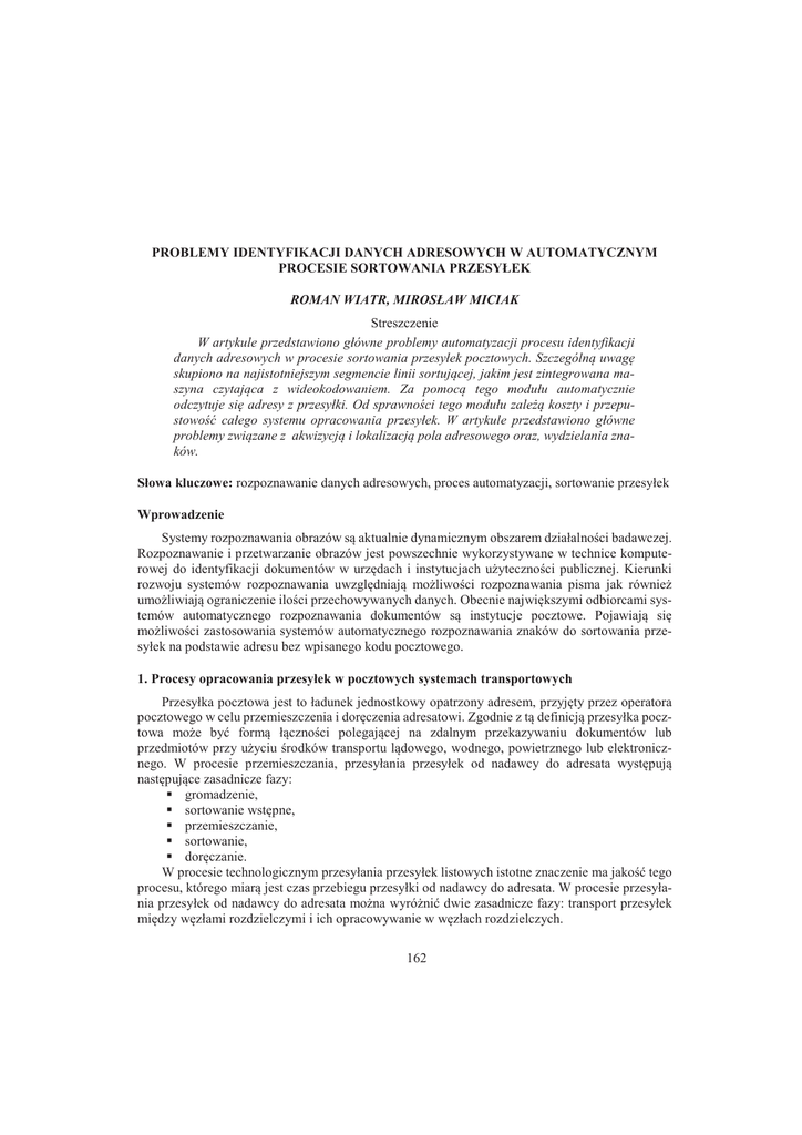 PROBLEMY IDENTYFIKACJI DANYCH ADRESOWYCH W AUTOMATYCZNYM PROCESIE SORTOWANIA PRZESYŁEK ROMAN WIATR, MIROSŁAW MICIAK Streszczenie W artykule przedstawiono główne problemy automatyzacji procesu identyfikacji danych adresowych w procesie sortowania przesyłek pocztowych. Szczególn uwag skupiono na najistotniejszym segmencie linii sortujcej, jakim jest zintegrowana maszyna czytajca z wideokodowaniem. Za pomoc tego modułu automatycznie odczytuje si adresy z przesyłki. Od sprawnoci tego modułu zale koszty i przepustowo całego systemu opracowania przesyłek. W artykule przedstawiono główne problemy zwizane z akwizycj i lokalizacj pola adresowego oraz, wydzielania znaków. Słowa kluczowe: rozpoznawanie danych adresowych, proces automatyzacji, sortowanie przesyłek Wprowadzenie Systemy rozpoznawania obrazów są aktualnie dynamicznym obszarem działalnoĞci badawczej. Rozpoznawanie i przetwarzanie obrazów jest powszechnie wykorzystywane w technice komputerowej do identyfikacji dokumentów w urzĊdach i instytucjach uĪytecznoĞci publicznej. Kierunki rozwoju systemów rozpoznawania uwzglĊdniają moĪliwoĞci rozpoznawania pisma jak równieĪ umoĪliwiają ograniczenie iloĞci przechowywanych danych. Obecnie najwiĊkszymi odbiorcami systemów automatycznego rozpoznawania dokumentów są instytucje pocztowe. Pojawiają siĊ moĪliwoĞci zastosowania systemów automatycznego rozpoznawania znaków do sortowania przesyłek na podstawie adresu bez wpisanego kodu pocztowego. 1. Procesy opracowania przesyłek w pocztowych systemach transportowych Przesyłka pocztowa jest to ładunek jednostkowy opatrzony adresem, przyjĊty przez operatora pocztowego w celu przemieszczenia i dorĊczenia adresatowi. Zgodnie z tą definicją przesyłka pocztowa moĪe byü formą łącznoĞci polegającej na zdalnym przekazywaniu dokumentów lub przedmiotów przy uĪyciu Ğrodków transportu lądowego, wodnego, powietrznego lub elektronicznego. W procesie przemieszczania, przesyłania przesyłek od nadawcy do adresata wystĊpują nastĊpujące zasadnicze fazy: gromadzenie, sortowanie wstĊpne, przemieszczanie, sortowanie, dorĊczanie. W procesie technologicznym przesyłania przesyłek listowych istotne znaczenie ma jakoĞü tego procesu, którego miarą jest czas przebiegu przesyłki od nadawcy do adresata. W procesie przesyłania przesyłek od nadawcy do adresata moĪna wyróĪniü dwie zasadnicze fazy: transport przesyłek miĊdzy wĊzłami rozdzielczymi i ich opracowywanie w wĊzłach rozdzielczych. 162 Studies & Proceedings of Polish Association for Knowledge Management Nr 80, 2016 W całym procesie pocztowym [13,19] wiodącą rolĊ pełnią WĊzły Ekspedycyjno – Rozdzielcze (WER), poniewaĪ opracowują one wiĊkszoĞü przepływających w systemie pocztowym przesyłek. W wĊzłach zbiegają siĊ strumienie przesyłek pochodzących niemalĪe ze wszystkich kierunków w kraju. W momencie dopływu ładunków do WER są one rejestrowane w systemie teleinformatycznym. Dokonuje siĊ tego na stanowiskach recepcyjnych, przy uĪyciu kodów kreskowych, które umieszczane są na opakowaniach zbiorczych, a takĪe na niektórych rodzajach przesyłek. DziĊki temu fizycznemu strumieniowi ładunków przepływających w sieci logistycznej, generowane są informacje o tych ładunkach, a takĪe o ich zawartoĞci, co stanowi jednoczeĞnie podstawĊ dla funkcjonowania systemu Ğledzenia przesyłek, a takĪe bazĊ danych dla działaĔ analitycznych, sprawozdawczych i reklamacyjnych [4]. Podstawowe elementy składowe WER to: zintegrowany system teleinformatyczny, kompleksowy system transportu wewnĊtrznego, wielofunkcyjne maszyny sortownicze do rozdziału listów o rozmiarach standardowych (ekonomicznych, priorytetowych, ekonomicznych i in.), listów niestandardowych, paczek, urządzenia wspomagające proces pocztowy jak system komunikacji i lokalizacji Ğrodków transportu, system Ğledzenia przesyłek [13]. Ze wzglĊdu na pracochłonnoĞü procesu, terminy czasowe dostarczania przesyłek najwiĊcej uwagi wymaga proces sortowania przesyłek listowych w WER-ach. Maszyny do automatycznego sortowania przesyłek listowych są ustawione jako niezaleĪne segmenty: maszyna rozdzielająca i licująco – stemplująca CFC, zintegrowana maszyna czytająca z wideokodowaniem IRV, maszyna do rozdziału szczegółowego FSM, maszyna do rozdziału przesyłek typu flat FSS. 2. Rozdział przesyłek listowych w Wzłach Ekspedycyjno – Rozdzielczych (WER) Mechanizacja i automatyzacja procesów technologicznych to Ğrodki, jakie wiele administracji pocztowych na Ğwiecie z powodzeniem zastosowało w celu ułatwienia pracy, a przede wszystkim dla zapewnienia terminowoĞci przebiegu przesyłek. Poczta Polska proces ten rozpoczĊła w 1992r. Do chwili obecnej automatyczne rozdzielnie listowe pracują w nastĊpujących wĊzłach: Warszawa, Katowice, PoznaĔ, Kraków oraz ŁódĨ. Wszystkie te wĊzły są wyposaĪone w maszyny dostarczane przez niemiecką firmĊ Siemens Electrocom z wyjątkiem wĊzła w Warszawie, który wyposaĪono w liniĊ do rozdziału przesyłek listowych firmy japoĔskiej Nippon Electric Company (NEC). Proces opracowywania listów w WER-ach moĪna podzieliü na dwa etapy. W pierwszym nastĊpuje wstĊpna selekcja na przesyłki standardowe nadające siĊ do sortowania maszynowego oraz przesyłki o nietypowych kształtach i rozmiarach przeznaczonych do opracowania rĊcznego. W dalszej kolejnoĞci w maszynie czytającej z wideokodowaniem IRV, system za pomocą modułu optycznego rozpoznawania znaków OCR (ang. OCR – Optical Character Recognition) automatycznie odczytuje adres. Rząd poziomych, pomaraĔczowych kresek w dolnej czĊĞci listu lub pocztówki to efekt odczytania kodu pocztowego i nazwy miejscowoĞci. Nanosi je, po elektronicznym przetworzeniu, drukarka natryskowa. Nadrukowany kod kreskowy posłuĪy nastĊpnym modułom LSM (ang. Letter Sorting Machine) i FSM (ang. Flat Sorting Machine) do koĔcowego (szczegółowego) r