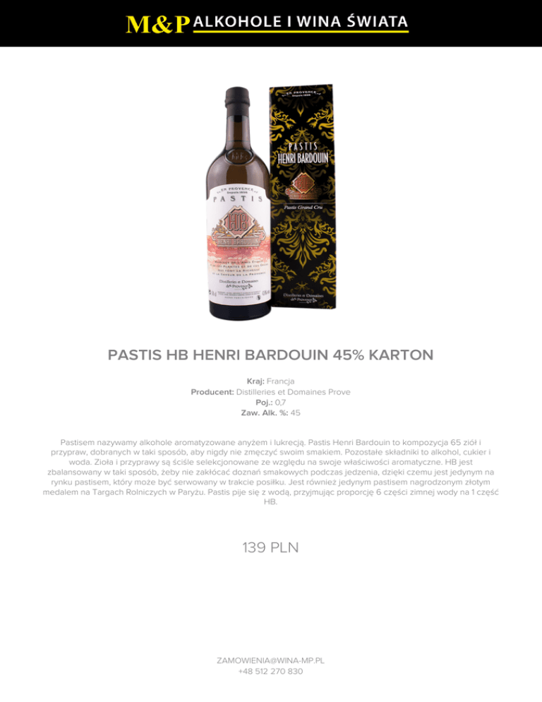 PASTIS HB HENRI BARDOUIN 45% KARTON Kraj: Francja Producent: Distilleries et Domaines Prove Poj.: 0,7 Zaw. Alk. %: 45 Pastisem nazywamy alkohole aromatyzowane anyżem i lukrecją. Pastis Henri Bardouin to kompozycja 65 ziół i przypraw, dobranych w taki sposób, aby nigdy nie zmęczyć swoim smakiem. Pozostałe składniki to alkohol, cukier i woda. Zioła i przyprawy są ściśle selekcjonowane ze względu na swoje właściwości aromatyczne. HB jest zbalansowany w taki sposób, żeby nie zakłócać doznań smakowych podczas jedzenia, dzięki czemu jest jedynym na rynku pastisem, który może być serwowany w trakcie posiłku. Jest również jedynym pastisem nagrodzonym złotym medalem na Targach Rolniczych w Paryżu. Pastis pije się z wodą, przyjmując proporcję 6 części zimnej wody na 1 część HB. 139 PLN [email protected] +48 512 270 830