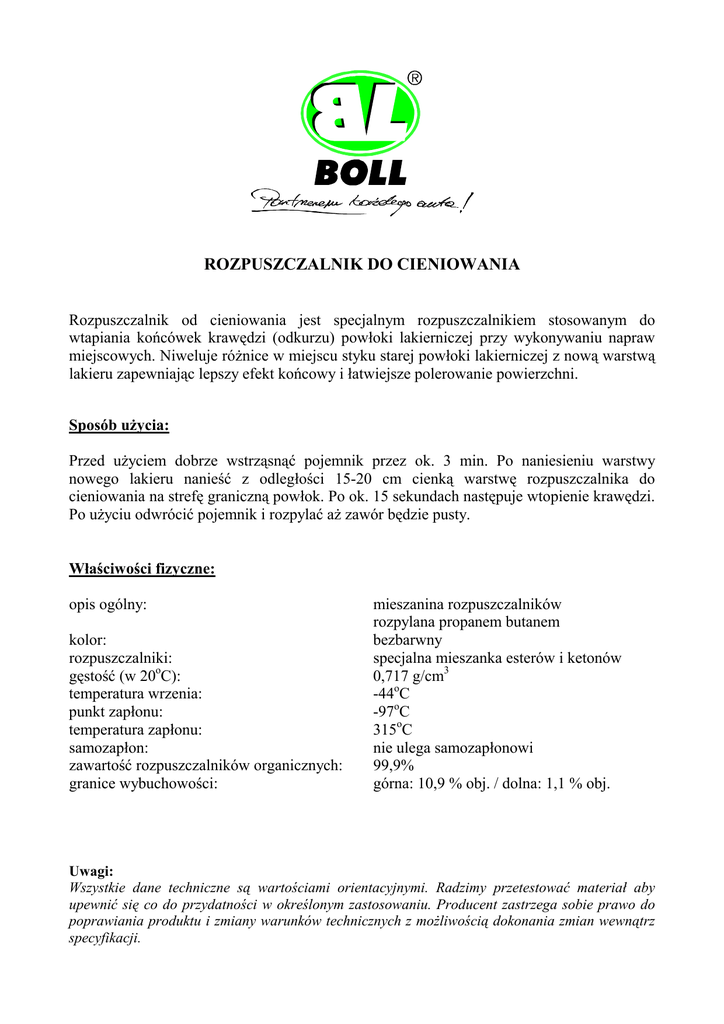 ROZPUSZCZALNIK DO CIENIOWANIA Rozpuszczalnik od cieniowania jest specjalnym rozpuszczalnikiem stosowanym do wtapiania końcówek krawędzi (odkurzu) powłoki lakierniczej przy wykonywaniu napraw miejscowych. Niweluje różnice w miejscu styku starej powłoki lakierniczej z nową warstwą lakieru zapewniając lepszy efekt końcowy i łatwiejsze polerowanie powierzchni. Sposób użycia: Przed użyciem dobrze wstrząsnąć pojemnik przez ok. 3 min. Po naniesieniu warstwy nowego lakieru nanieść z odległości 15-20 cm cienką warstwę rozpuszczalnika do cieniowania na strefę graniczną powłok. Po ok. 15 sekundach następuje wtopienie krawędzi. Po użyciu odwrócić pojemnik i rozpylać aż zawór będzie pusty. Właściwości fizyczne: opis ogólny: kolor: rozpuszczalniki: gęstość (w 20oC): temperatura wrzenia: punkt zapłonu: temperatura zapłonu: samozapłon: zawartość rozpuszczalników organicznych: granice wybuchowości: mieszanina rozpuszczalników rozpylana propanem butanem bezbarwny specjalna mieszanka esterów i ketonów 0,717 g/cm3 -44oC -97oC 315oC nie ulega samozapłonowi 99,9% górna: 10,9 % obj. / dolna: 1,1 % obj. Uwagi: Wszystkie dane techniczne są wartościami orientacyjnymi. Radzimy przetestować materiał aby upewnić się co do przydatności w określonym zastosowaniu. Producent zastrzega sobie prawo do poprawiania produktu i zmiany warunków technicznych z możliwością dokonania zmian wewnątrz specyfikacji.