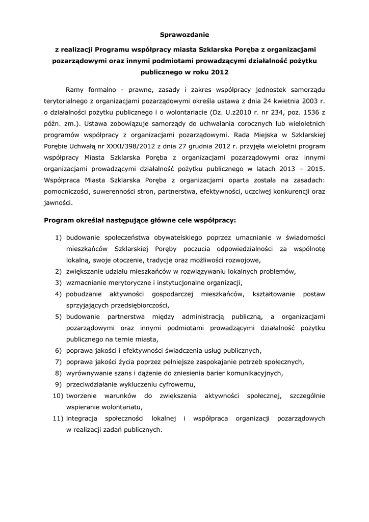 Sprawozdanie z realizacji Programu współpracy miasta Szklarska Poręba z organizacjami pozarządowymi oraz innymi podmiotami prowadzącymi działalność pożytku publicznego w roku 2012 Ramy formalno - prawne, zasady i zakres współpracy jednostek samorządu terytorialnego z organizacjami pozarządowymi określa ustawa z dnia 24 kwietnia 2003 r. o działalności pożytku publicznego i o wolontariacie (Dz. U.z2010 r. nr 234, poz. 1536 z późn. zm.). Ustawa zobowiązuje samorządy do uchwalania corocznych lub wieloletnich programów współpracy z organizacjami pozarządowymi. Rada Miejska w Szklarskiej Porębie Uchwałą nr XXXI/398/2012 z dnia 27 grudnia 2012 r. przyjęła wieloletni program współpracy Miasta Szklarska Poręba z organizacjami pozarządowymi oraz innymi organizacjami prowadzącymi działalność pożytku publicznego w latach 2013 – 2015. Współpraca Miasta Szklarska Poręba z organizacjami oparta została na zasadach: pomocniczości, suwerenności stron, partnerstwa, efektywności, uczciwej konkurencji oraz jawności. Program określał następujące główne cele współpracy: 1) budowanie społeczeństwa obywatelskiego poprzez umacnianie w świadomości mieszkańców Szklarskiej Poręby poczucia odpowiedzialności za wspólnotę lokalną, swoje otoczenie, tradycje oraz możliwości rozwojowe, 2) zwiększanie udziału mieszkańców w rozwiązywaniu lokalnych problemów, 3) wzmacnianie merytoryczne i instytucjonalne organizacji, 4) pobudzanie aktywności gospodarczej mieszkańców, kształtowanie postaw sprzyjających przedsiębiorczości, 5) budowanie partnerstwa między administracją publiczną, a organizacjami pozarządowymi oraz innymi podmiotami prowadzącymi działalność pożytku publicznego na ternie miasta, 6) poprawa jakości i efektywności świadczenia usług publicznych, 7) poprawa jakości życia poprzez pełniejsze zaspokajanie potrzeb społecznych, 8) wyrównywanie szans i dążenie do zniesienia barier komunikacyjnych, 9) przeciwdziałanie wykluczeniu cyfrowemu, 10) tworzenie warunków do zwiększenia aktywności społecznej, szczególnie wspieranie wolontariatu, 11) integracja społeczności lokalnej w realizacji zadań publicznych. i współpraca organizacji pozarządowych W 2012 r. współpraca miasta z podmiotami pożytku publicznego miała charakter finansowy oraz pozafinansowy. Biorąc pod uwagę możliwości finansowe miasta, cele szczegółowe programu oraz wyniki konsultacji z organizacjami, w roku 2012 na realizację zadań publicznych miasto przeznaczyło 70 000 zł. Zgodnie z wymogami ustawy wyłonienie podmiotów na realizację zadań publicznych miało charakter jawny, nastąpiło w trybie konkursowym. W 2012 r. przeprowadzono jeden otwarty konkurs jawny. Wszystkie działania tj. konsultacje, uchwały, konkursy i wyniki publikowane były na stronie internetowej miasta www.szklarskaporeba.bip.net.pl w zakładce Pożytek Publiczny rok 2012. Z udziałem środków publicznych podmioty pozarządowe realizowały w 2012 roku następujące zadania w zakresie: 1. Pomocy społecznej, w tym pomocy rodzinom i osobom w trudnej sytuacji życiowej oraz wyrównania szans tych rodzin i osób: Polski Komitet Pomocy Społecznej Stowarzyszenie Charytatywne Zarząd Miejski w Szklarskiej Porębie zorganizował następujące zadania: - organizacja ogólnodostępnego Śniadania Wielkanocnego oraz uroczystej wieczerzy Wigilijnej dla osób samotnych, starszych i chorych z terenu miasta w ramach organizacja ogólnodostępnych spotkań dla osób samotnych, starszych, chorych z terenu miasta - Dzień Seniora ze szczególnym uwzględnieniem 80 – Latków w ramach wspieranie działań na rzecz integracji społecznej i przeciwdziałaniu marginalizacji oraz wykluczeniu społecznemu. 2. Kultury, sztuki, ochrony dóbr kultury i tradycji oraz działalności wspomagającej rozwój wspólnoty i społeczności lokalnej: 1) Stowarzyszenie PUCH OSTU zorganizowało imprezę plenerową „Dotykanie sztuki – idąc i stojąc”. Głównym celem zadania było promowanie zdrowego spędzania czasu, promowanie młodzieży uzdolnionej artystycznie, budowanie aktywnej społeczności lokalnej, nawiązanie współpracy z Panią Ireną Gołąb oraz karkonoskim parkiem Narodowym, promowanie i kultywowanie pamięci o artystach i twórcach regionalnych. 2) Stowarzyszenie „Towarzystwo Izerskie” zorganizowało Szklarską Majówkę w Szklarskiej Porębie – próba ocalenia wspomnień – festyn hutnictwa szkła dla mieszkańców Szklarskiej Poręby ze szczególnym uwzględnieniem przedstawicieli społeczności Osiedla Huty. Organizacja festynu przyczyniła się do zintensyfikowania aktywizacji i integracji miejscowej społeczności poprzez jej udział w realizacji projektu oraz do propagowania tradycji wyrobu produktów kryształowych wśród dzieci i młodzieży. 3. Wspierania, upowszechniania i rozwoju kultury fizycznej i sportu: Stowarzyszenie Cyklistów Szklarska Poręba na Dwóch Kółkach zorganizowało zawody z cyklu Sudeckiej Młodzieżowej Ligi Sportowej edycja lato 2012. Celem głównym organizacji zawodów było upowszechnienia wśród dzieci i młodzieży aktywnych form spędzania wolnego czasu oraz propagowanie zasad uczciwej rywalizacji poprzez udział w zawodach rowerowych. Zadania z udziałem środków publicznych realizowały ponadto kluby sportowe: UKS Kamieńczyk oraz MLKS WOSKAR. Kluby sportowe przygotowały grupy młodzieży do zawodów sportowych, przeprowadziły zawody w różnych dyscyplinach sportowychupowszechniając narciarstwo biegowe, biathlon, piłkę nożną. Efekty tych działań przyczyniły się do rozwoju zainteresowań młodzieży, rozwijania uzdolnień i talentów, organizacji czasu wolnego. Udział młodzieży w zawodach sportowych rangi wojewódzkiej, krajowej i międzynarodowej przyczyniła się do promocji miasta Szklarska Poręba. 4. Nauki, edukacji, oświaty i wychowania: Ochotnicza Straż Pożarna zorganizowała cykl spotkań edukacyjnyc
