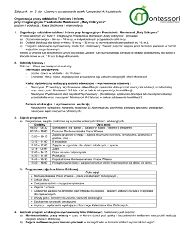 Załącznik nr 2 do Umowy o sprawowanie opieki i propedeutyki kształcenia Organizacja pracy oddziałów Toddlers i Infants przy integracyjnym Przedszkolu Montessori „Mały Odkrywca” poziom i edukacja : klasa żłobkowa i niemowlęca 1. Organizacja oddziałów toddlers i infants przy Integracyjnym Przedszkolu Montessori „Mały Odkrywca” W roku szkolnym 2016/2017 Integracyjne Przedszkole Montessori „Mały Odkrywca” prowadzi: a) Odział niemowlęcy – 8m-cy – 18 m-cy, w indywidualnych przypadkach od 6 m-cy. b) Oddział żłobkowy dla dzieci w wieku 18 m-cy – 36 m-cy, w indywidualnych przypadkach od 16. m.ż. c) Program edukacyjno-wychowawczy może być realizowany również poprzez zajęcia poza terenem placówki w formie wyjazdów zorganizowanych. Ilekroć w umowie lub dokumencie używa się pojęcia „żlobek” lub równoważnego oznacza to oddział przedszkolny dla dzieci o których mowa w ust. 1 lit a) i b) tego dokumentu 2. Oddziały klasowy : Oddział : Klasa niemowlęca lub maluchy Informacje podstawowe: Liczba dzieci w oddziale : do 16 dzieci Charakter klasy: klasa anglojęzyczna prowadzona wg. założeń pedagogiki Marii Montessori Kadrę dydaktyczną realizującą zadania edukacyjno – wychowawcze stanowią : Nauczyciel Prowadzący Wychowawca - (Kwalifikacje: opiekunka dziecięca lub nauczyciel edukacji przedszkolnej oraz nauczyciel Montessori 0-3 lata - lub w trakcie zdobywania tych kwalifikacji) Nauczyciel Wychowawca i/lub Asystent Wychowawcy - (Kwalifikacje: opiekunka dziecięca lub nauczyciel edukacji przedszkolne oraz nauczyciel Montessori 0-3 lata lub w trakcie zdobywania kwalifikacji ) Zadania edukacyjne i wychowawcze wspierają : Nauczyciele specjaliści: logopeda, terapeuta SI, fizjoterapeuta, psycholog, pedagog specjalny, pedagodzy, nauczyciel zajęć muzyczno-rytmicznych ; 3. Zajęcia programowe a) Programowe zajęcia rozłożone są w poniżej opisanych blokach edukacyjnych. Godziny Opis zajęć 08:00 – 08:30 Schodzenie się dzieci / Zajęcia w klasie / dbanie o otoczenie 08:30 – 10:00 Poranna Montessoriańska Praca Własna Zajęcia grupowe w kręgu – zajęcia muzyczno-ruchowe, tematyczne, spotkania z 10:00 – 10:15 gośćmi, inne ... 10:15 – 11:00 II śniadanie 11:00 – 12:00 Zajęcia w ogrodzie dla dzieci młodszych / spacer 12:15 –12:45 Zupa 12:45 – 14:15 Czas na sen / odpoczynek 14:30 – 14:45 Przekąska 14:45 – 15:30 Popołudniowa Montessoriańska Praca Własna 15:30 – 16:00 Porządkowanie klasy / zajęcia kończące dzień /rozchodzenie się dzieci do domu b) Programowe zajęcia w klasie żłobkowej Opis zajęć Montessoriańska Praca Własna – praca z materiałem rozwojowym , Lekcja ciszy , Ćwiczenia na linii – muzyczno-rytmiczne Zajęcia ruchowe Codzienne zajęcia na zewnątrz, bez względu na pogodę – spacery, zabawy na łące i w ogrodzie dla najmłodszych Wizyty gości, koncerty muzyczne, teatrzyki edukacyjne Edukacyjne wycieczki tematyczne Imprezy i wydarzenia wynikające z Rocznego Kalendarza Klas Żłobkowych , 4. Autorski program edukacyjno-wychowawczy klas żłobkowych, realizowany jest poprzez: a) Montessoriańską pracę własną – czas, w którym dzieci pod opieką i bezpośrednim nadzorem nauczycieli realizują program edukacji żłobkowej. b) Zajęcia realizowane poza terenem placówki w szczególności w formach krótkich wycieczek lub wyjść. 5. Edukacyjny program żłobka obejmuje podstawowe ścieżki edukacyjne Przedmiot Praktyczne życie dnia codziennego, czyli zajęcia i ćwiczenia w zakresie samoobsługi i samodzielności , Kształcenie zmysłów , Edukacja matematyczna , Edukacja językowa – język angielski , Edukacja przyrodnicza , Edukacja muzyczna , Edukacja artystyczna , Edukacja prozdrowotna i ruchowa , 6. Pomoce rozwojowe: W żłobku Montessori dzieci pracują z wykorzystaniem edukacyjnych pomocy rozwojowych, odpowiednich dla wieku rozwojowego grup, poszczególnych treści i programów przedmiotów, do których dzieci mają każde dnia swobodny dostęp. 7. Oferta opieki i realizacji zadań psychologiczno-pedagogicznych, Przeprowadzenie analizy dokumentów dziecka oraz przeprowadzenie diagnozy wstępnej *, ** Zajęcia kompensacyjno-korekcyjne, rewalidacyjne i terapeutyczne, a także wczesnego wspomagania rozwoju *, ** Program zajęć włączających i integracyjnych , Terapię logopedyczną *, ** Terapię integracji sensorycznej i/lub fizjoterapii *, ** * dla dzieci, które posiadają orzeczenie o wczesnym wspomaganiu rozwoju , wg. aneksu do umowy ** dla dzieci, które posiadają orzeczenie o potrzebie kształcenia specjalnego , wg. aneksu do umowy 8. Komunikacja z wychowawcami w sprawach dziecka. Dla rodziców organizowane są : a) obowiązkowe zebranie z kadrą wychowawczą klasy : zebranie organizacyjne – wrzesień 20 b) spotkania fakultatywne indywidualne dyżury wychowawcy w wybrane poniedziałki miesiąca, wg indywidualnych zapisów Rodzice otrzymują: a) wstępną informację opisową o rozwoju, możliwościach i potrzebach dziecka – wrzesień 2016 ‘ b) krótkie cotygodniowe notatki o bieżących potrzebach i aktywności dziecka w klasie żłobkowej , c) podsumowującą informację opisową o postępach rozwojowych i osiągnięciach dziecka – czerwiec 2017 ‘ 9. Wyprawka a) Wyprawka dla dziecka, którą zapewniana przez przedszkole: środki i materiały rozwojowe, instrumenty muzyczne oraz materiały do prac artystycznych , zastawę stołową , zupę , napoje ciepłe, wodę do picia , chusteczki do pielęgnacji , wózki 4-osobowy do transportu dzieci, które nie chodzą na spacery , kamizelkę odblaskową z logo Centrum Edukacji Montessori Wawer, do wyjść poza teren żłobka , b) Wyprawka dla dziecka dostarczana przez rodziców , pieluchy , podpisane ubrania na zmianę , podpisane kosmetyki osobiste , roślinę doniczkową , zdjęcie rodziny dziecka , obuwie na zmianę , pościel do spania (nieprzemakalne podkładka x 2 sztuki, prześcieradło x 2 sztuki, kocyk, ma
